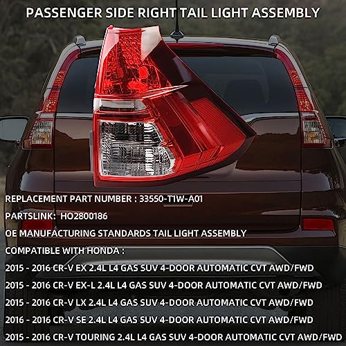 【Fitment】Right Side Tail Light Assembly fits for 2015 - 2016 CR-V EX 2.4L L4 GAS SUV 4-Door Automatic CVT AWD/FWD; 2015 - 2016 CR-V EX-L 2.4L L4 GAS SUV 4-Door Automatic CVT AWD/FWD; 2015 - 2016 CR-V LX 2.4L L4 GAS SUV 4-Door Automatic CVT AWD/FWD; 2016 - 2016 CR-V SE 2.4L L4 GAS SUV 4-Door Automatic CVT AWD/FWD; 2015 - 2016 CR-V Touring 2.4L L4 GAS SUV 4-Door Automatic CVT AWD/FWD