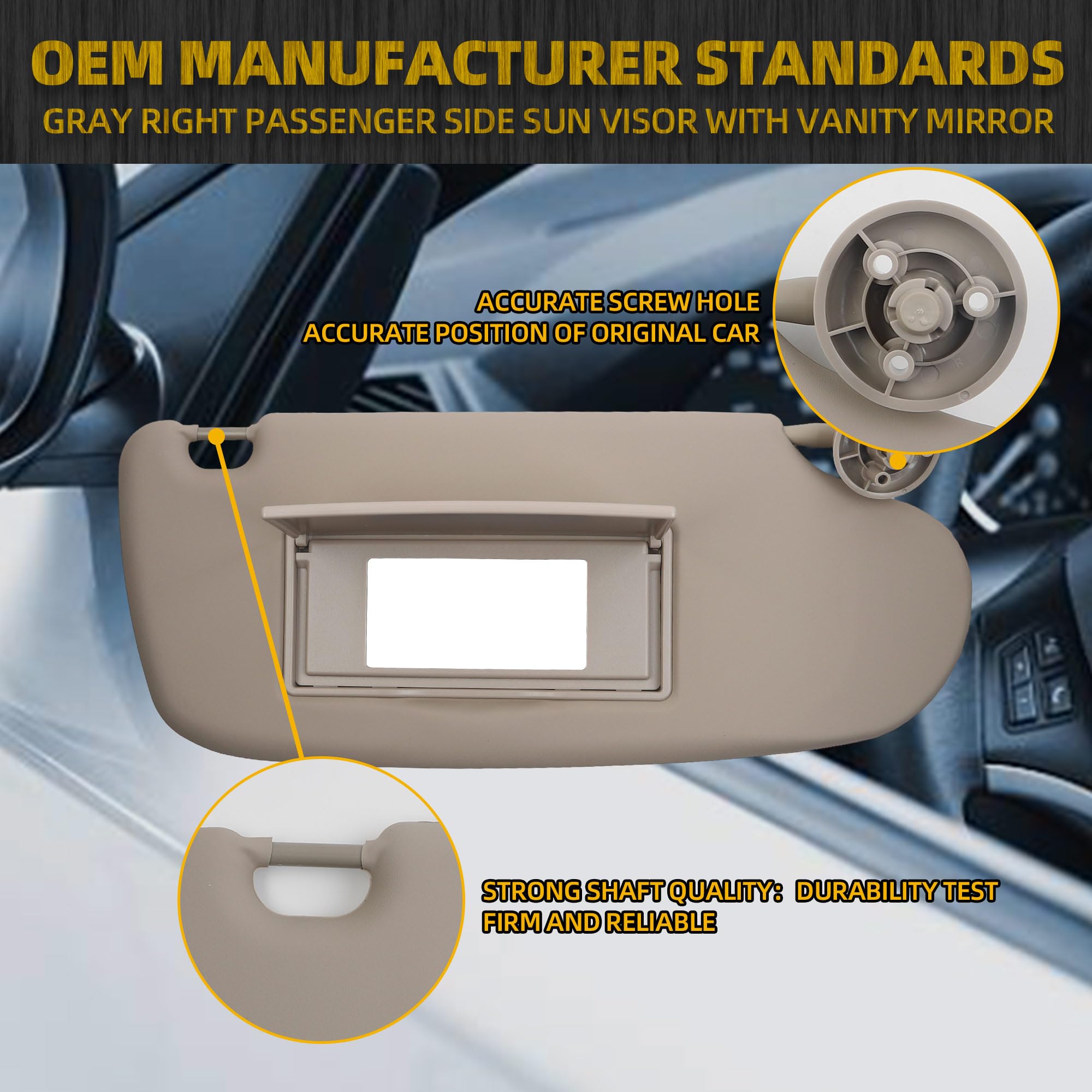 【Description】Right Passenger Side sun visor with mirror. This sun visor comes with a large mirror and has closing and opening functions to meet daily needs.