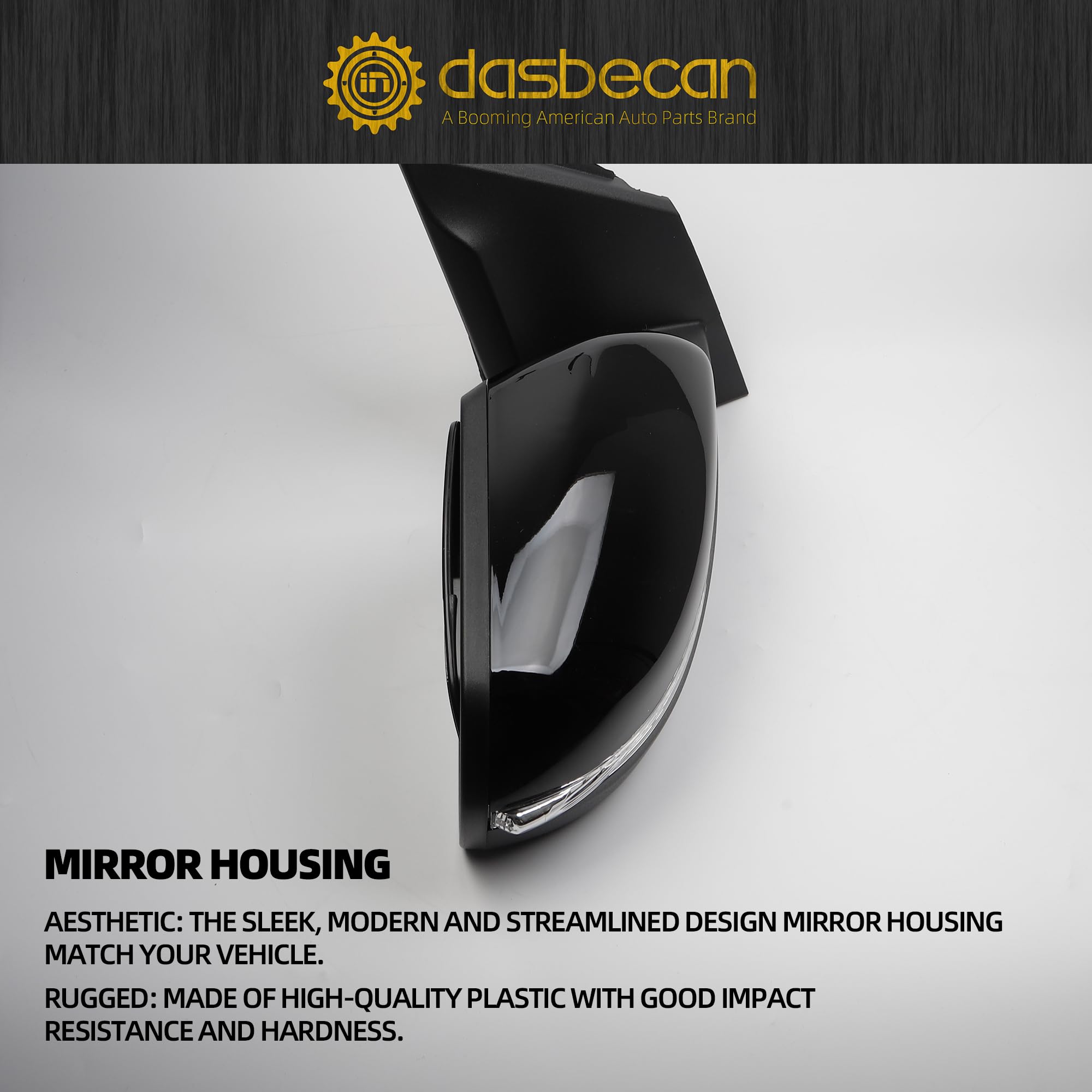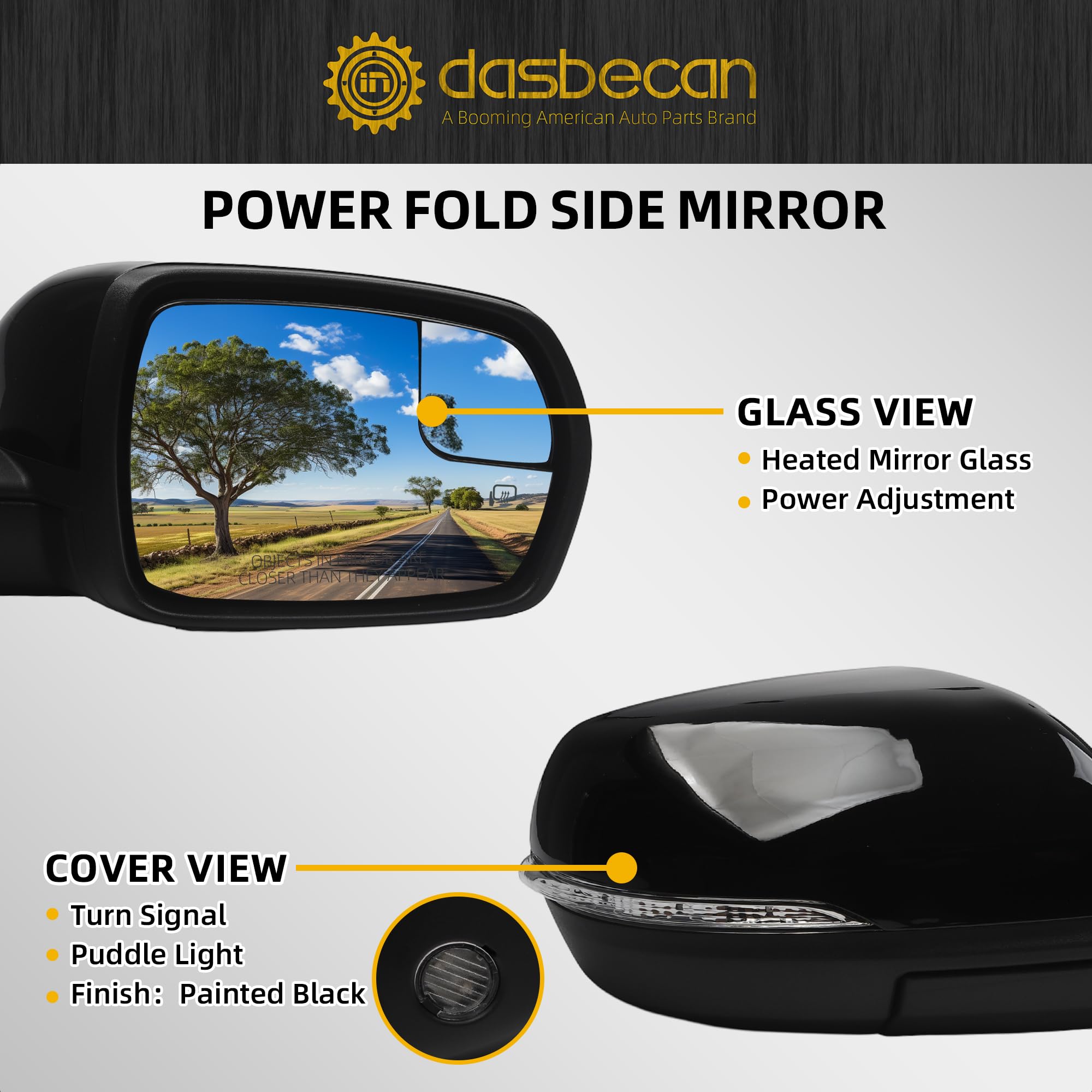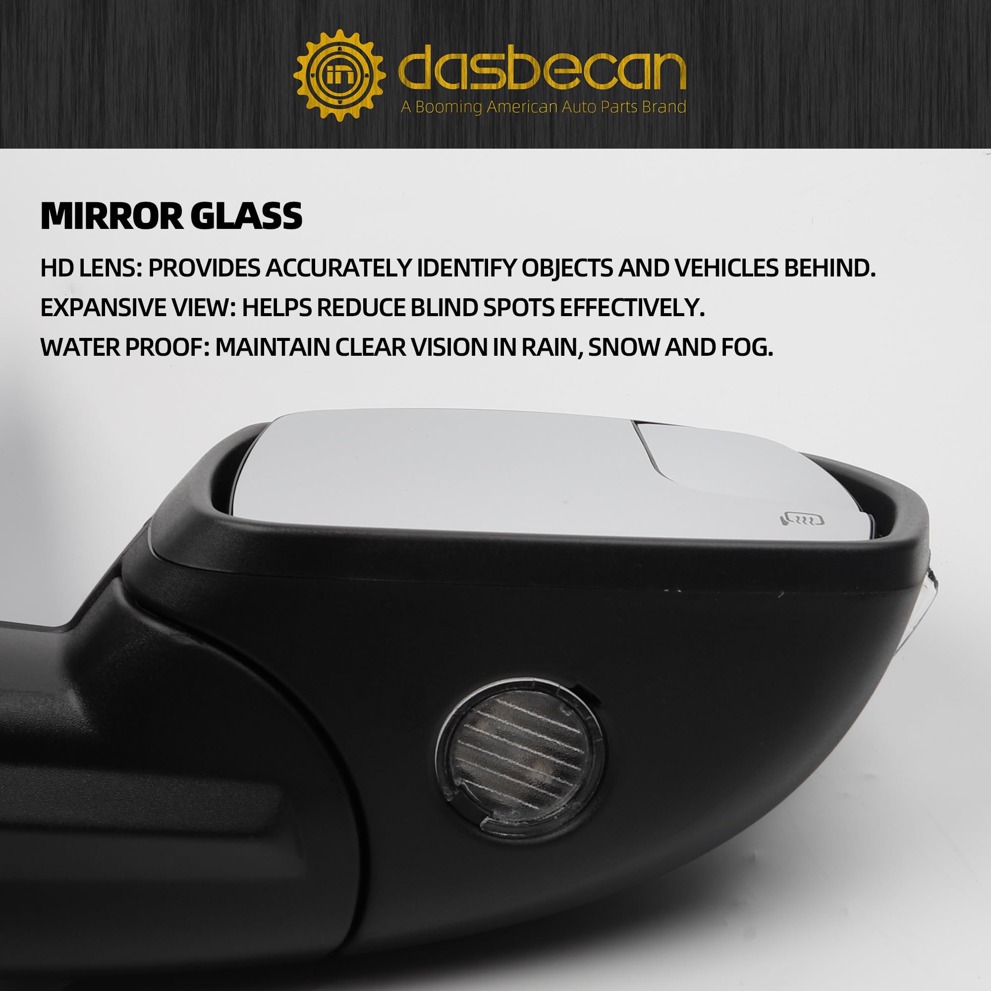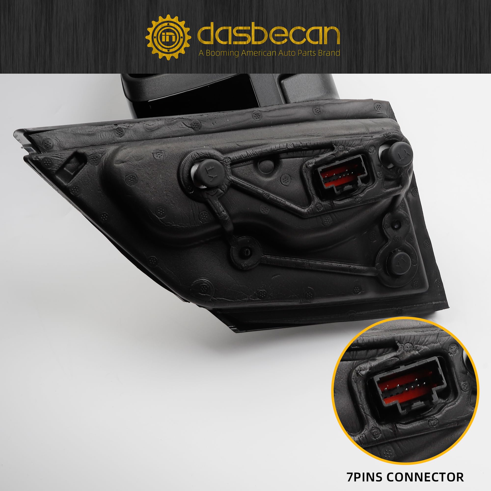 Specifications: Right Passenger Side Exterior Mirror, Power Glass Adjustment, with Heated, with Signal Light (LED Turn Indicator), with Puddle Light, with Spotter Glass, Manual Folding, Black Cover, 7 Pins Connector.