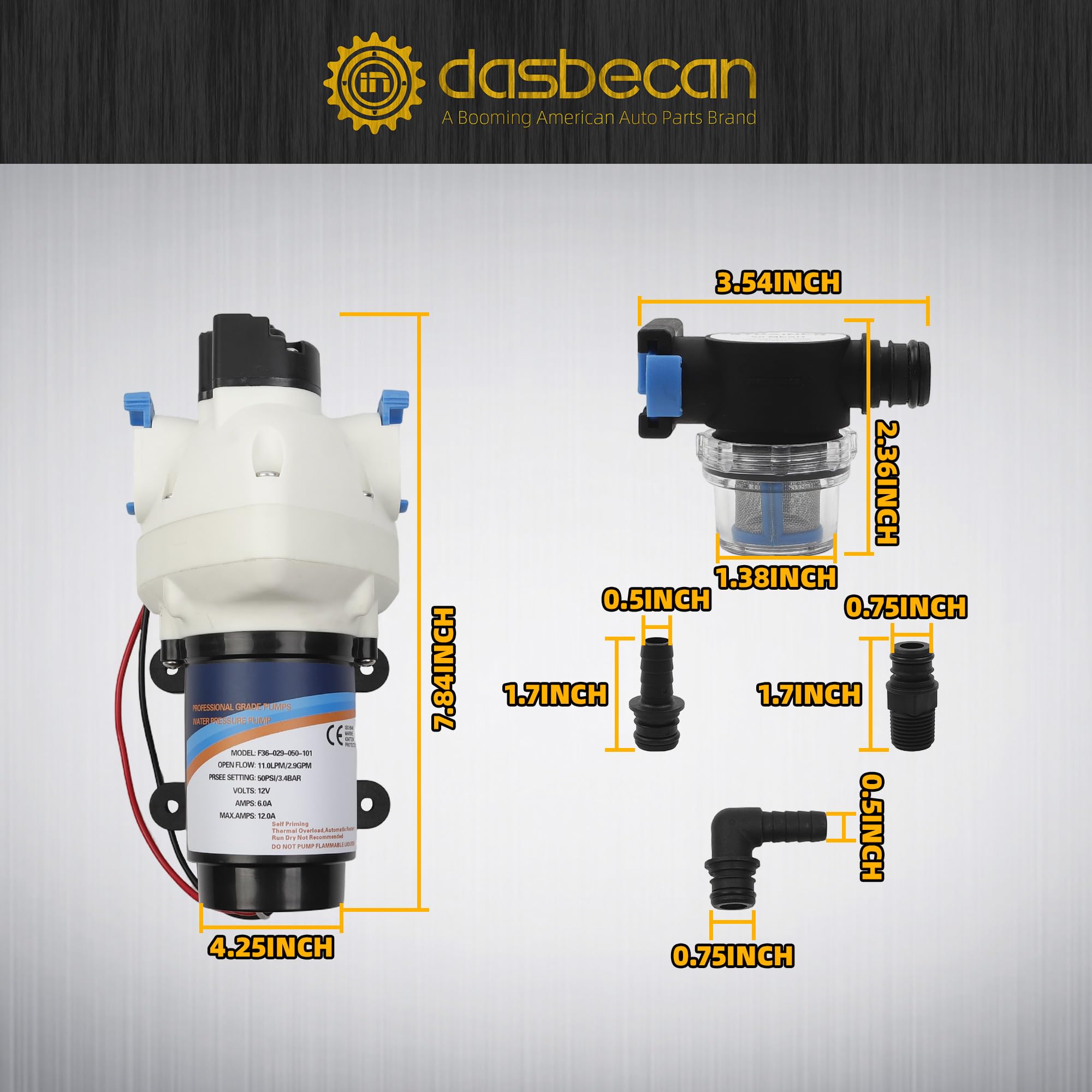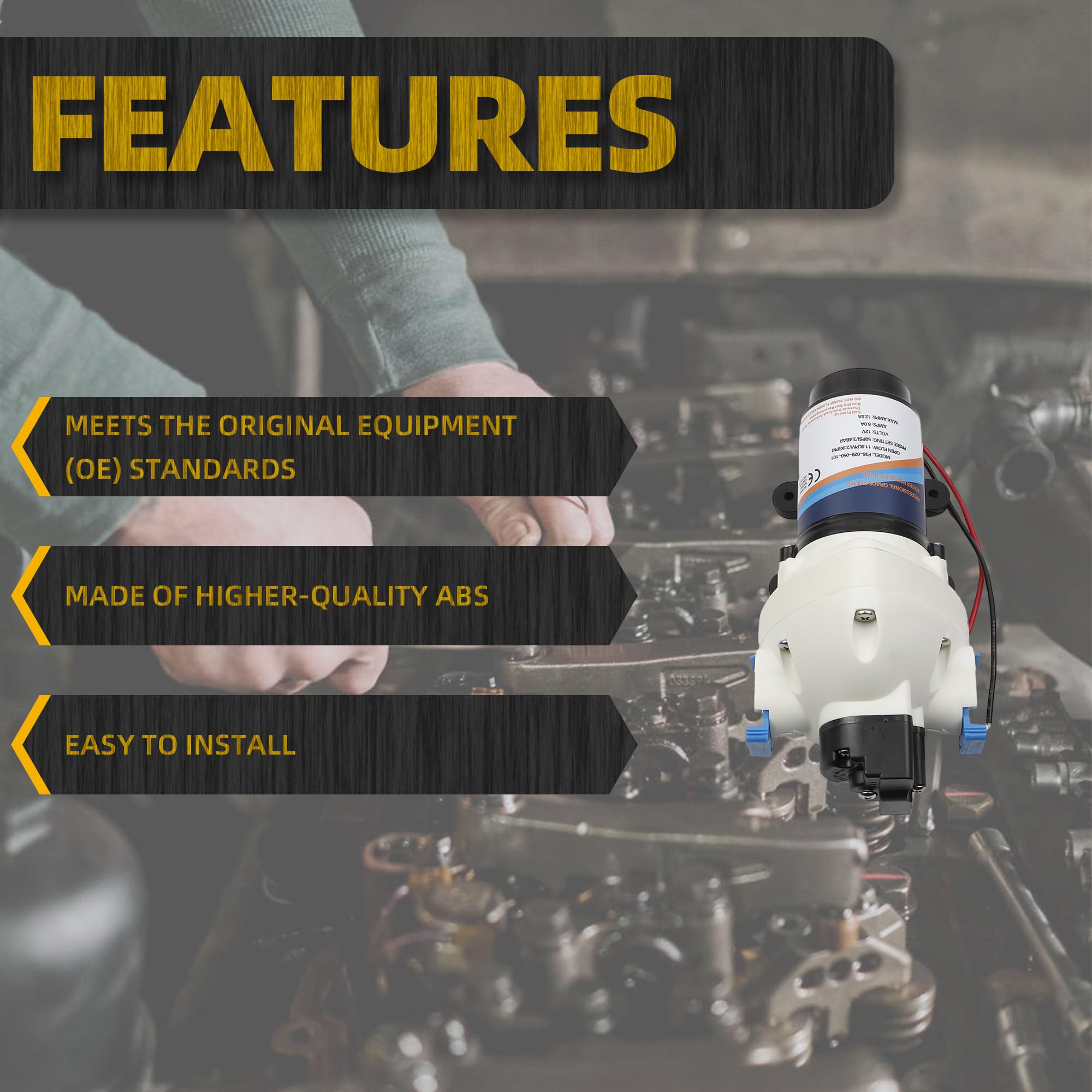 【Detail】Diaphragm Material: Santoprene; Valve Material: EPDM; Nominal Voltag: 12 V DC; Pressure Switch Cut-Off: 50 PSI; Open Flowrate: 3 GPM; Self-Priming Capability: Up to 9FT dry prime; Fluid Temperature Range: 32ºF - 140ºF (0ºC - 60ºC)