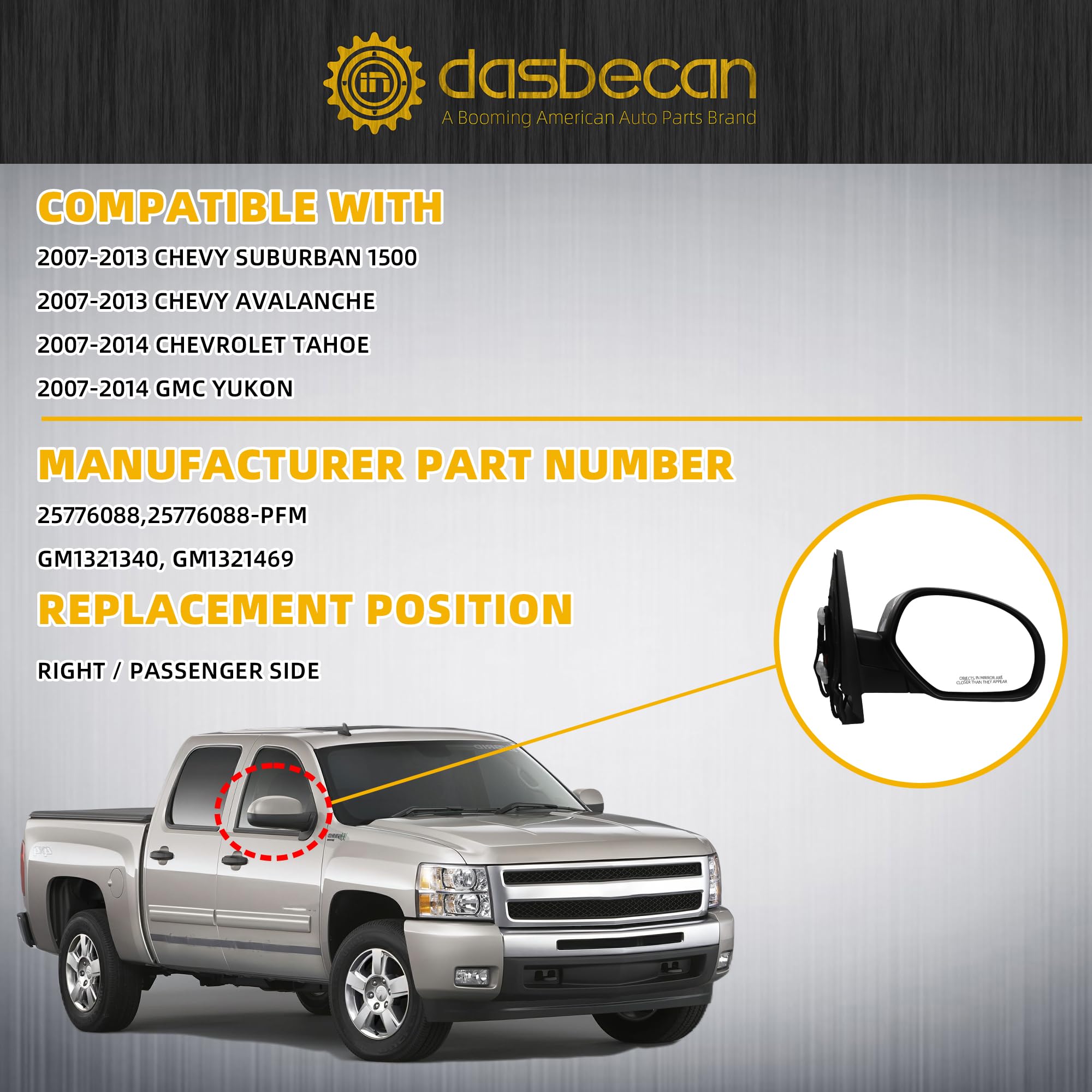 【Comaptible With】 The Passenger Side Mirror Compatible with 2007-2013 Chevy Silverado 1500, Silverado 2500 HD, Silverado 3500 HD, Avalanche, Suburban 1500; 2007-2014 Chevrolet Tahoe