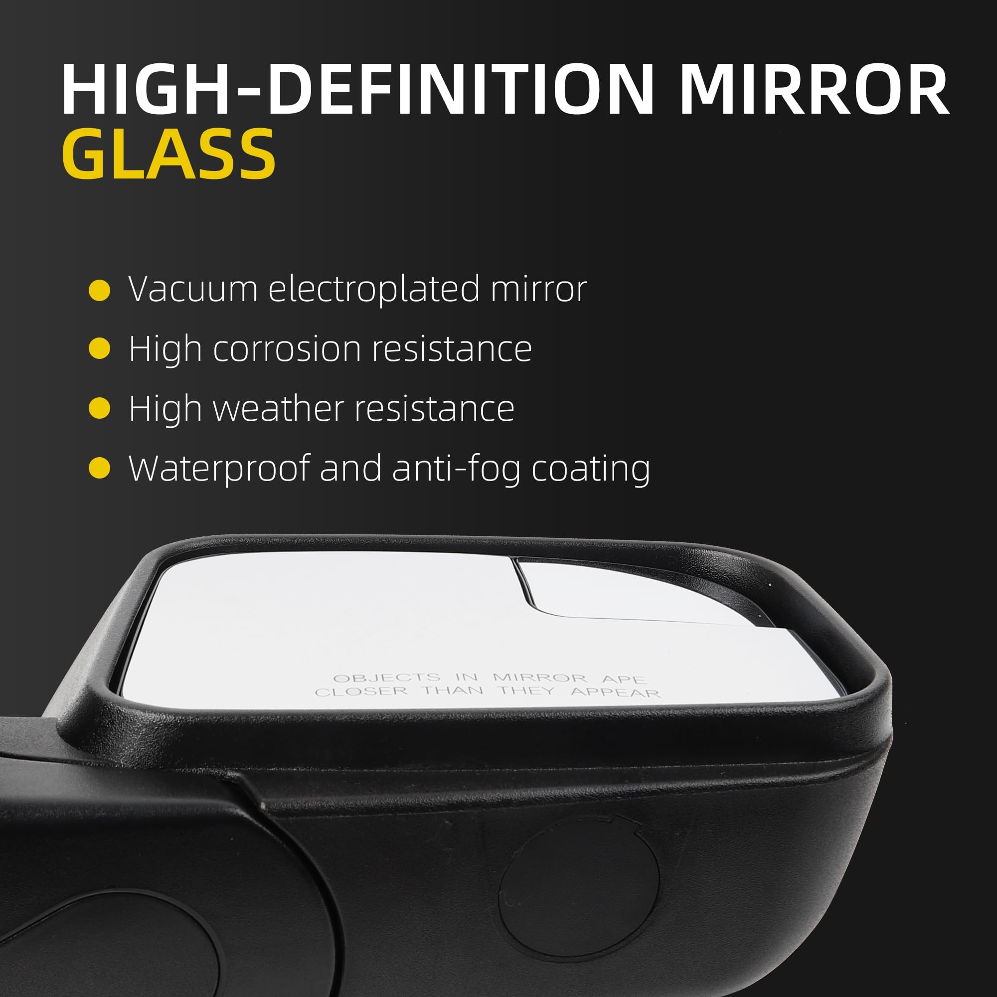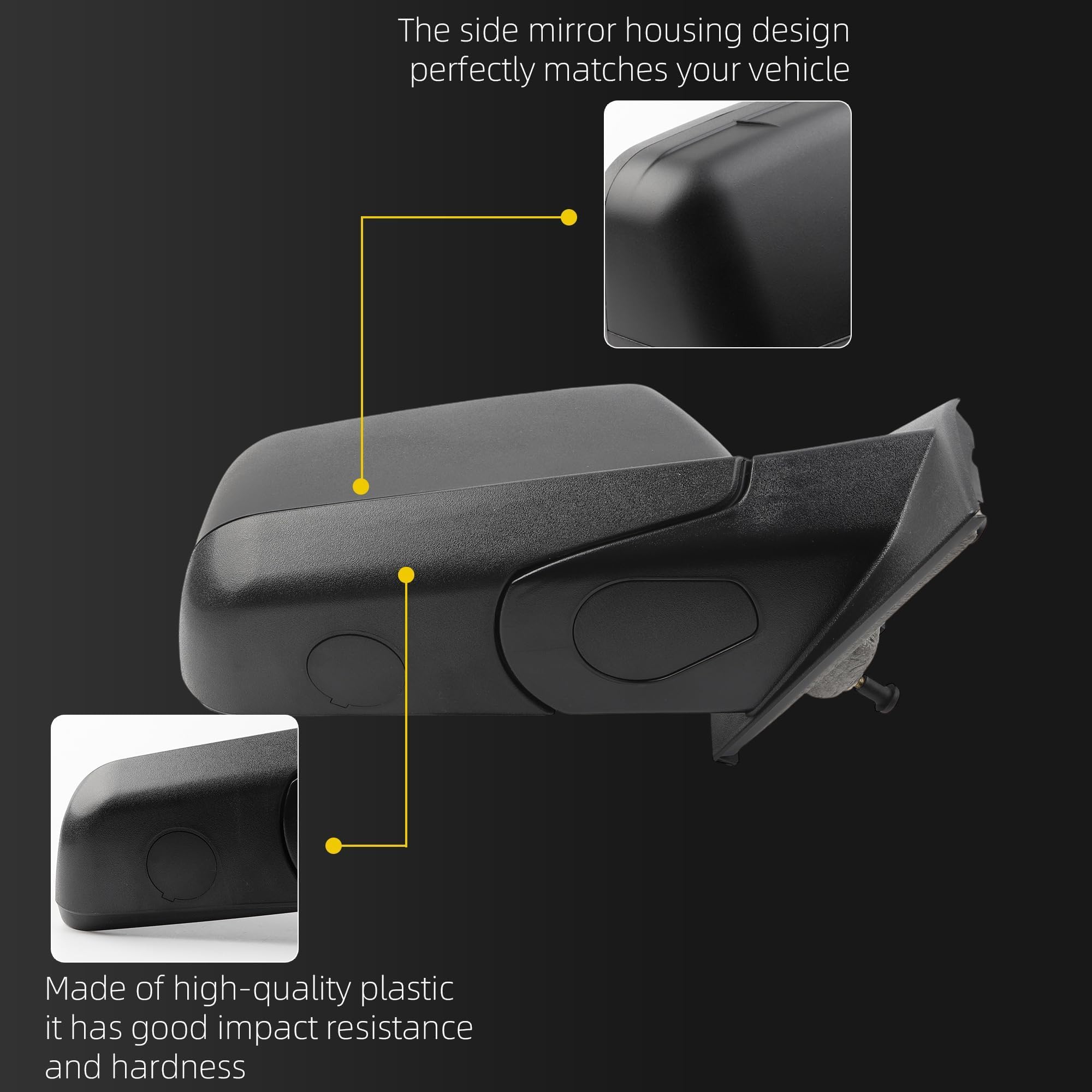 Strict quality control: Utilizing a robust ABS plastic shell and high-definition mirror, it expands the field of vision, reduces blind spots, and easily handles various weather conditions. For many years, we have been committed to producing automotive parts and components, establishing a rigorous production system so you can assured about product quality.