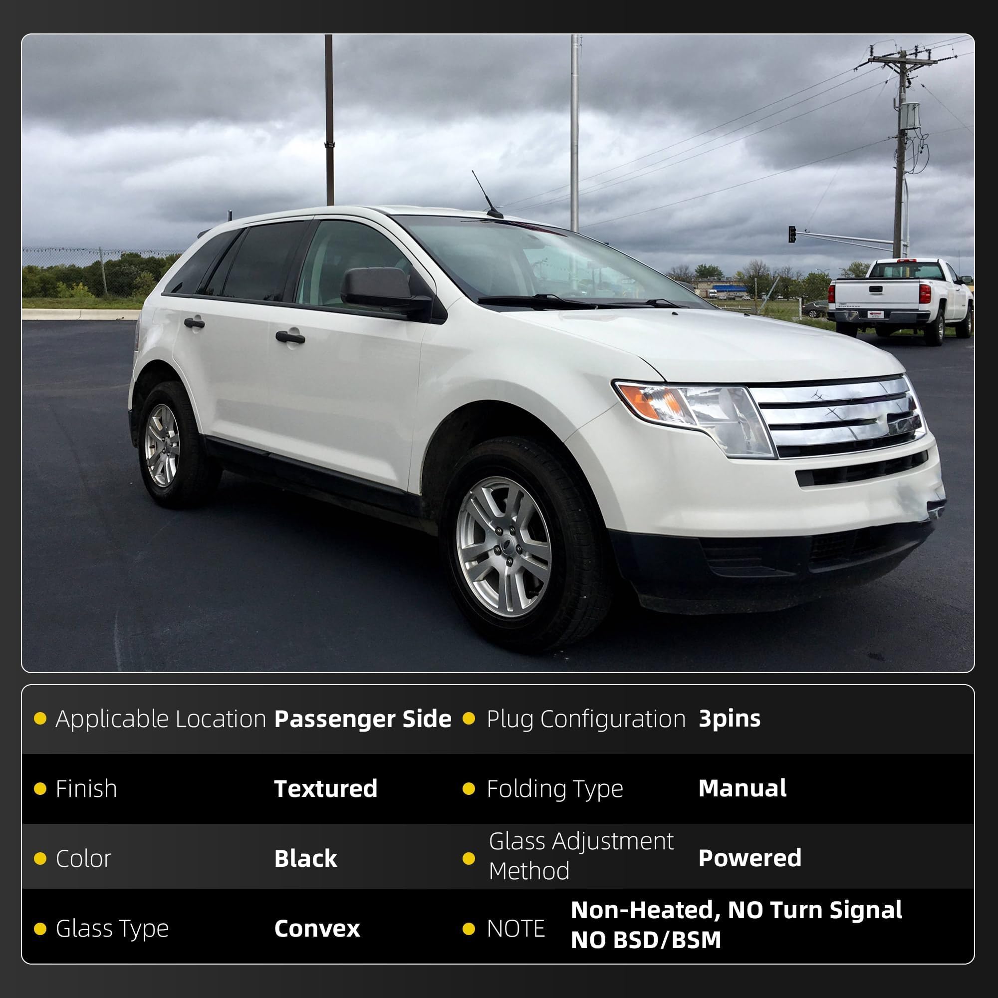 Specifications: Right Passenger Side | Color: Black | 3Pins | Manual Folding | power glass | Without Heated | Without Puddle light | Without Blind Spot Indicator | Without Turn Signal Indicator | To 02-07-2011 Production Date