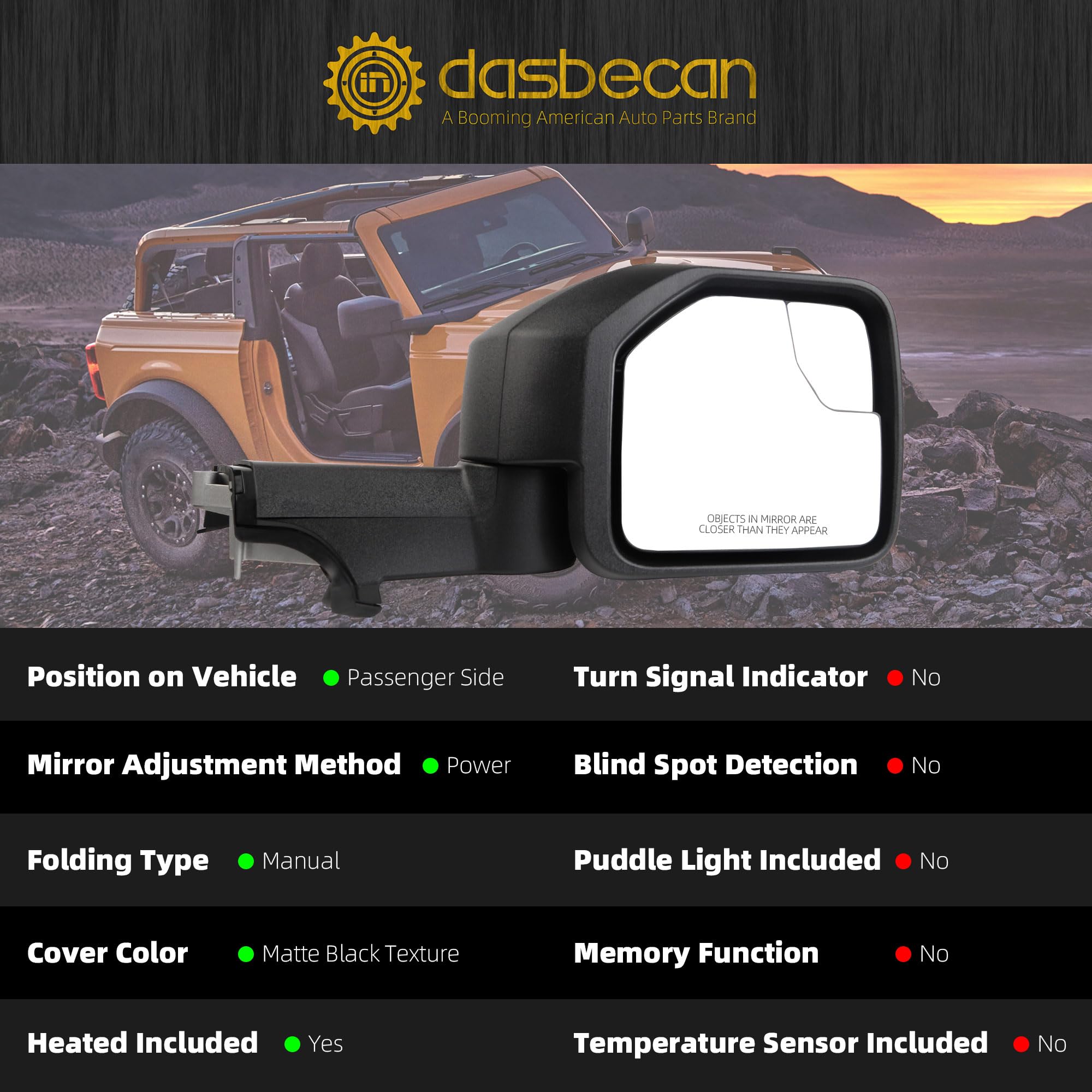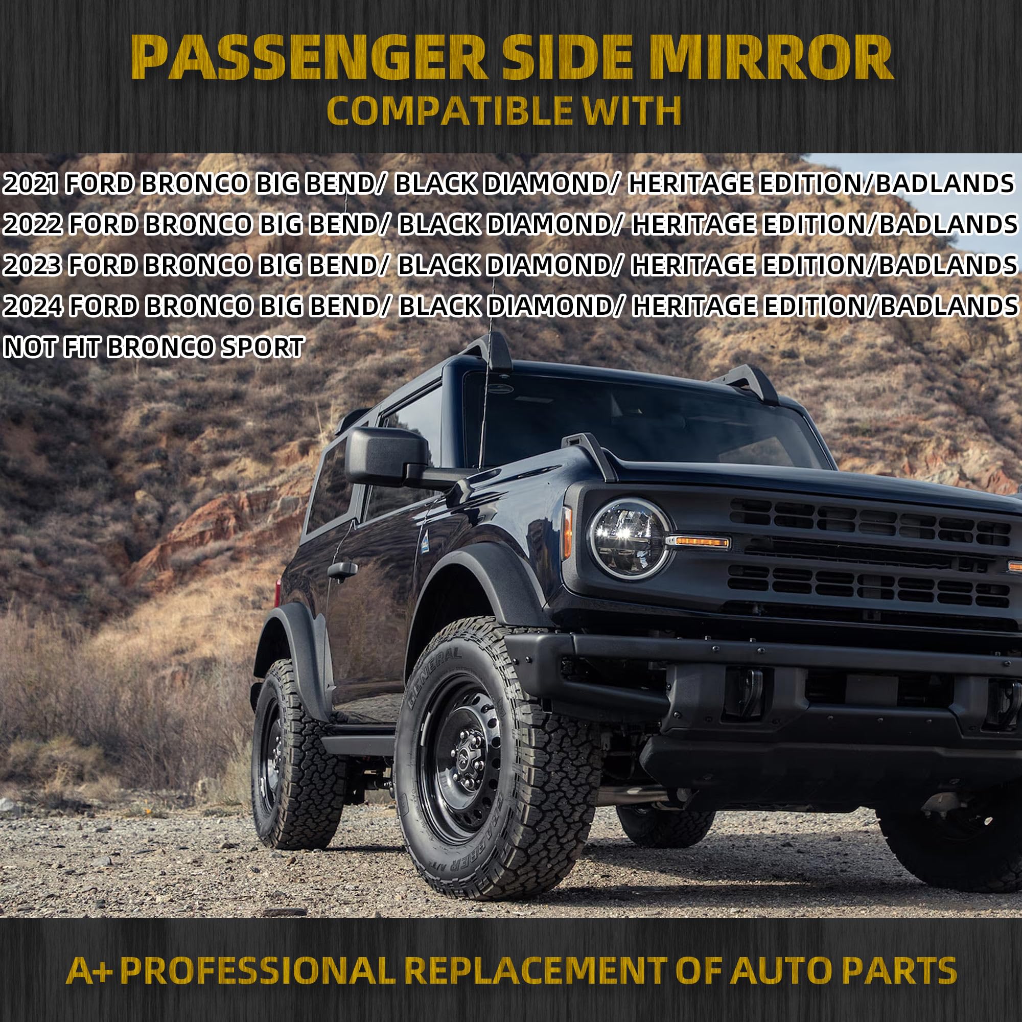 【Specific Vehicles】The Passenger Side Door Mirror Compatible With 2021 2022 2023 2024 Ford Bronco Big Bend/ Badlands/ Heritage Edition/ Black Diamond, Black Texture Cover (5pins)