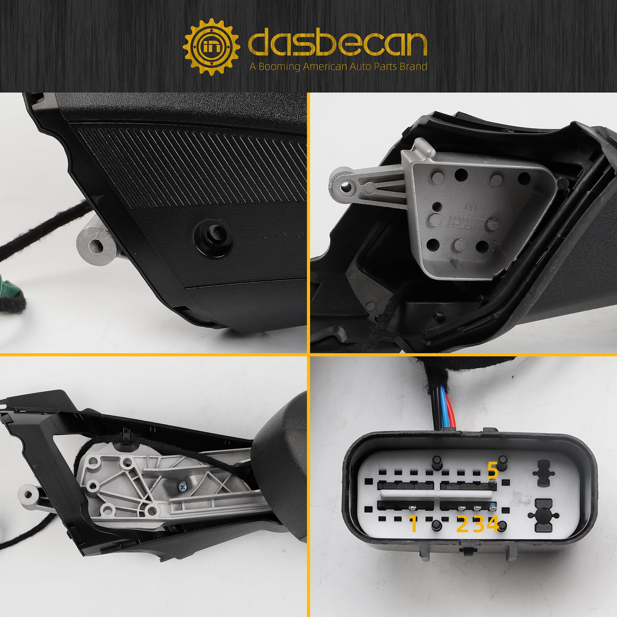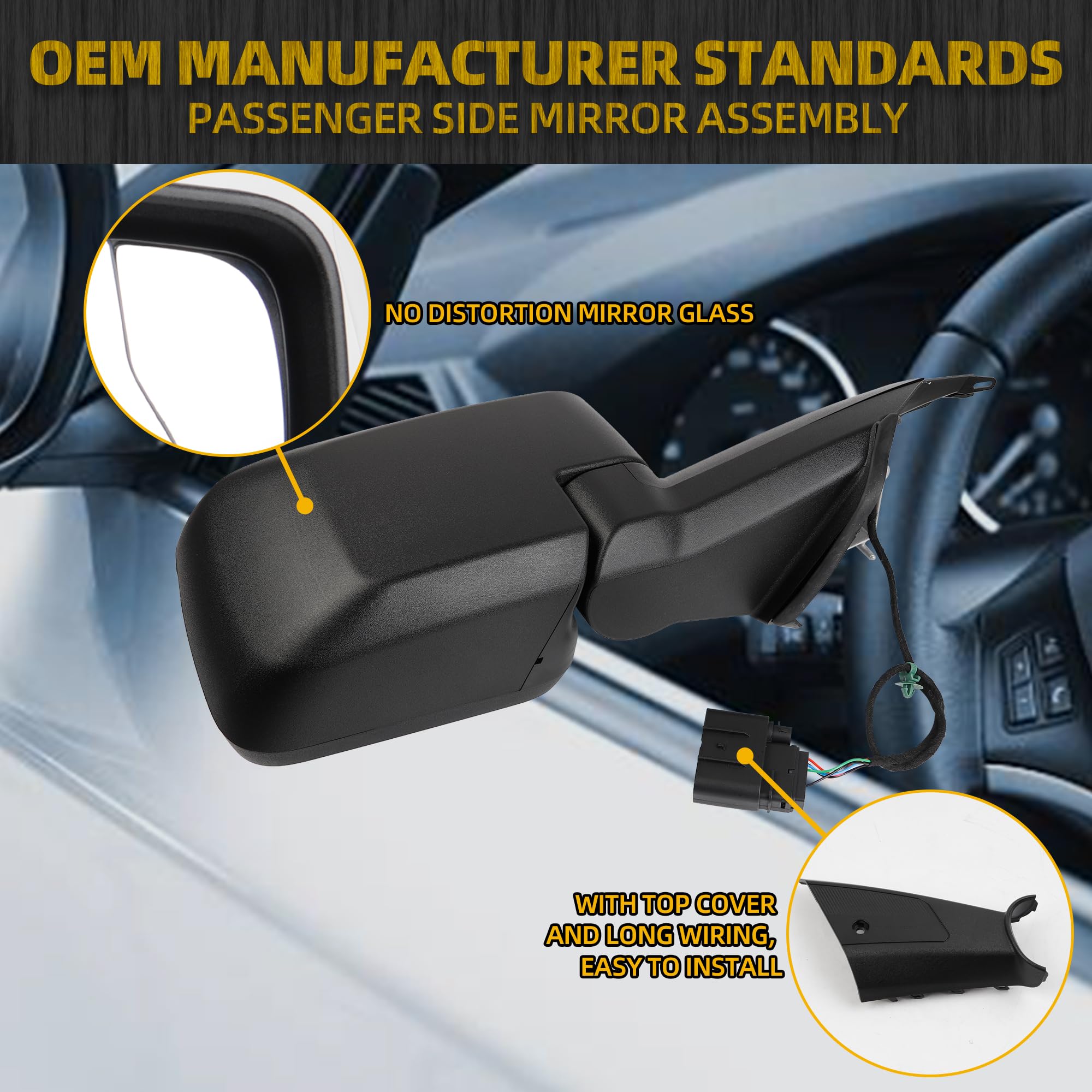 【Function】The Right Rearview Mirror Equipped Power Heated Adjustment Mirror, Blind Spot Mirror, Top Panel and Manual Folding. Withour Turn Signal. Black Texture Cover