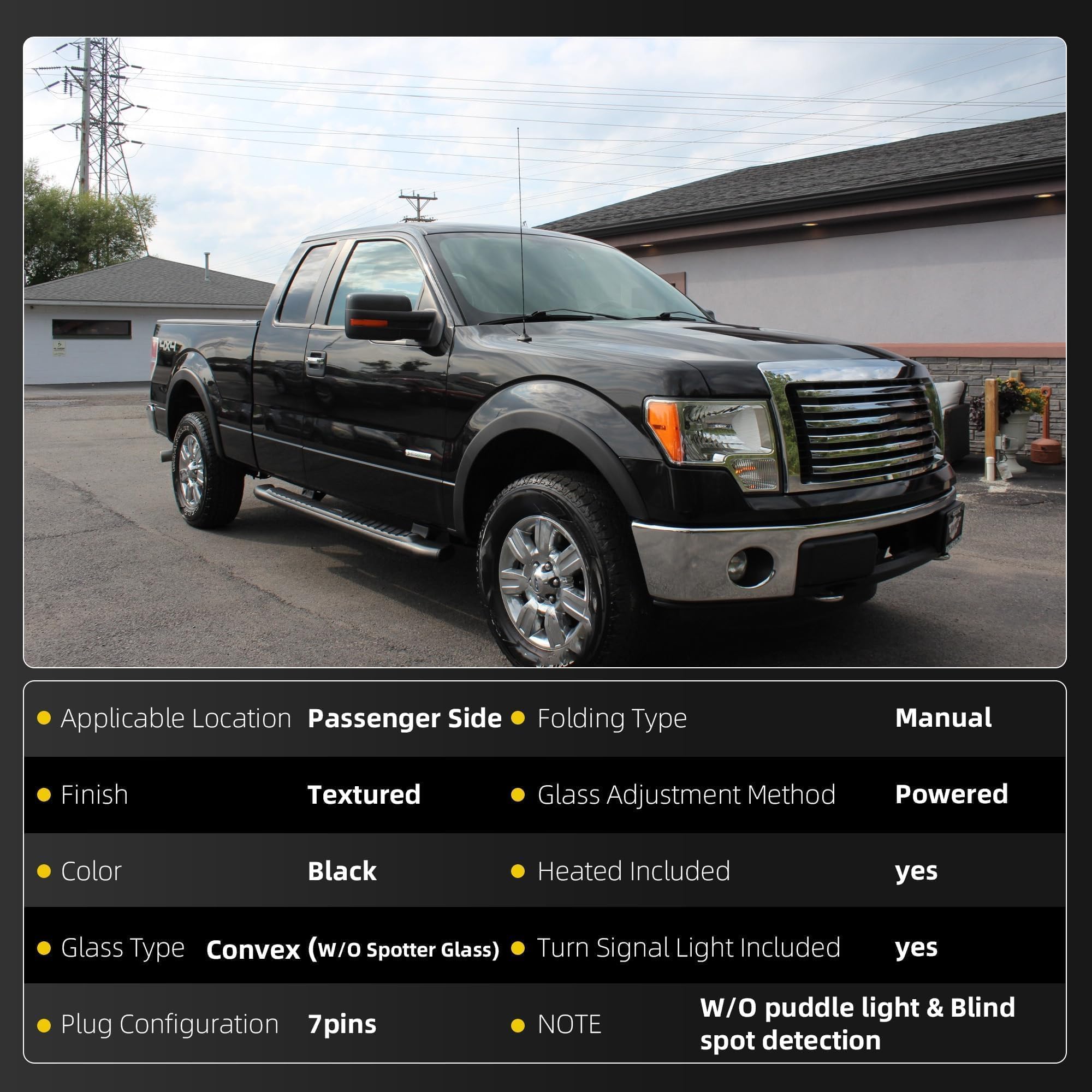 Specification:Right Passenger Side | Heated | Standard type | Manual Folding | Power Glass | Glass Type: Convex | Turn Signal Indicator | Without spotter glass | Without Blind Spot Detection | Without Puddle light | 7Pins