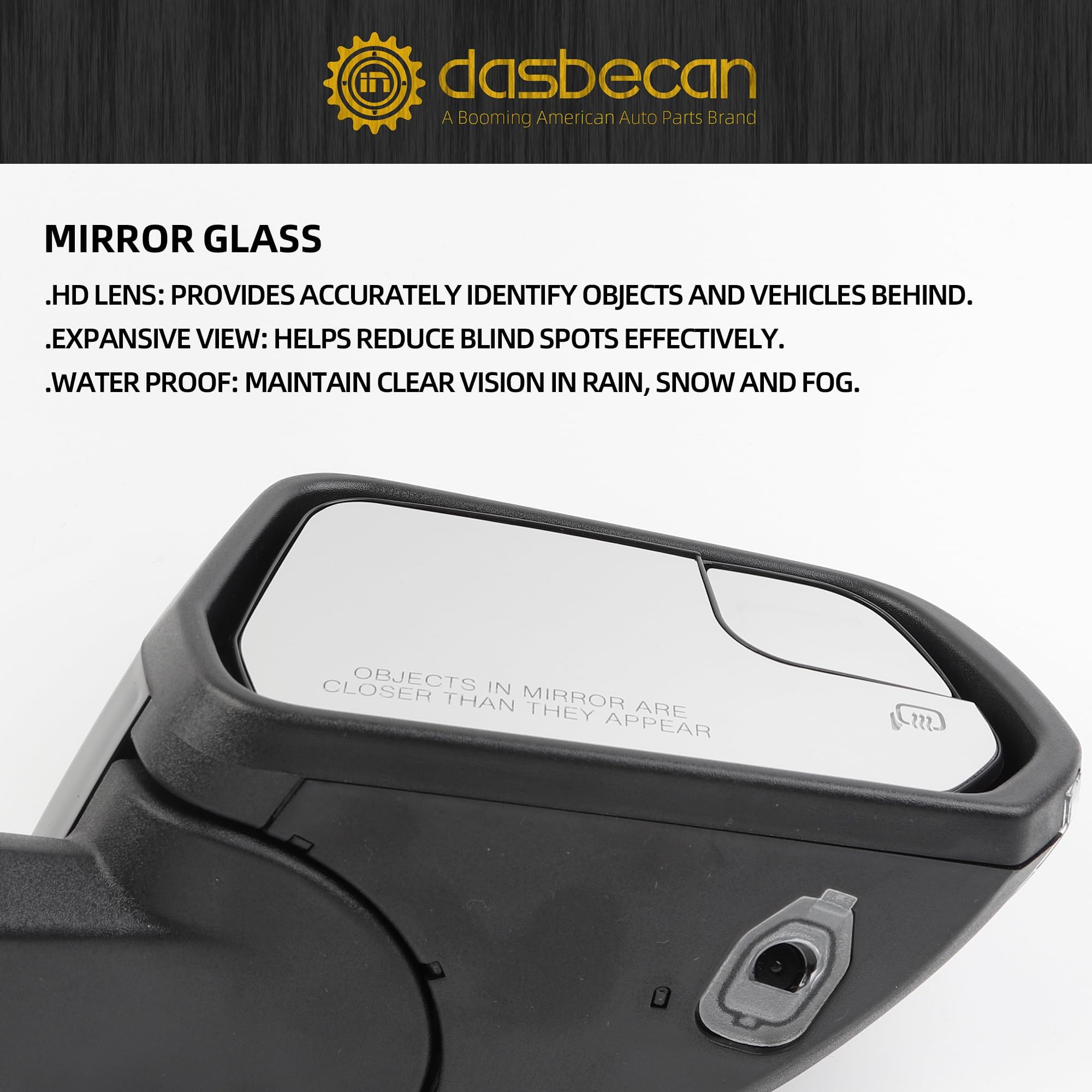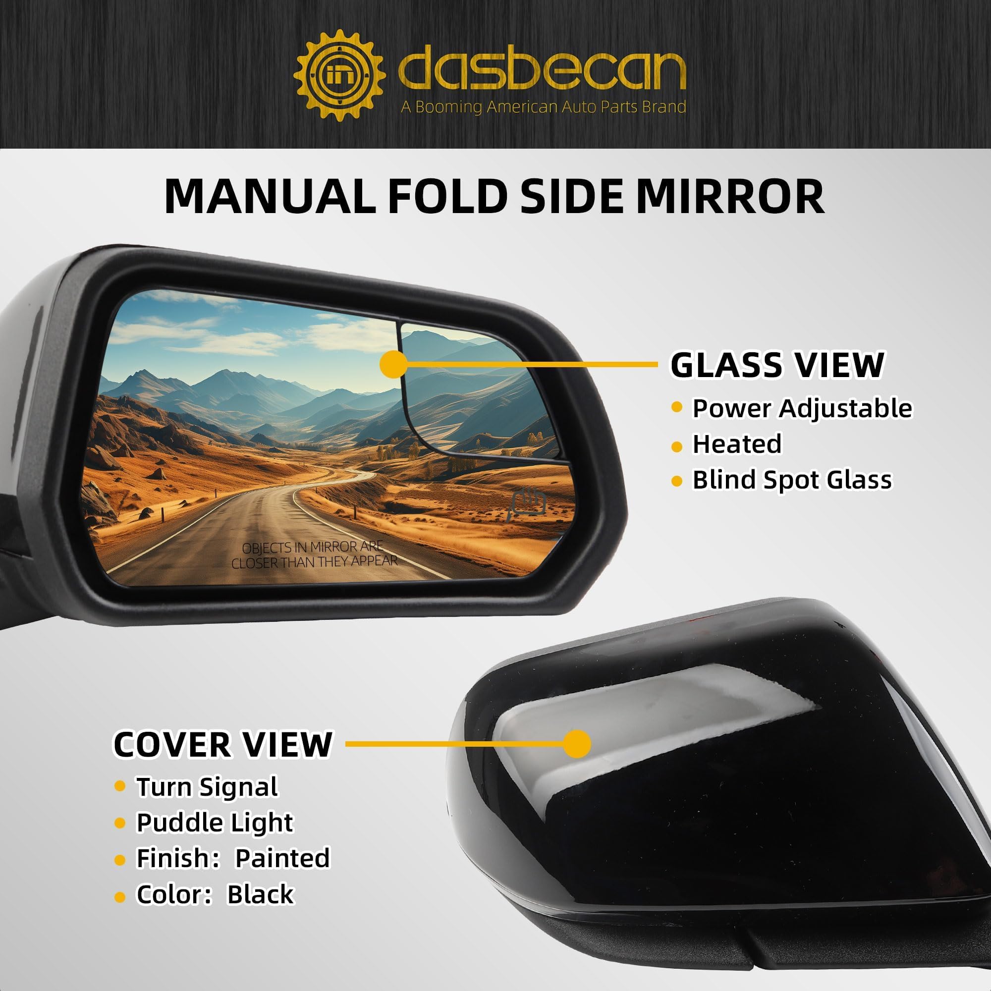 Feature: Power Adjusted Glass, Manual Folding, with Heated Function, with Blind Spot Glass, with Turn Signal Light Puddle Lamp, 7 Pins Connector, Glossy Black Cover.