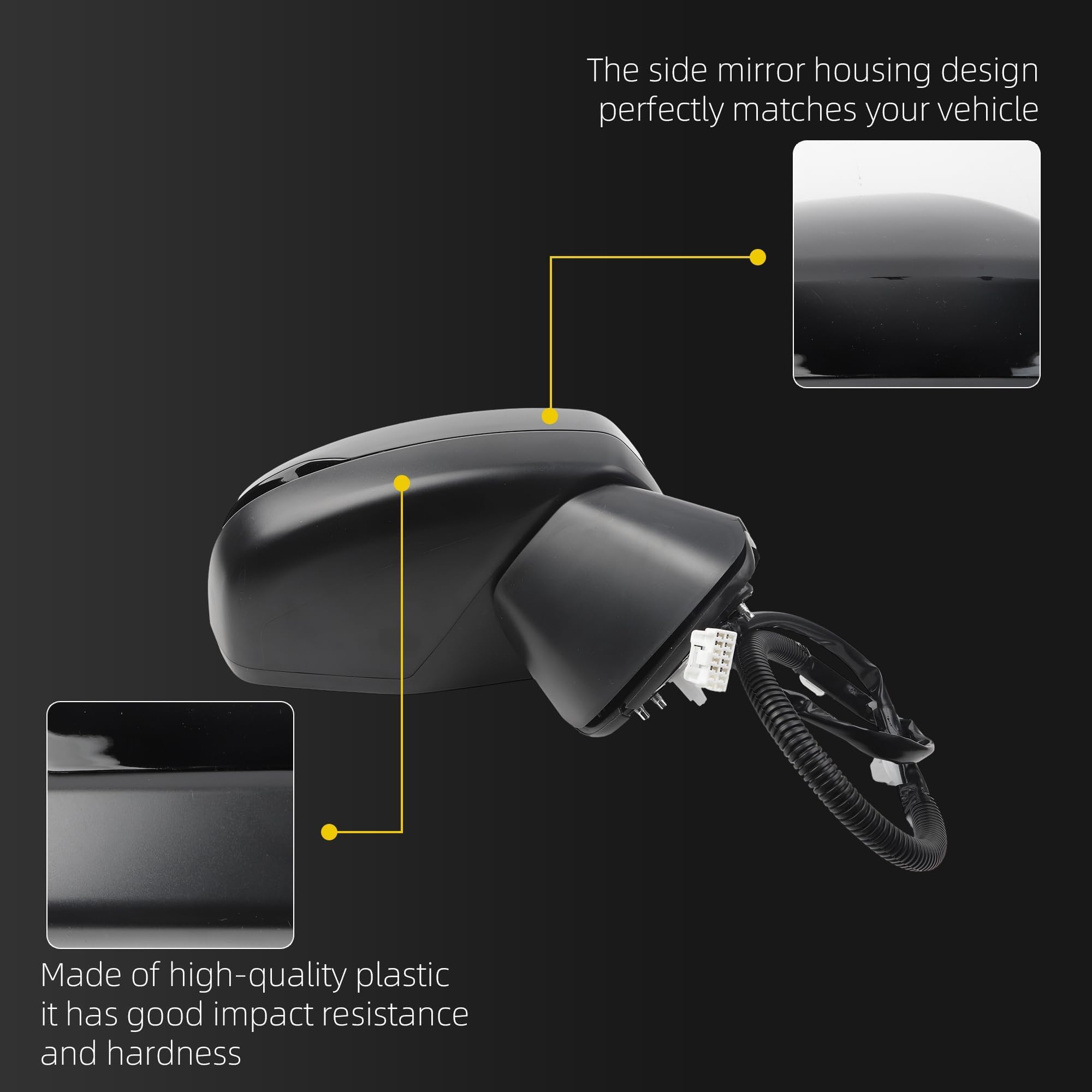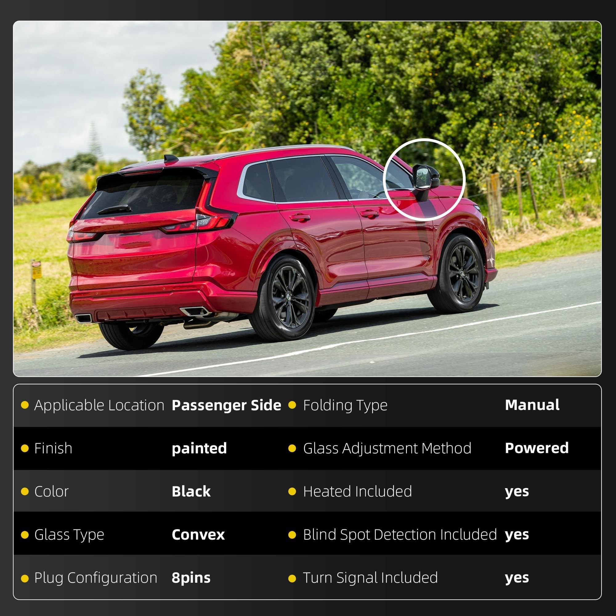 Specification: Passenger Right Side | Convex | Manual folding | Power Glass | Turn Signal Indicator | Blind Spot Detection | Heated | 8Pins | Black