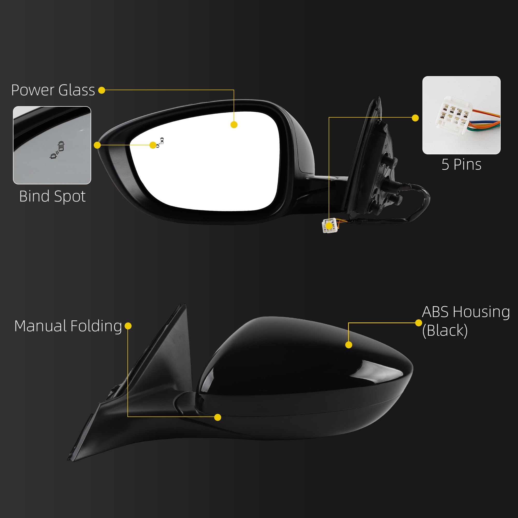 [Features] This Black mirror unit includes a 5-pin connector for plug-and-play installation, durable ABS housing comparable to OEM quality, and a manual folding design for space-saving when parked. It serves as a quick replacement for damaged or broken mirror assemblies.