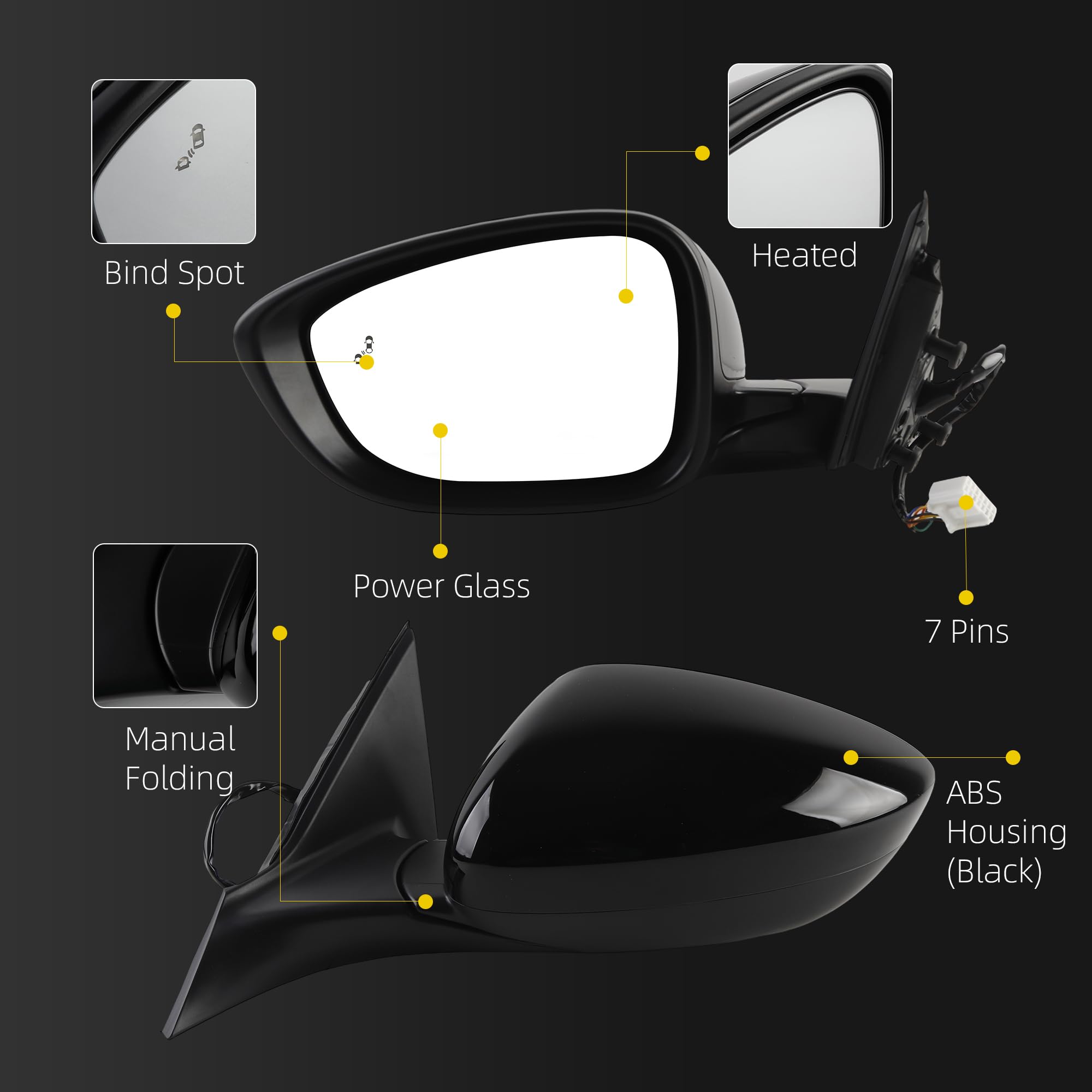 [Features] This Black Door Mirror includes a 7-pin connector for plug-and-play installation, durable ABS housing in black comparable to OEM quality, power glass adjustment, and a manual folding design for space-saving when parked. It serves as a quick replacement for damaged or broken mirror assemblies.