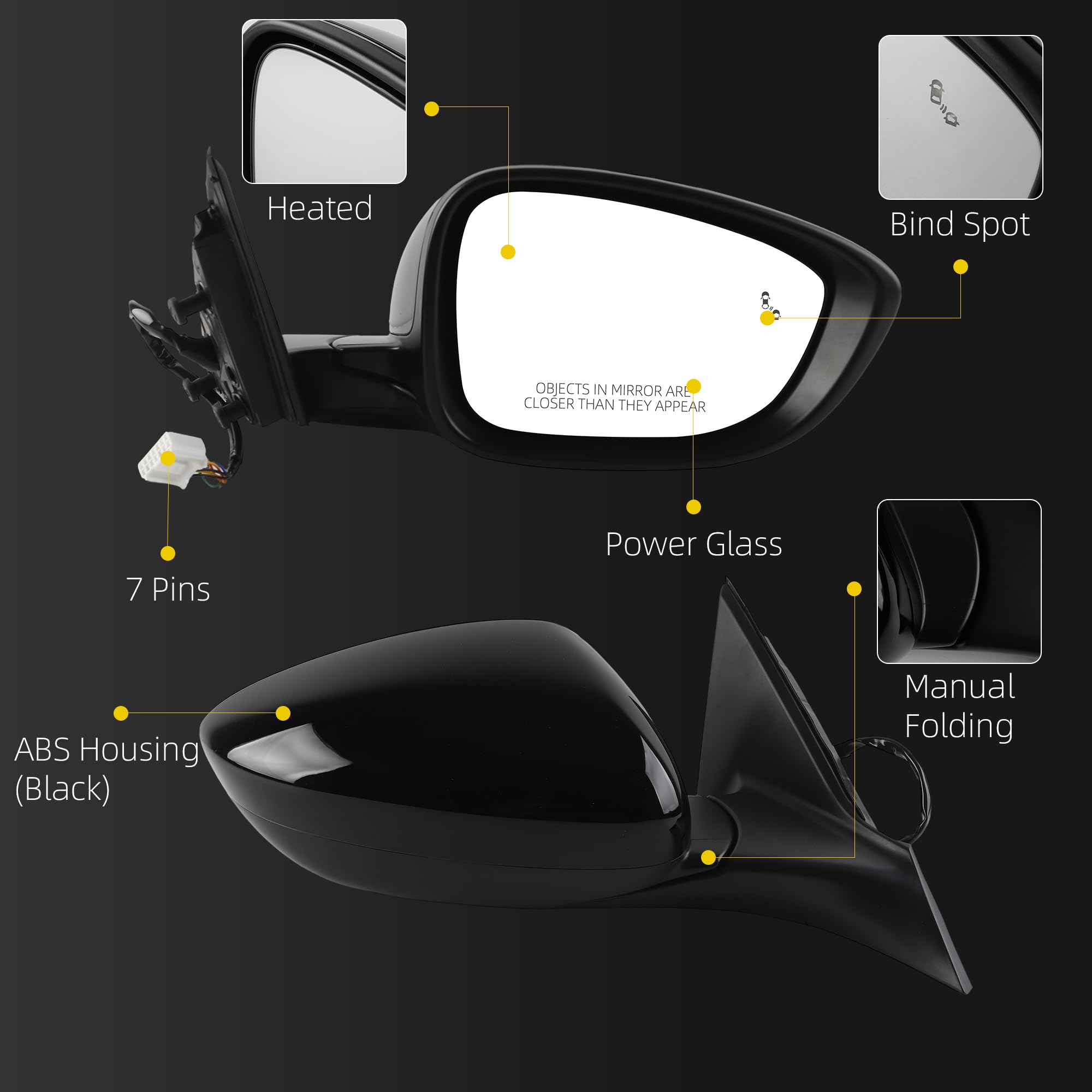 [Features] This Black Mirror Assembly includes a 7-pin connector for plug-and-play installation, durable ABS housing in black comparable to OEM quality, power glass adjustment, and a manual folding design for space-saving when parked. It serves as a quick replacement for damaged or broken mirror units.
