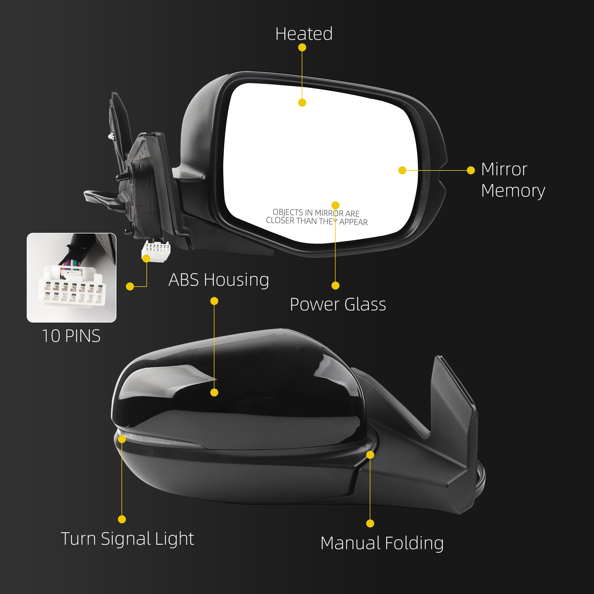 Features:The right mirror is equipped with Heated,Manual Folding,Power Glass,10 PINS,ABS Housing,Turn Signal Light,Mirror Memory,plug and play,easy installation.