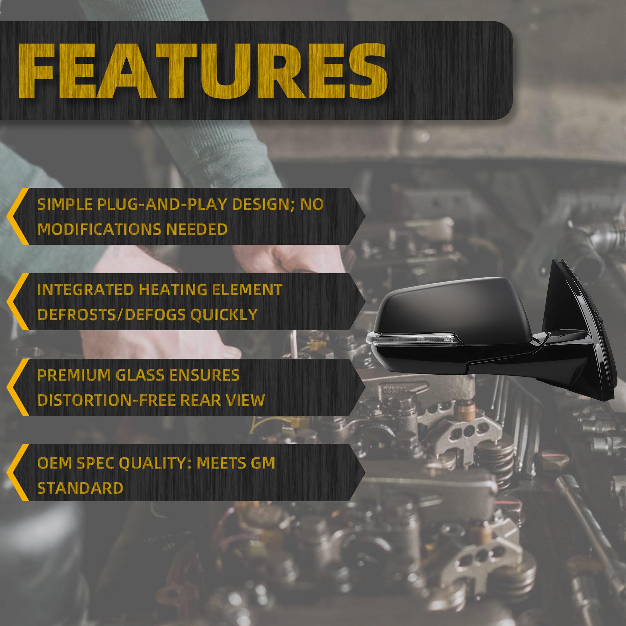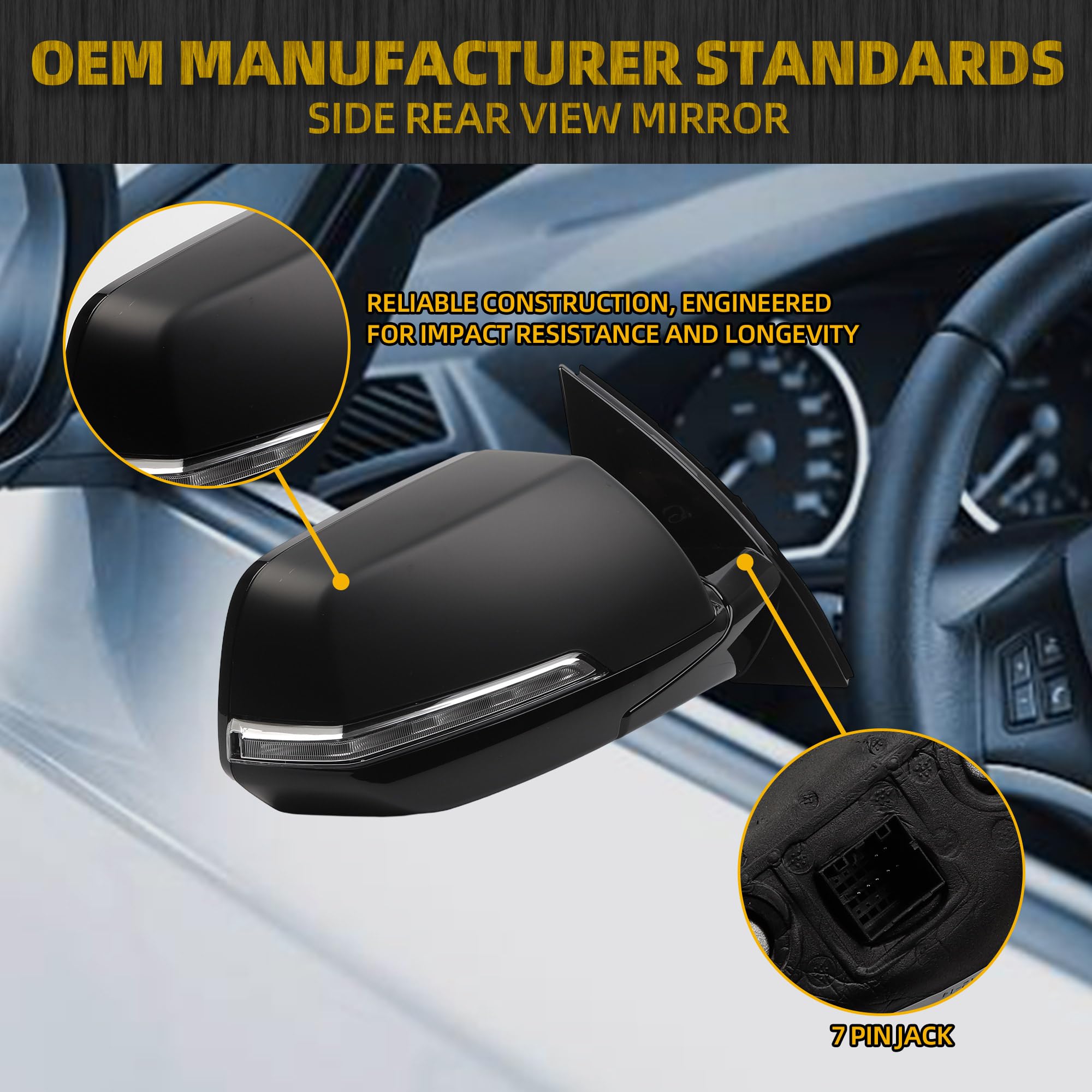 Features:The right mirror is equipped with power heated,high-quality glass,7pins,plug and play,easy installation.