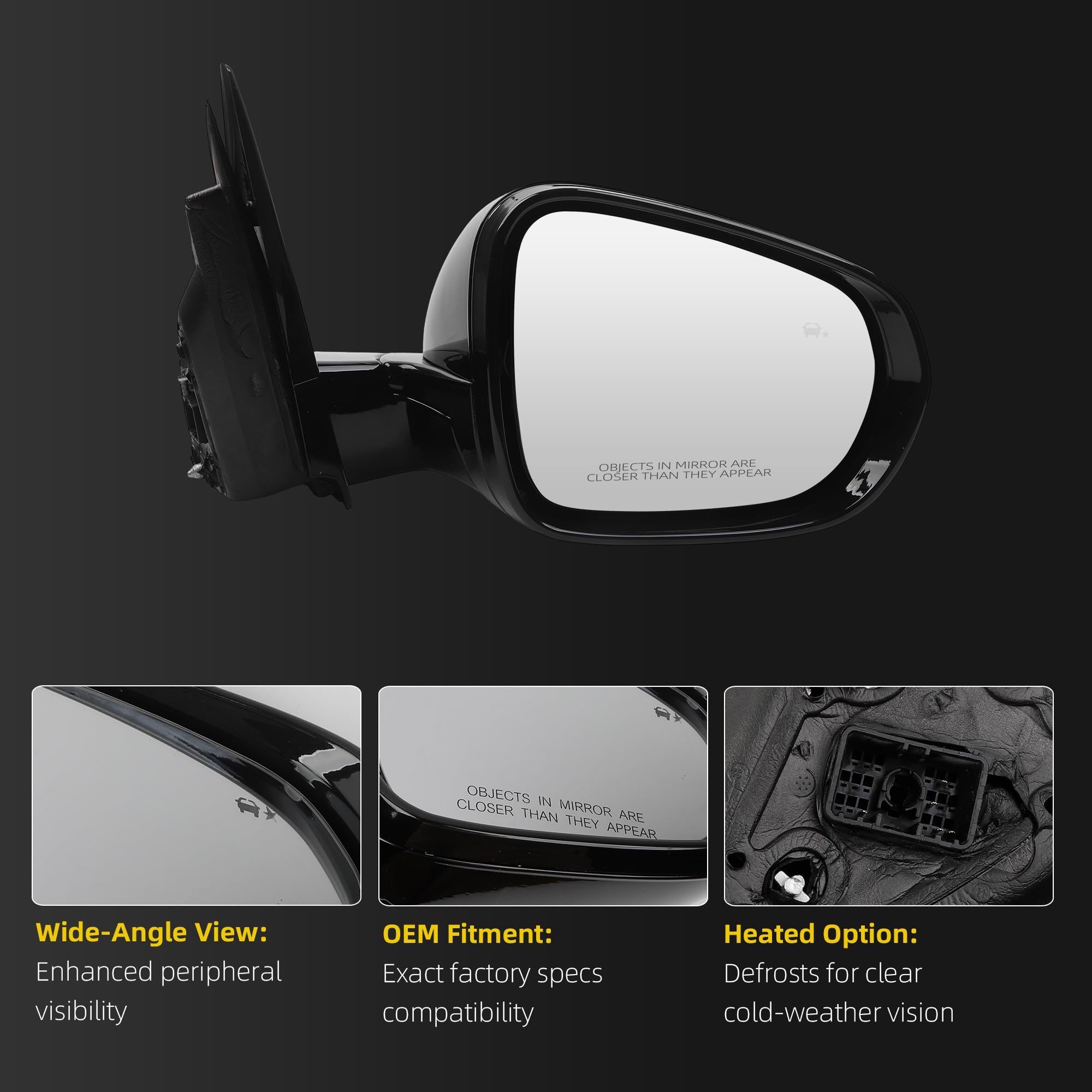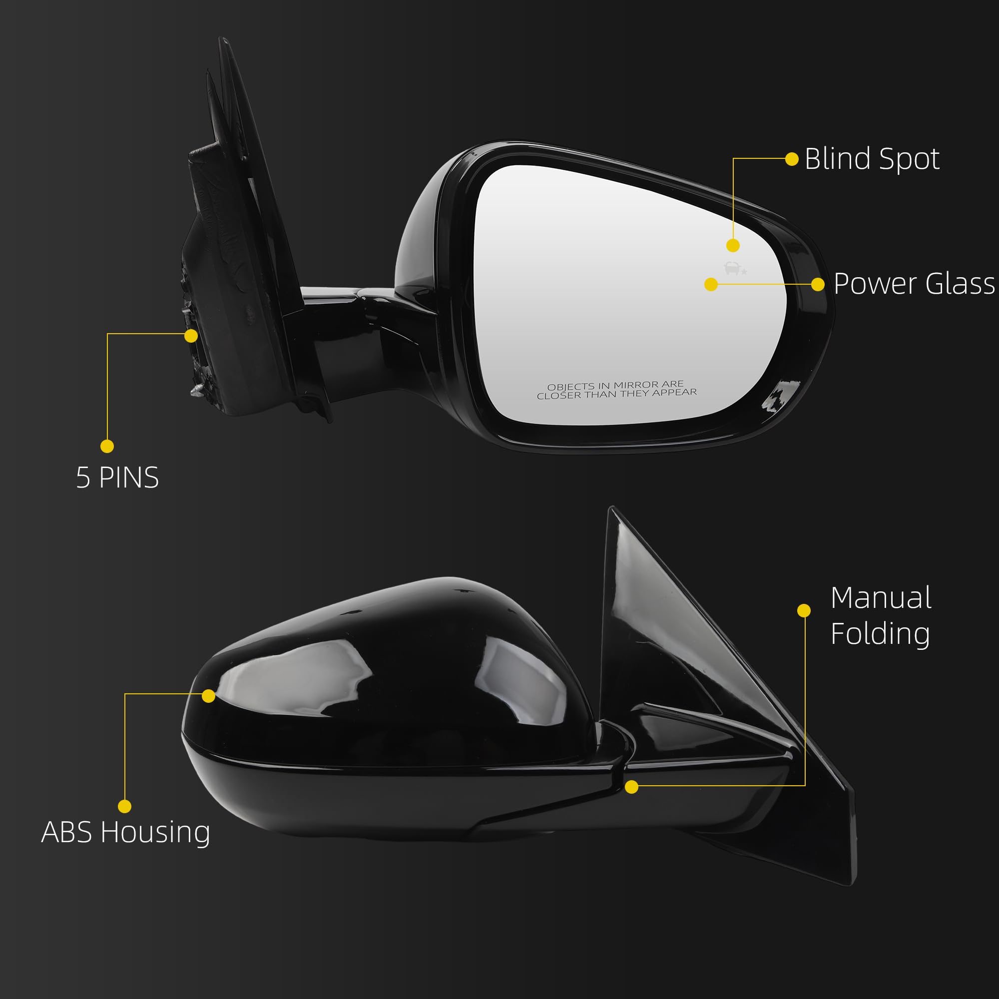 Features:The right mirror is equipped with high-quality glass,5pins,ABS housing,plug and play,easy installation.