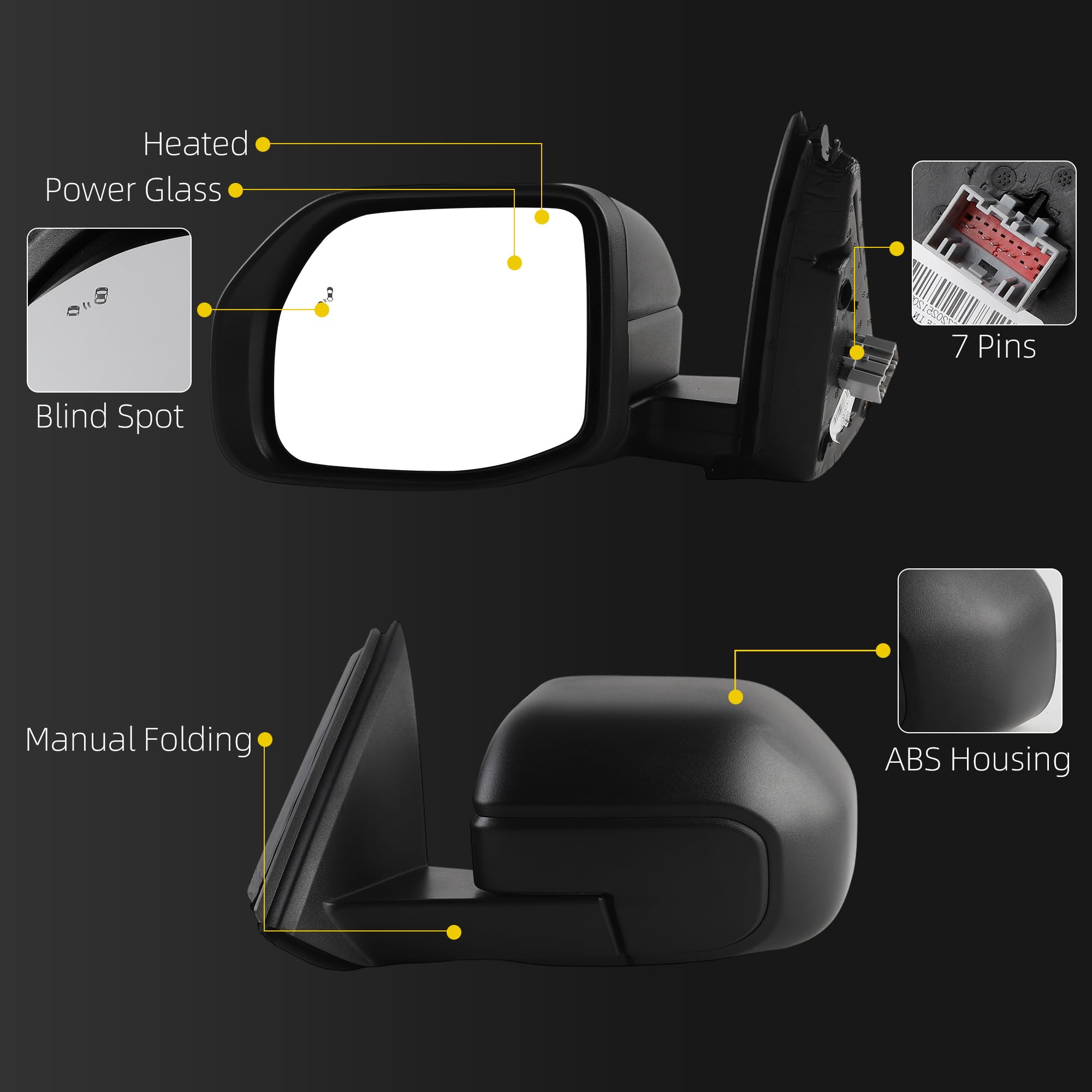 [Advantage] The Side Mirror has a built-in blind spot monitoring system that provides auxiliary lane change alerts. The heated lens helps quickly defog and de-ice for clear visibility in cold weather. It is constructed with durable ABS material for impact and corrosion resistance.