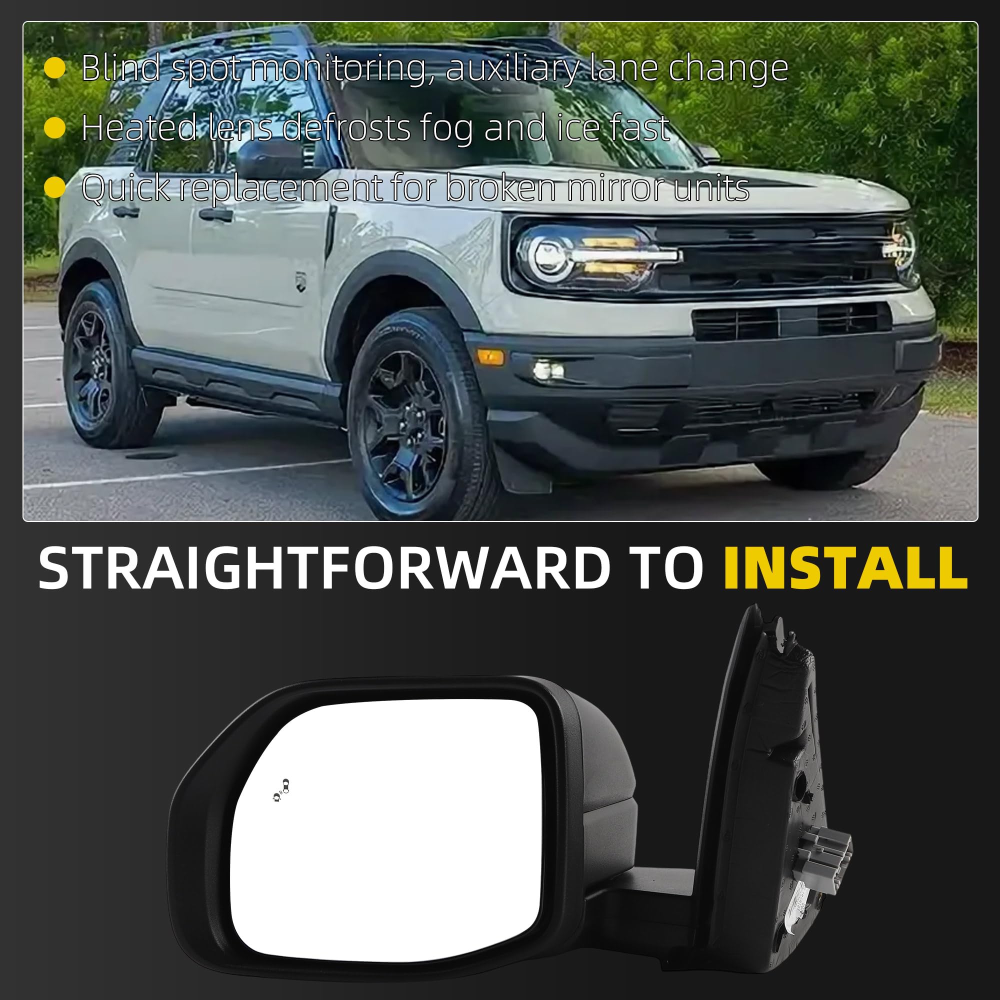 [Fitment] The Side RearView Mirror is Compatible with 2021 2022 2023 2024 2025 Ford Bronco Sport.