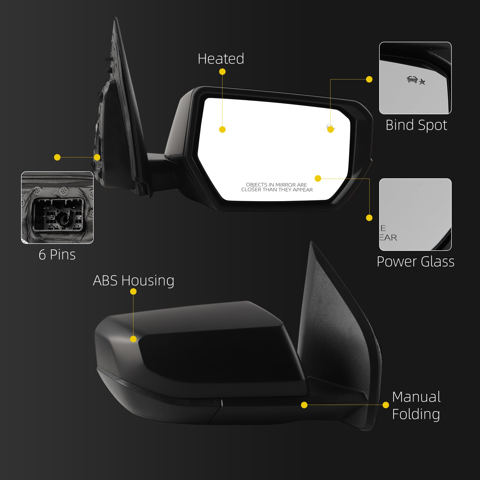 [Features]This rearview mirror has a clear HD glass lens, a direct OEM fit, easy installation, a 6-pin plug-and-play design, an ABS housing, and manual folding functionality.