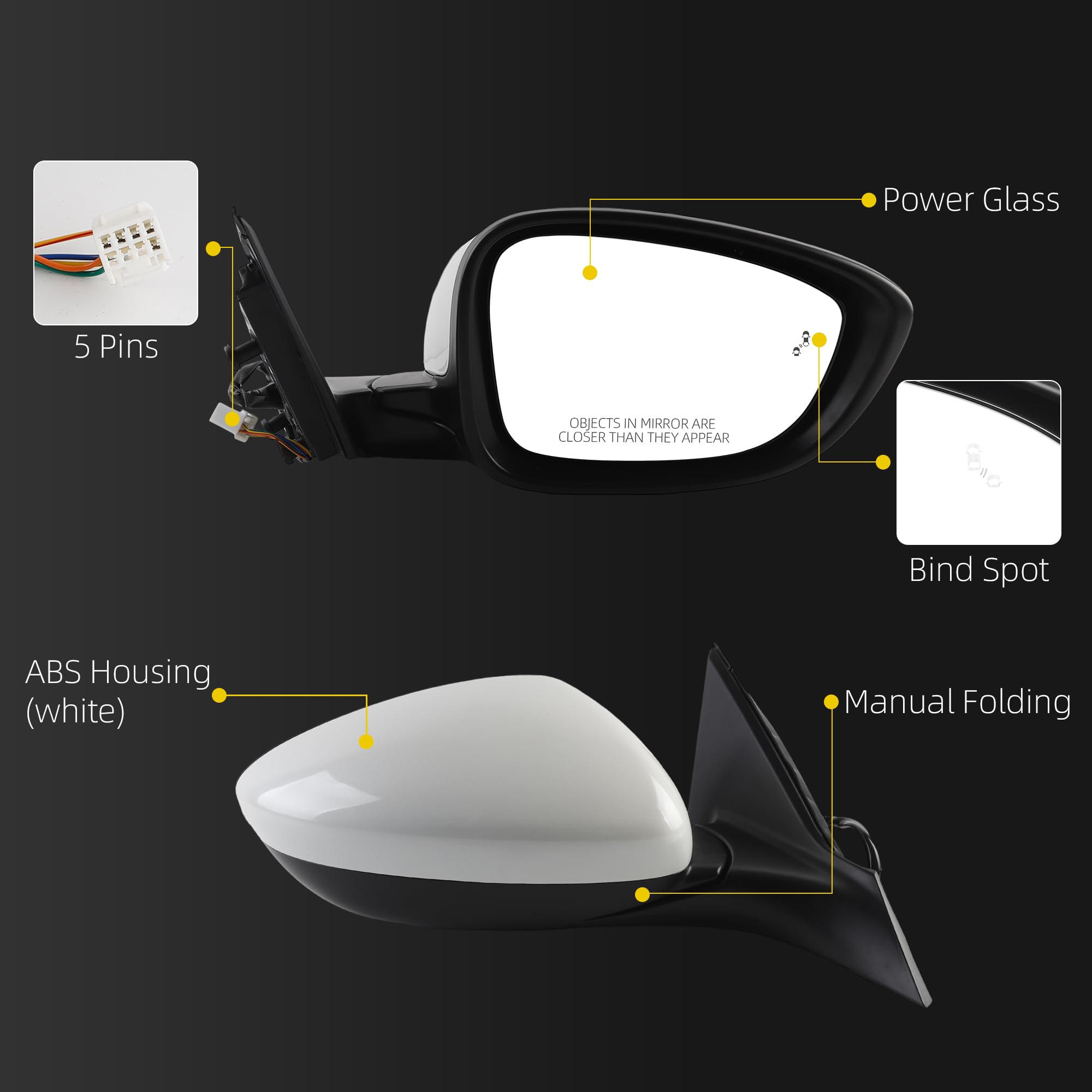 [Features] This White Door Mirror includes a 5-pin connector for plug-and-play installation, durable ABS housing comparable to OEM quality, power glass adjustment, and a manual folding design for space-saving when parked. It serves as a quick replacement for damaged or broken mirror units.