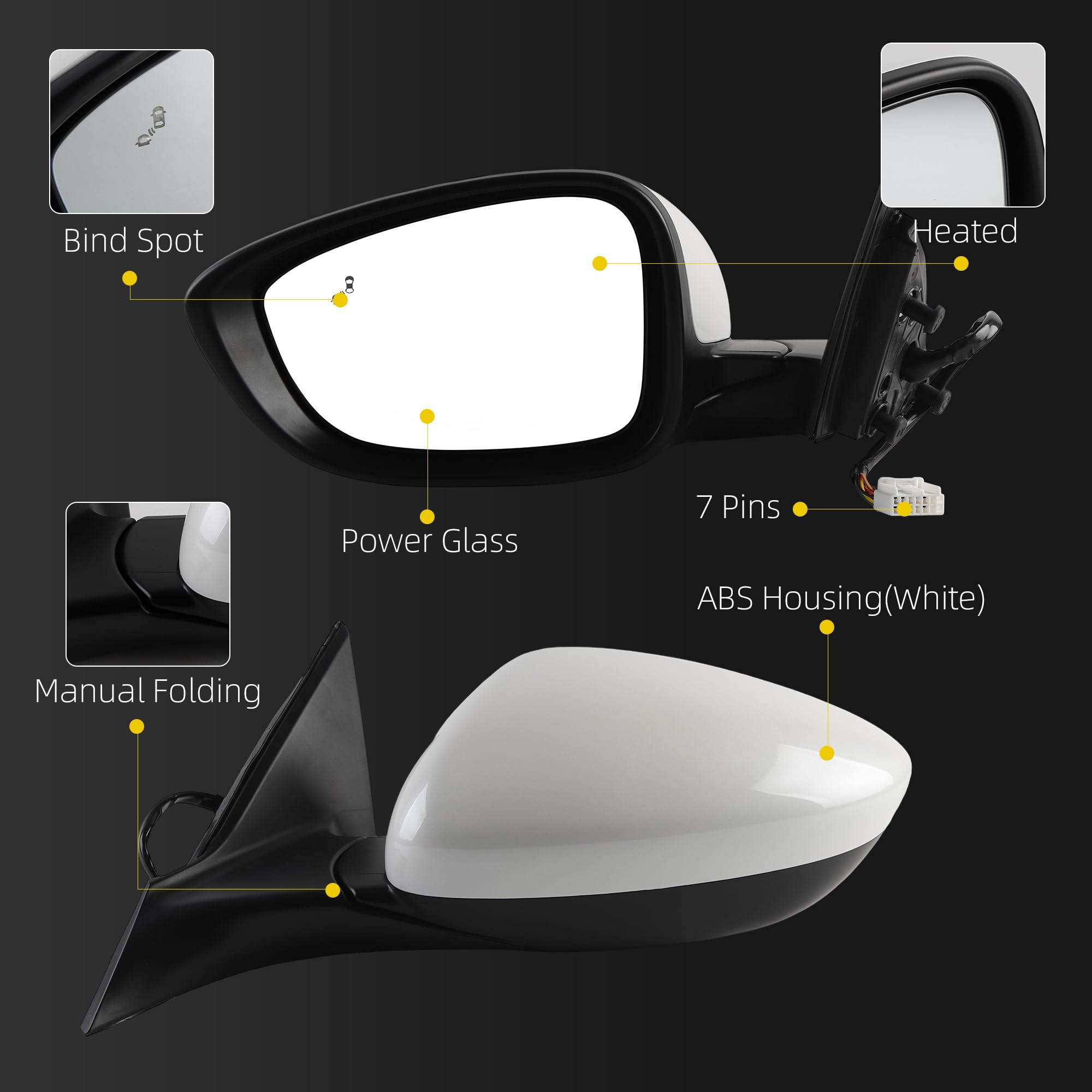 [Features] This White Door Mirror includes a 7-pin connector for plug-and-play installation, durable ABS housing comparable to OEM quality, power glass adjustment, and a manual folding design for space-saving when parked. It serves as a quick replacement for damaged or broken mirror units.