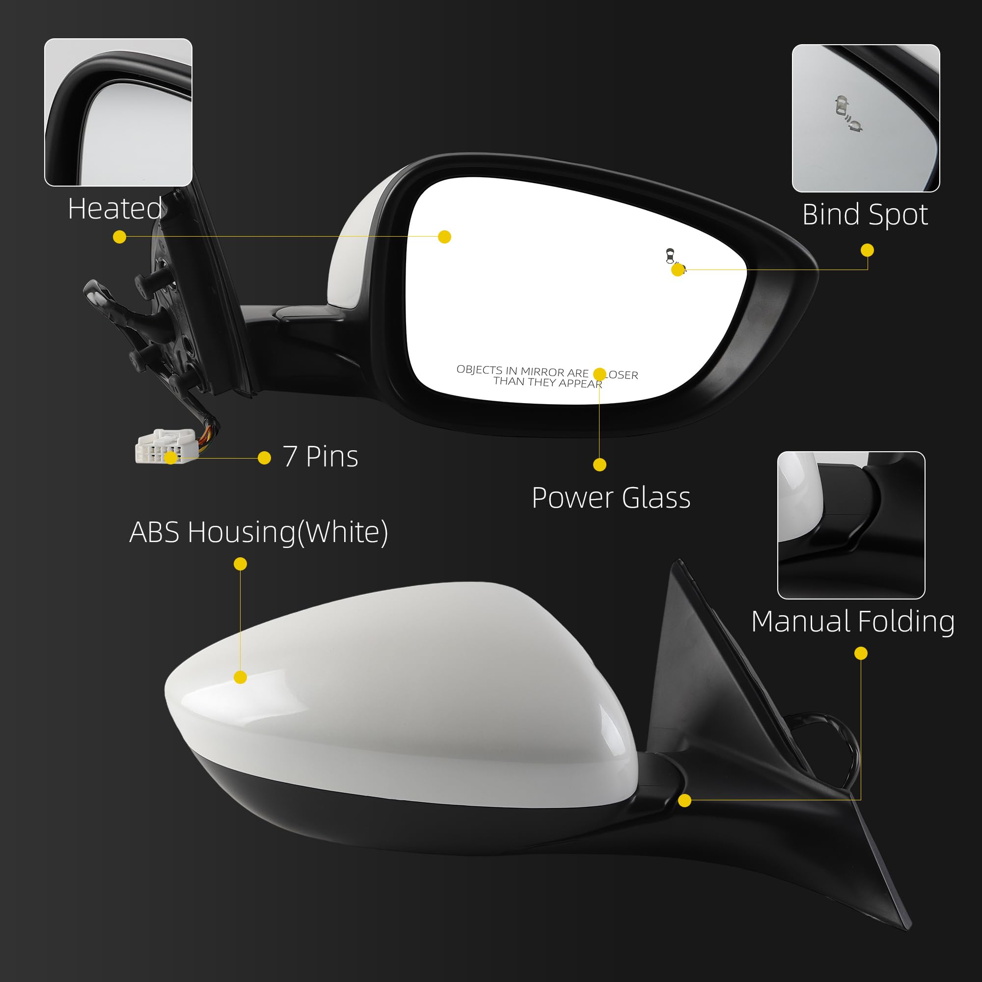 [Features] This white door mirror includes a 7-pin connector for plug-and-play installation, durable ABS housing comparable to OEM quality, power glass adjustment, and a manual folding design for space-saving when parked. It serves as a quick replacement for damaged or broken mirror units.