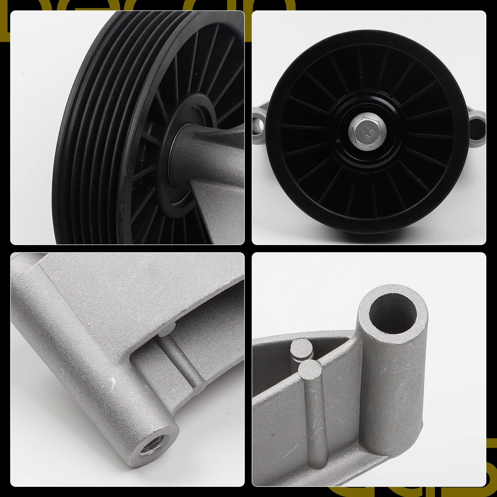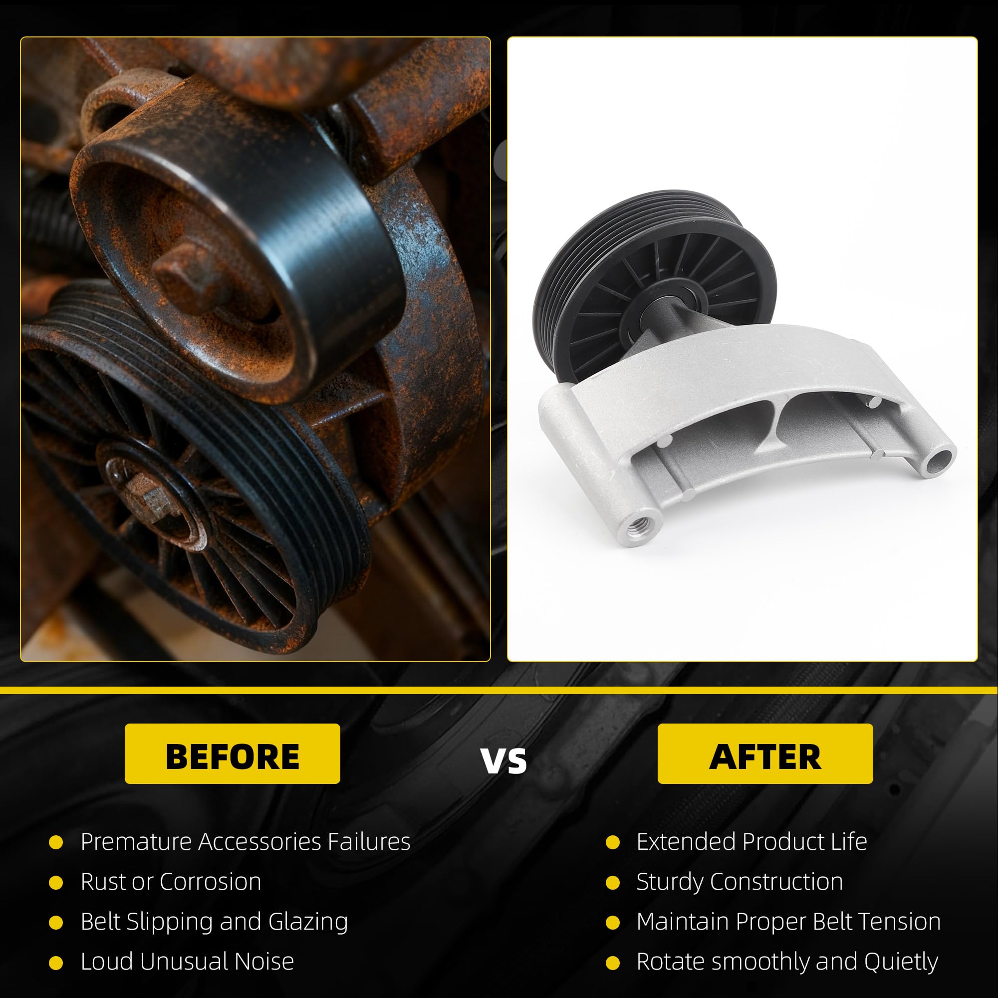 【Feature】The Bracket is precision-engineered to help correct misalignment in the engine's accessory belt system, which aids in reducing premature wear and promoting efficient operation. It includes an adjustable idler pulley that enables precise belt tensioning, contributing to smoother and quieter performance.
