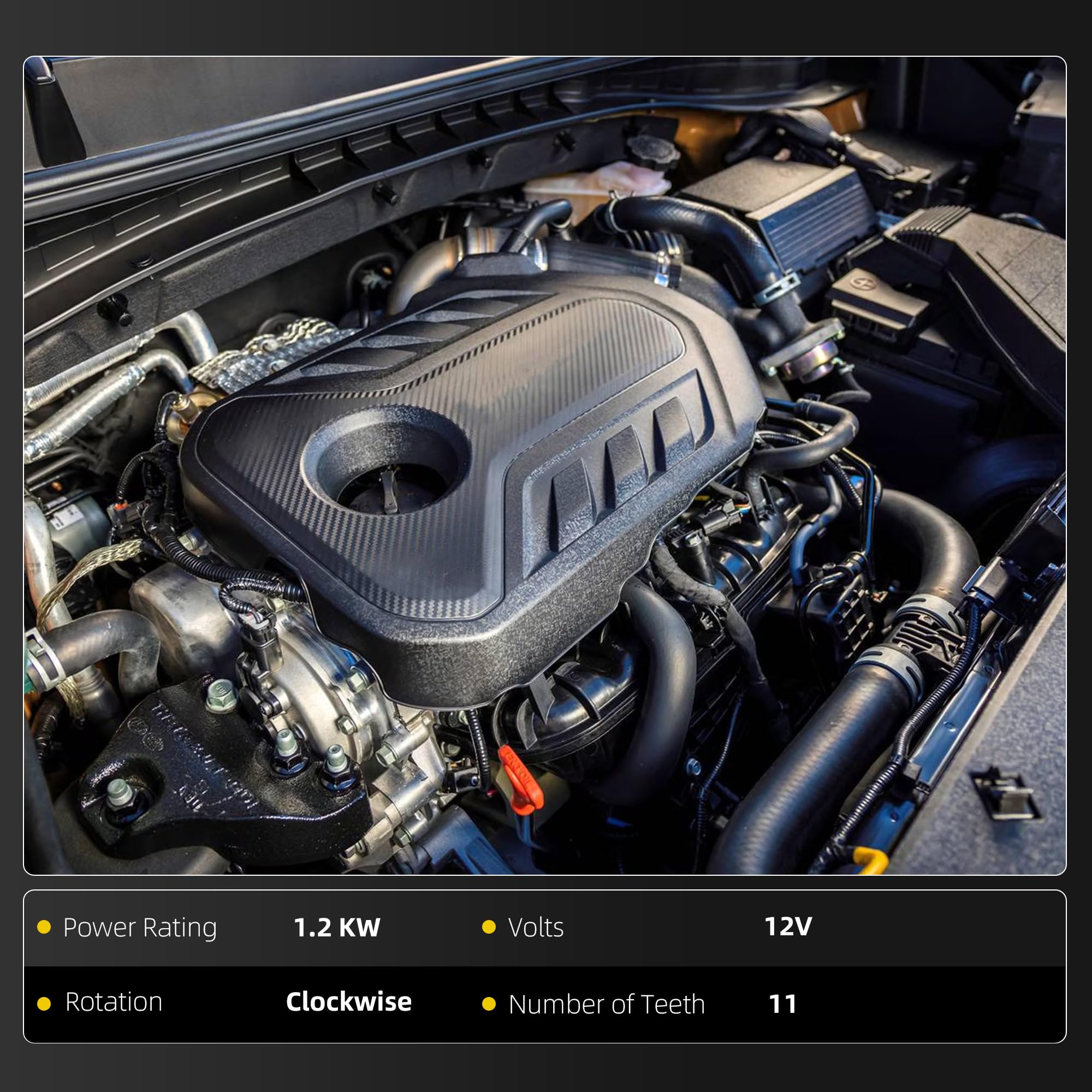 【Fitment】Our Starter Motor fits for Kia Optima 2016 L4 2.4L (Manufactured in Korea; Gas Only) , 2017-2018 L4 2.4L (Manufactured in Korea) ; Kia Sportage 2017-2021 L4 2.0L (Turbocharged), Sportage 2022 L4 2.0L; Kia Sportage 2017-2022 L4 2.4L ; Hyundai Tucson 2018-2021 L4 2.4L ; Hyundai Veloster N 2019-2022 L4 2.0L (From 12/03/2018) ; Hyundai Elantra N/Kona N 2022-2023 L4 2.0L (Turbocharged)