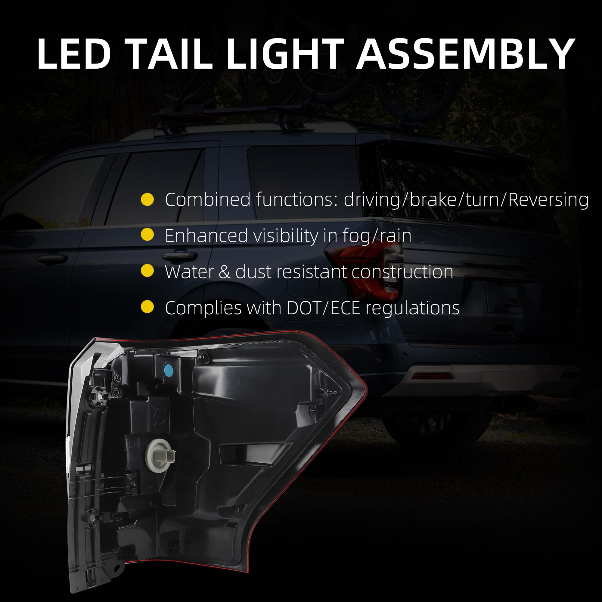 [Advantage]This Ford Expedition tail light is OEM standard,made of high quality materials,waterproof, dustproof,anti-fog and reliable.With bulb and wiring harness,direct installation.