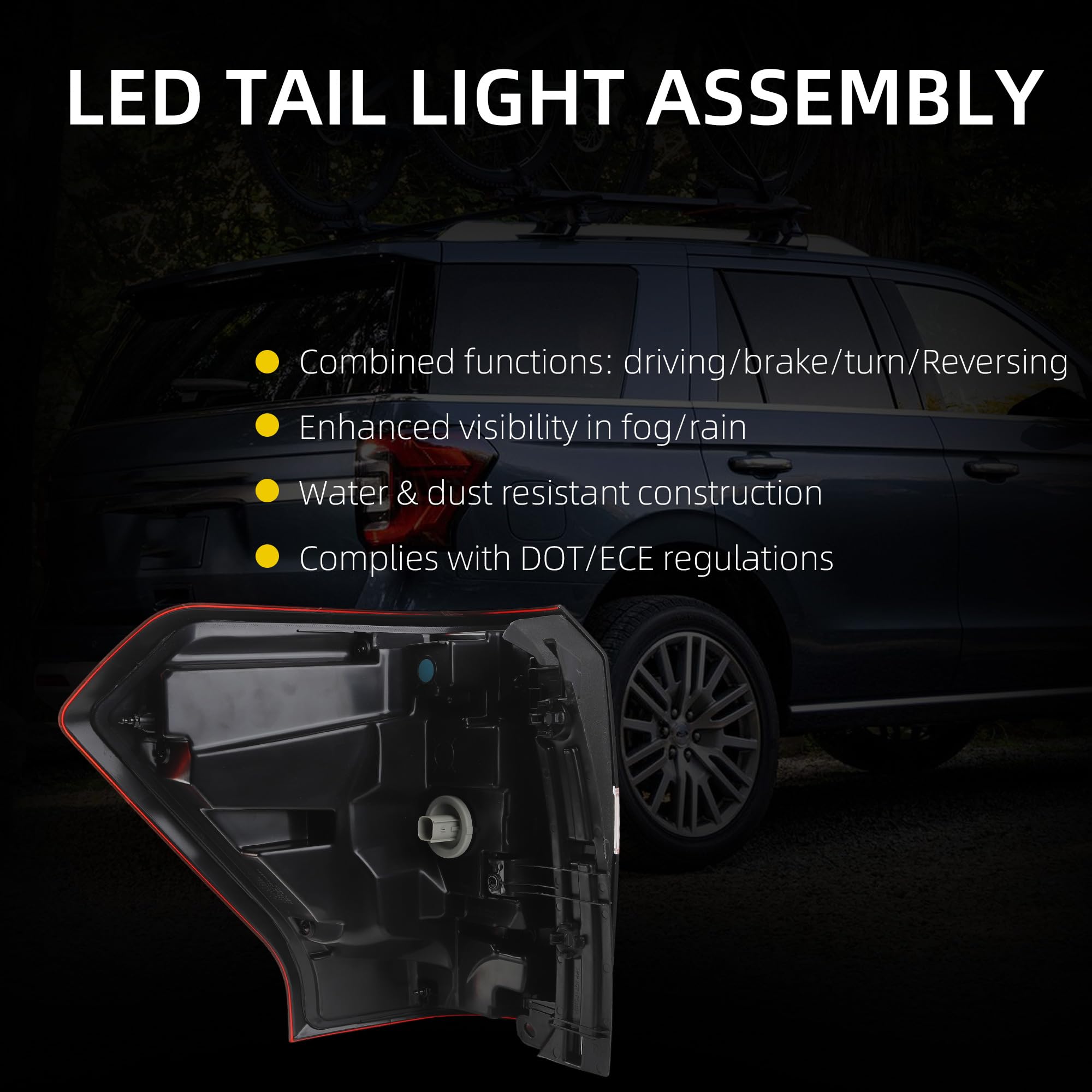 [Advantage]This Ford Expedition tail light is OEM standard,made of high quality materials,waterproof, dustproof,anti-fog and reliable.With bulb and wiring harness,direct installation.