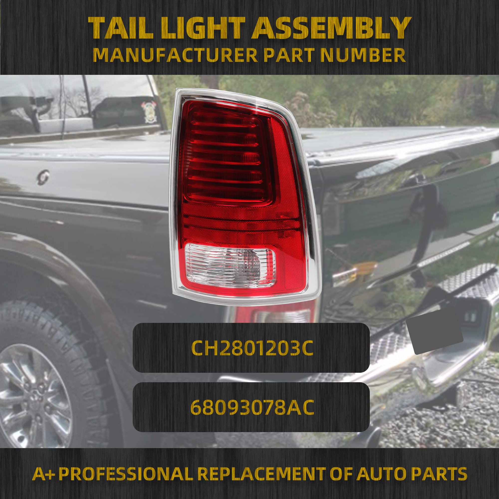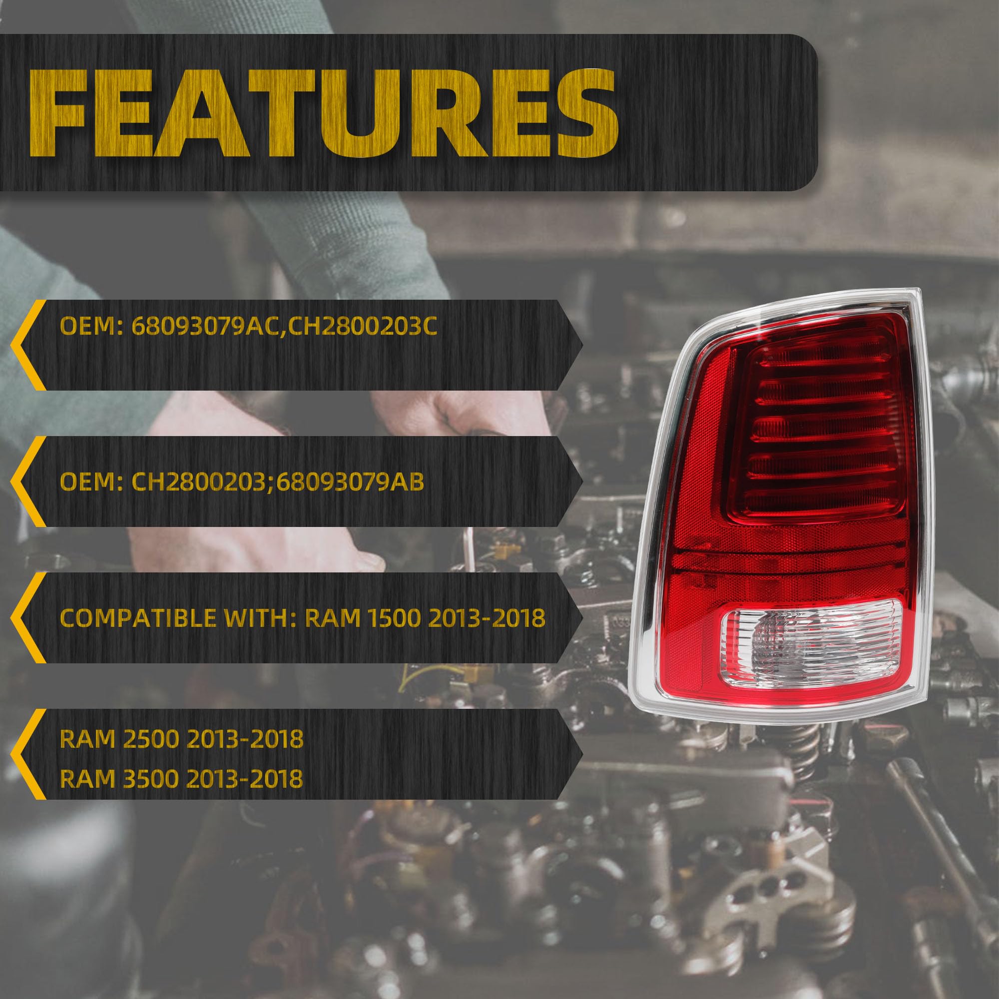 Compatible With: Dodge RAM 1500 2013-2018 / RAM 1500 Classic Warlock 2019-2022 / RAM 2500 & 3500 2014-2018 (Only compatible with LED tail light modes,not compatible with halogen tail light modes. Please pay attention to the connector picture before you make a purchase. If the connector does not match the OEM plug of your vehicle,then this tail light will not be compatible with your vehicle.)
