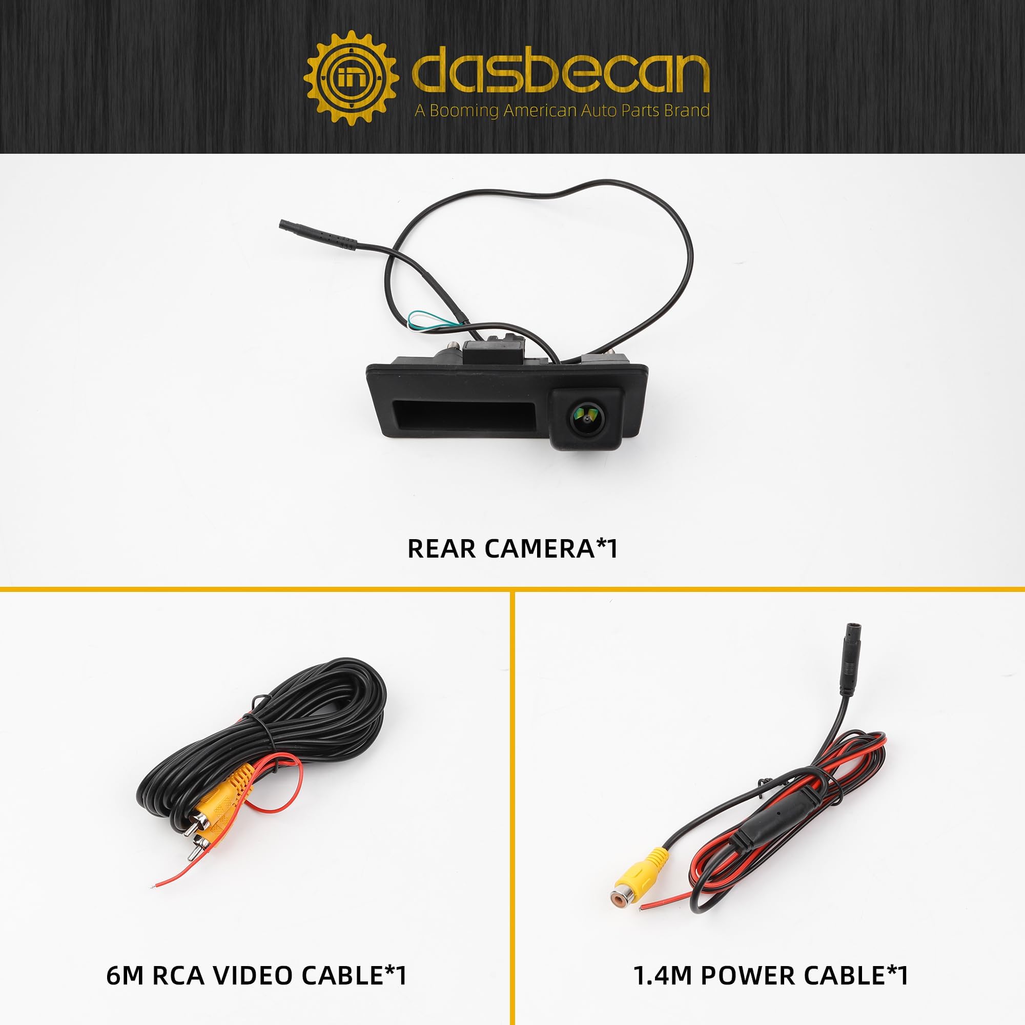 Packing list: Rear camera*1; 6m RCA video cable*1; 1.4m power cable*1