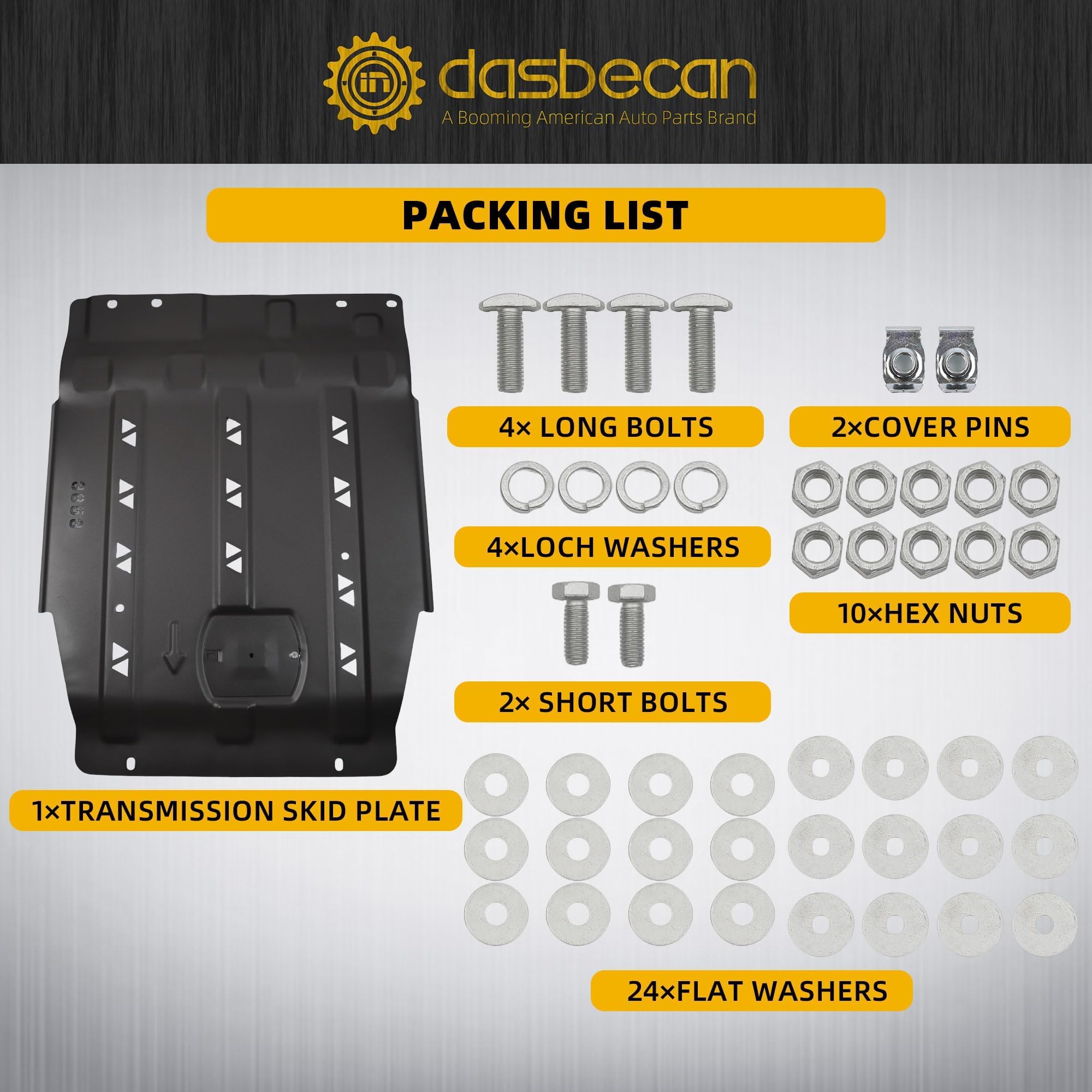 Packing list: 1PC*Transmission skid plate; 4Pcs* Long bolts; 4Pcs*Loch washers; 2Pcs*Cover pins; 2Pcs*Short bolts; 24*Flat washers; 10Pcs*Hex nuts
