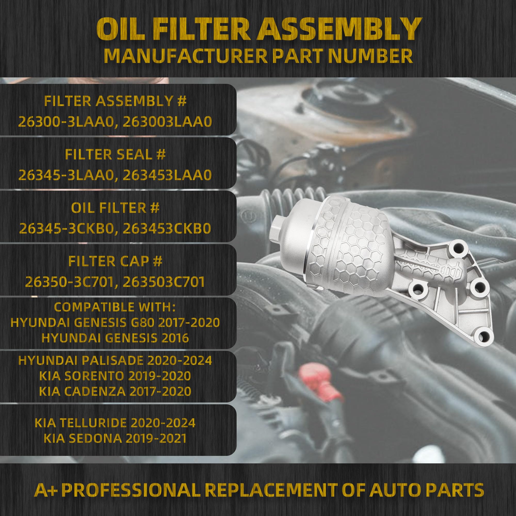 【Part Number Replacement】Filter assembly OE# 26300-3LAA0, 263003LAA0; Filter seal OE# 26345-3LAA0, 263453LAA0; Oil filter OE# 26345-3CKB0, 263453CKB0; Filter cap OE# 26350-3C701, 263503C701