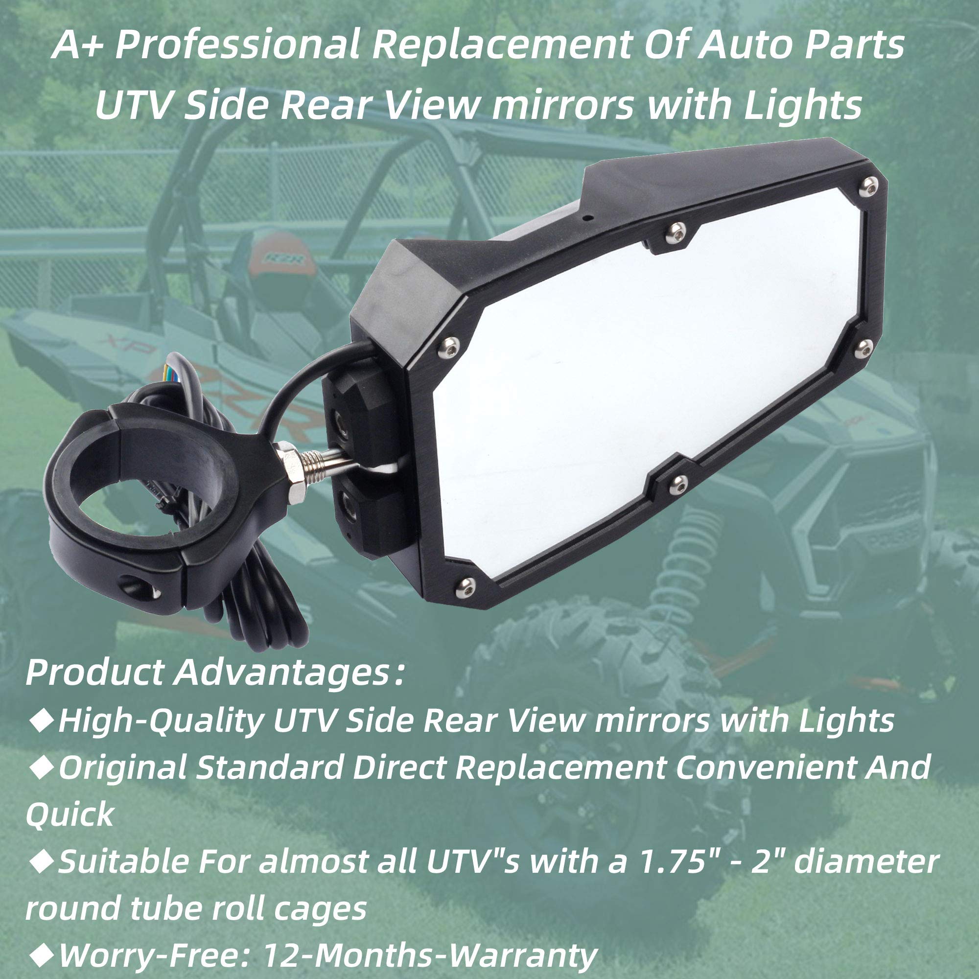 【Advantage】The utv mirrors with led lights has a unique light position design, which can light one lamp or two lamps together. The maximum angle of illumination is up to 195°, which can reduce the blind spot of night vision and improve safety.