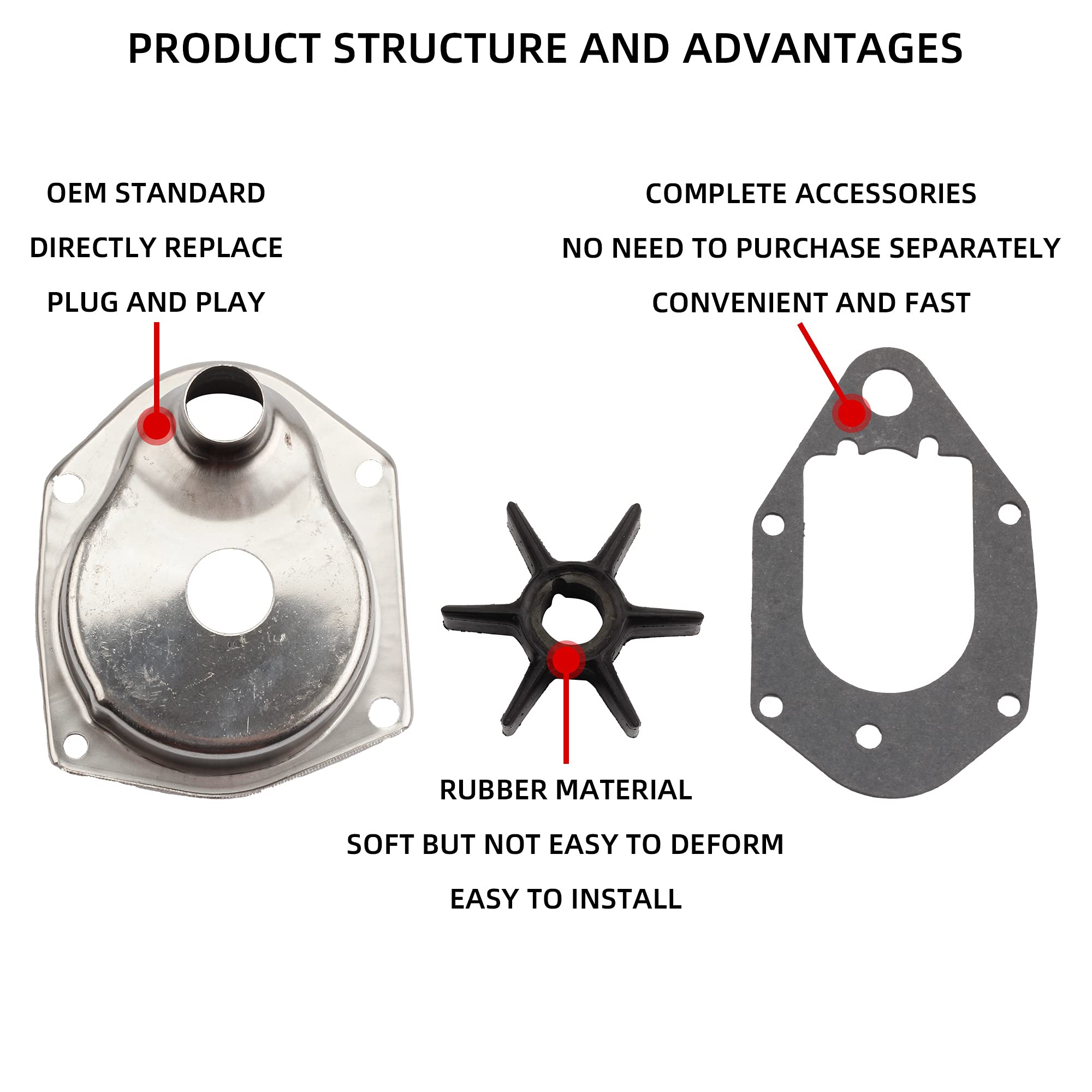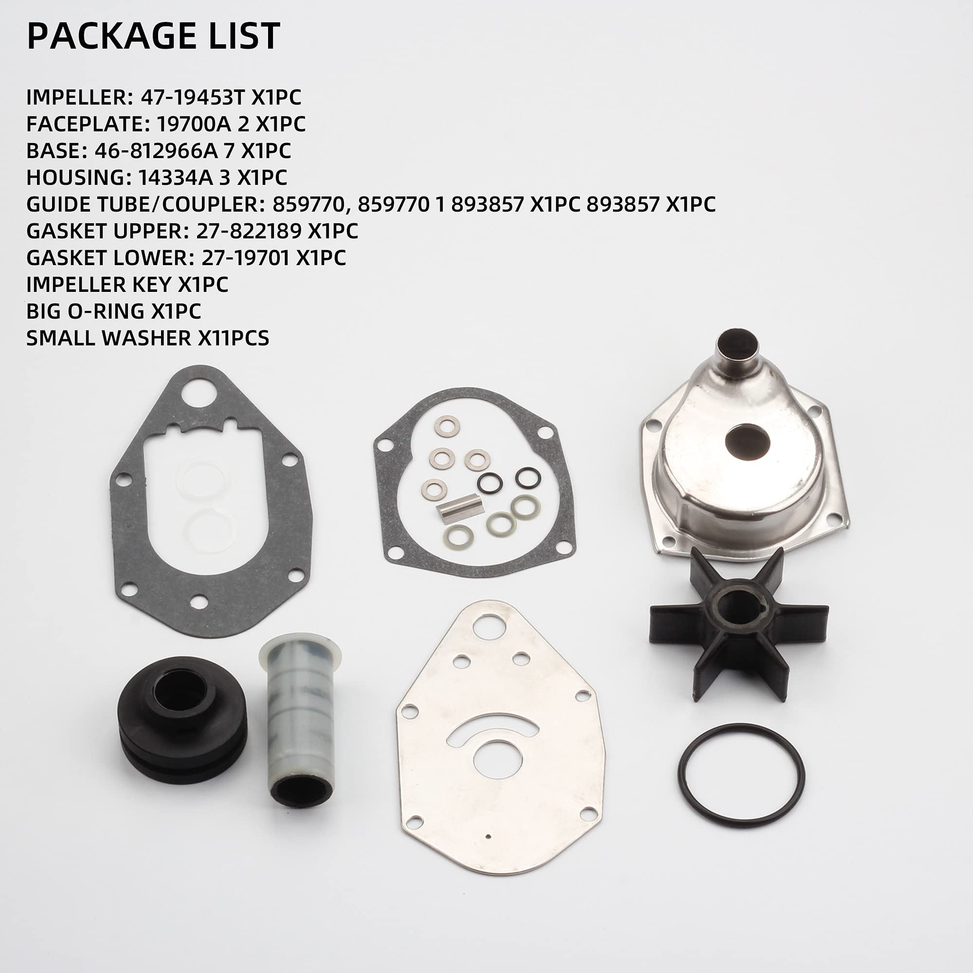 【Package list】 Impeller: 47-19453T x1pc Faceplate: 19700A 2 x1pc Base: 46-812966A 7 x1pc Housing: 14334A 3 x1pc Guide tube/Coupler: 859770, 859770 1 893857 x1pc : 893857 x1pc Gasket Upper: 27-822189 x1pc Gasket Lower: 27-19701 x1pc Impeller Key x1pc Big O-Ring x1pc Small Washer x11pcs