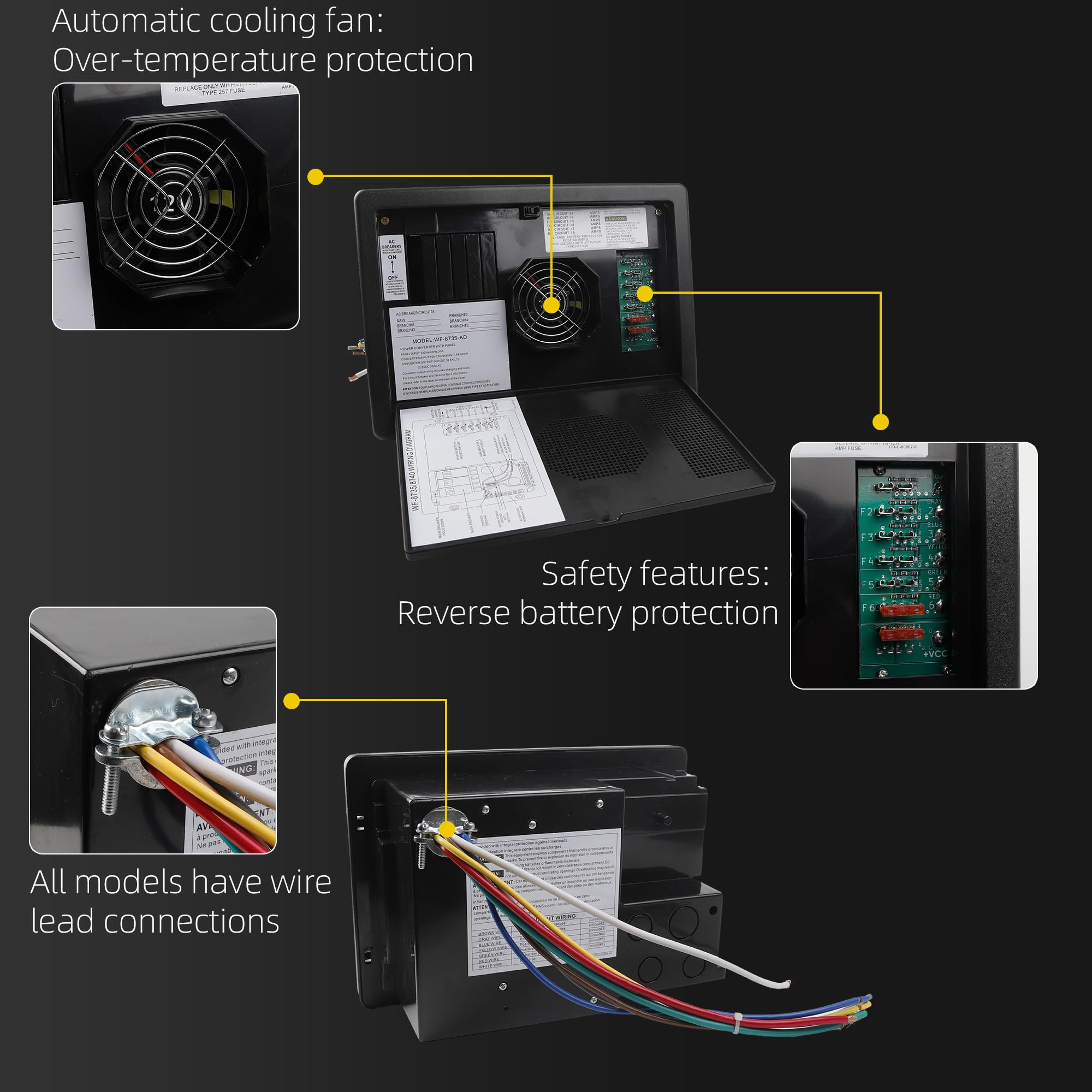 Plug-and-Play Replacement for Old RV Converter Models: Featuring standardized mounting holes and universal interfaces, the WF-8735-AD is an ideal 30 amp RV converter replacement for WF-8735-P, Centurion CS3000, and WFCO 8700 series. No professional wiring is needed—follow the included manual for quick setup, perfect for DIY trailer power center upgrades.