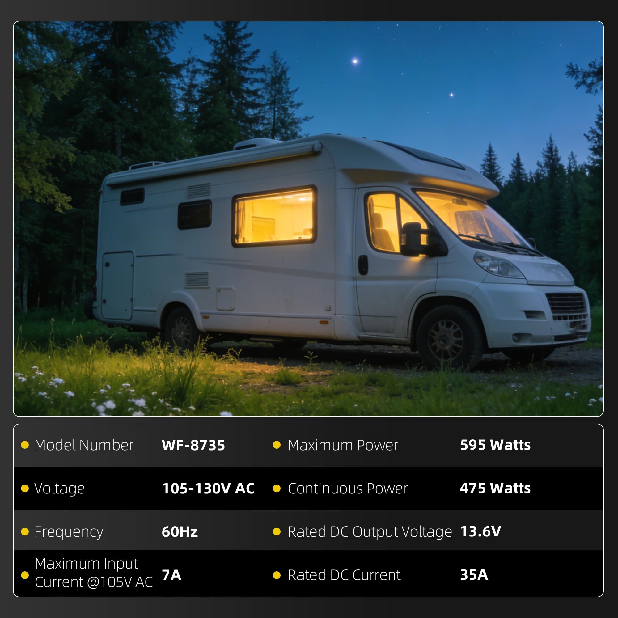 35A DC High Output for Full RV Electrical System Power: With 35 amp DC output (595W capacity) and 105-130VAC wide input, this RV converter charger can charge your RV battery and power on-board appliances (refrigerators, lights, water pumps) simultaneously. It delivers stable power for camper trailer, caravan, and popup camper setups, eliminating camping power shortages.