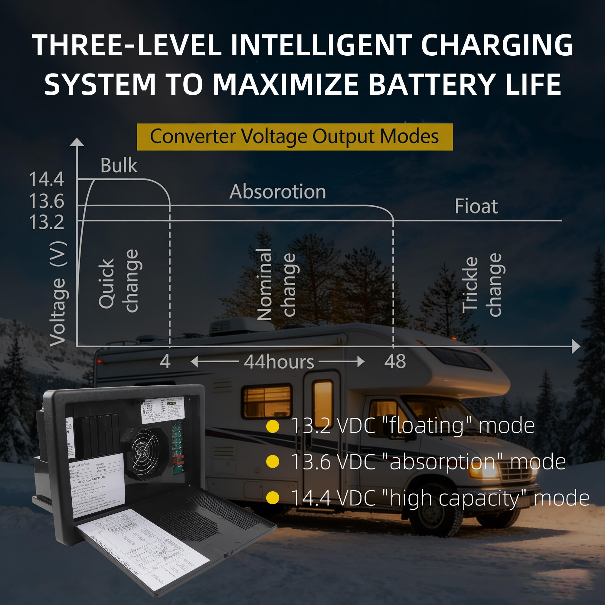 Auto-Detect Battery Type & 3-Stage Charging for RV Battery Care: As a professional WF-8735-AD RV battery charger of the WFCO 8700 series, this 30 amp RV power converter intelligently detects lead-acid and AGM batteries. It auto-activates 3-stage charging (14.4V bulk, 13.6V absorption, 13.2V float) to boost charging efficiency and extend battery lifespan, serving as a top-tier smart RV power center.