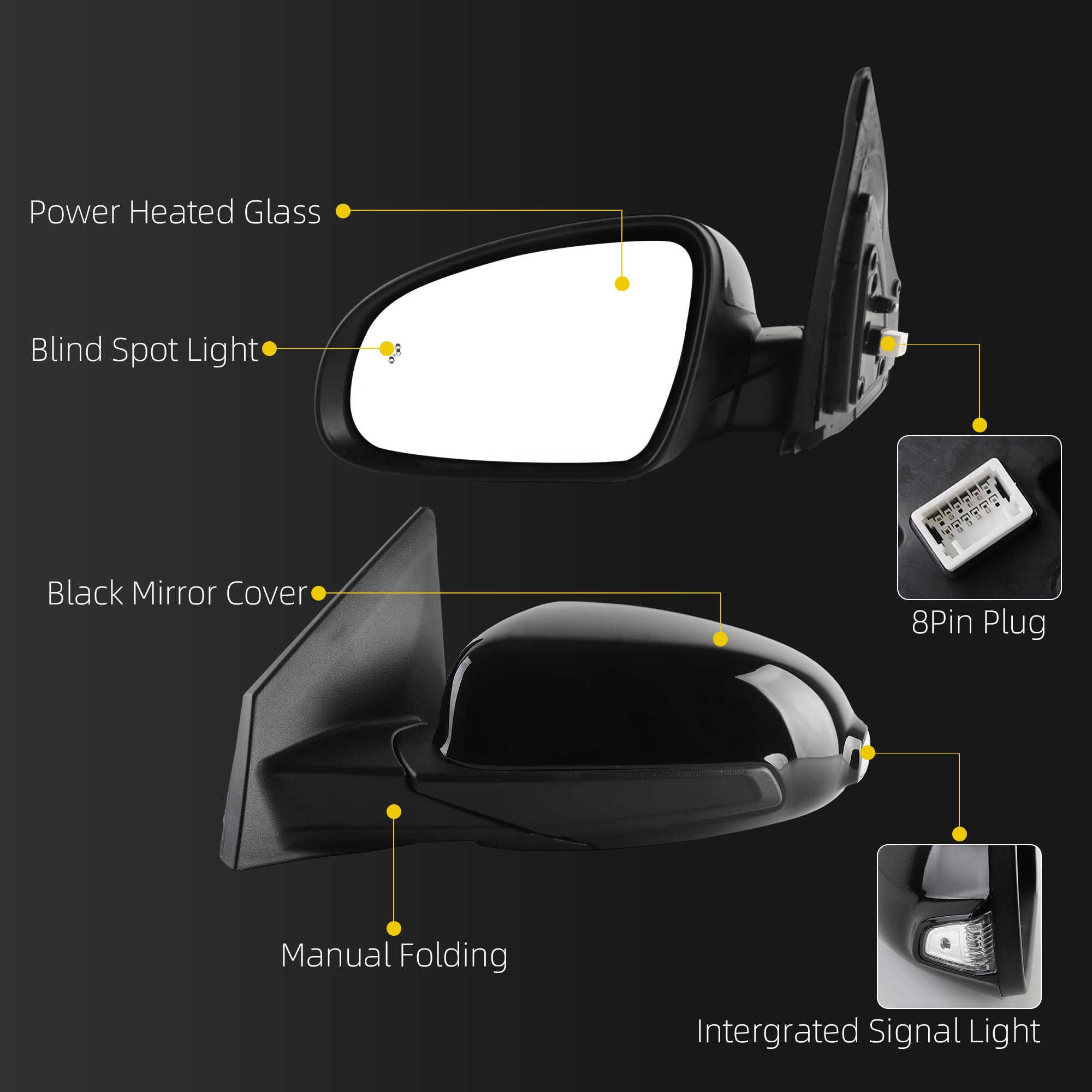 【Excellent Performance】Power Adjust Glass, Heated Glass, Manual Folding, Intergrated Signal Light, Blind Spot Light, Black Mirror Cover