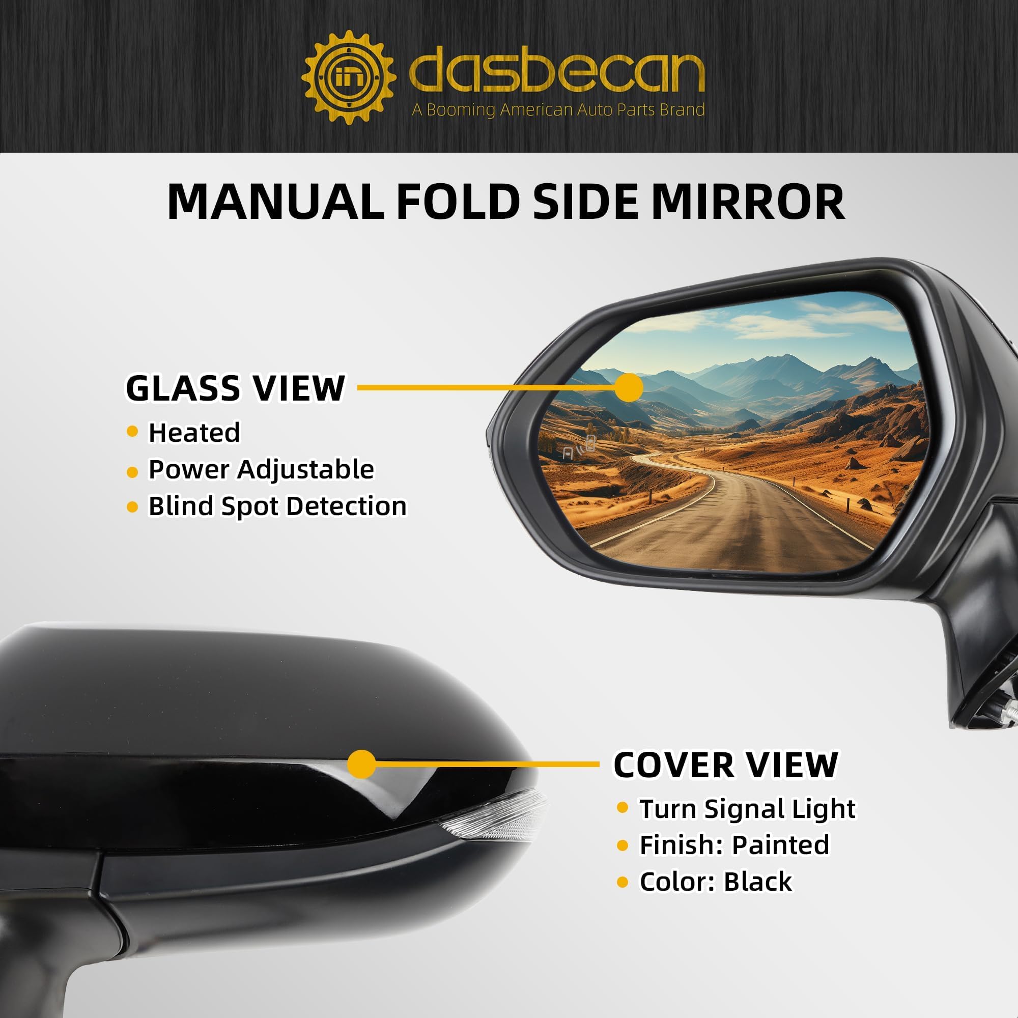 [Fuction] Manual Folding ((NOT FIT FOR POWER FOLDING!!! ) , Power Adjustment Mirror Glass, With Heating, With BSD (Blind Spot Detection), With Turn Signal.