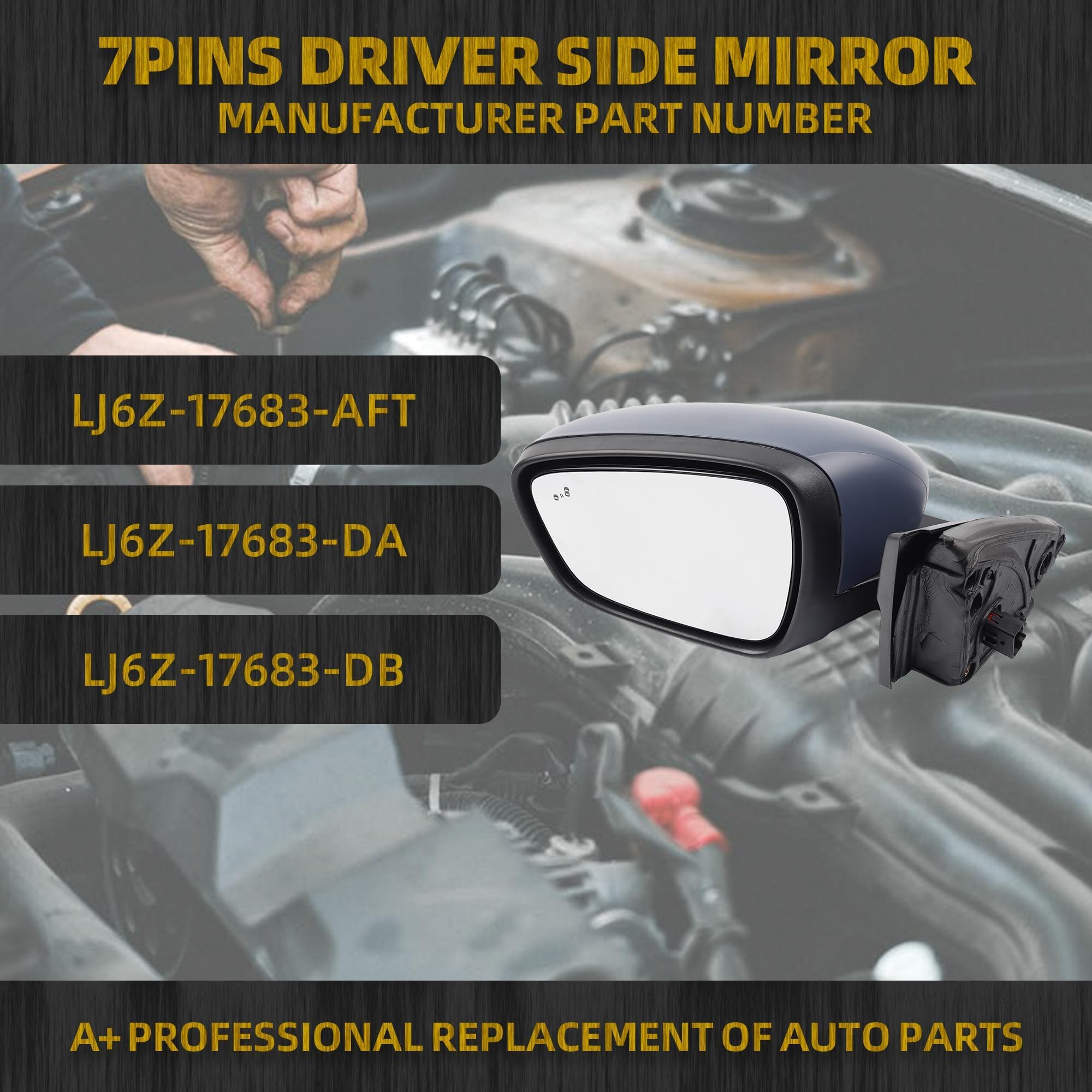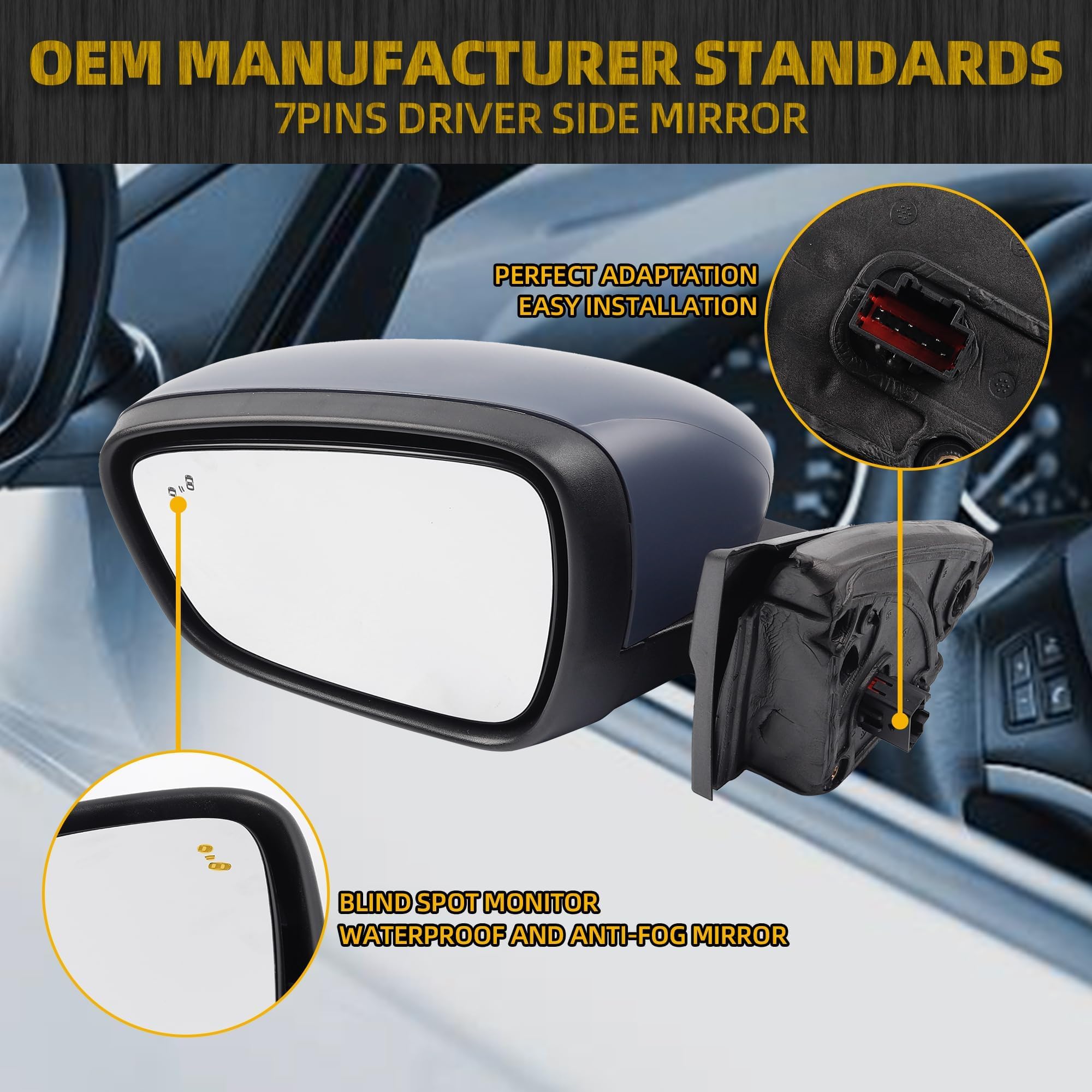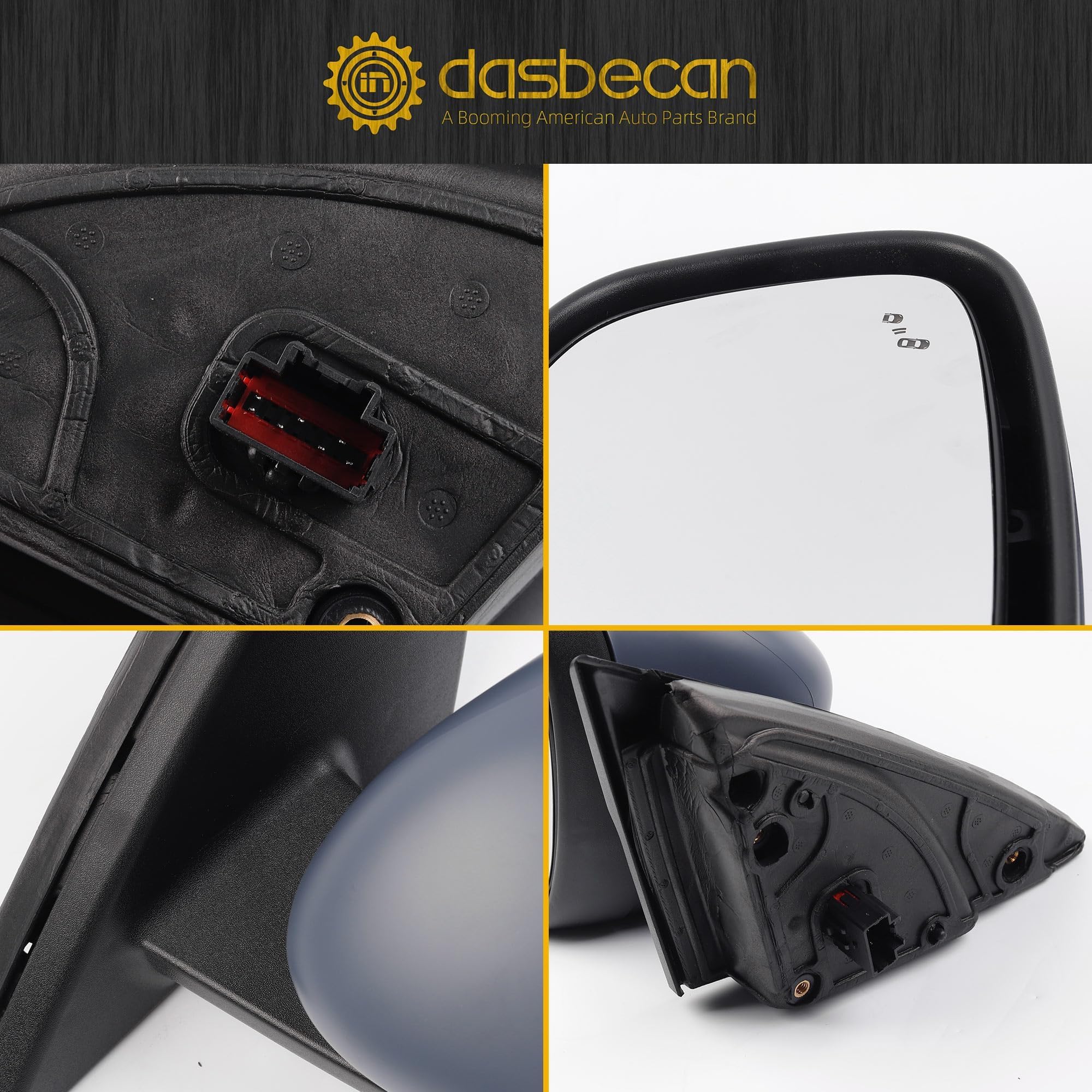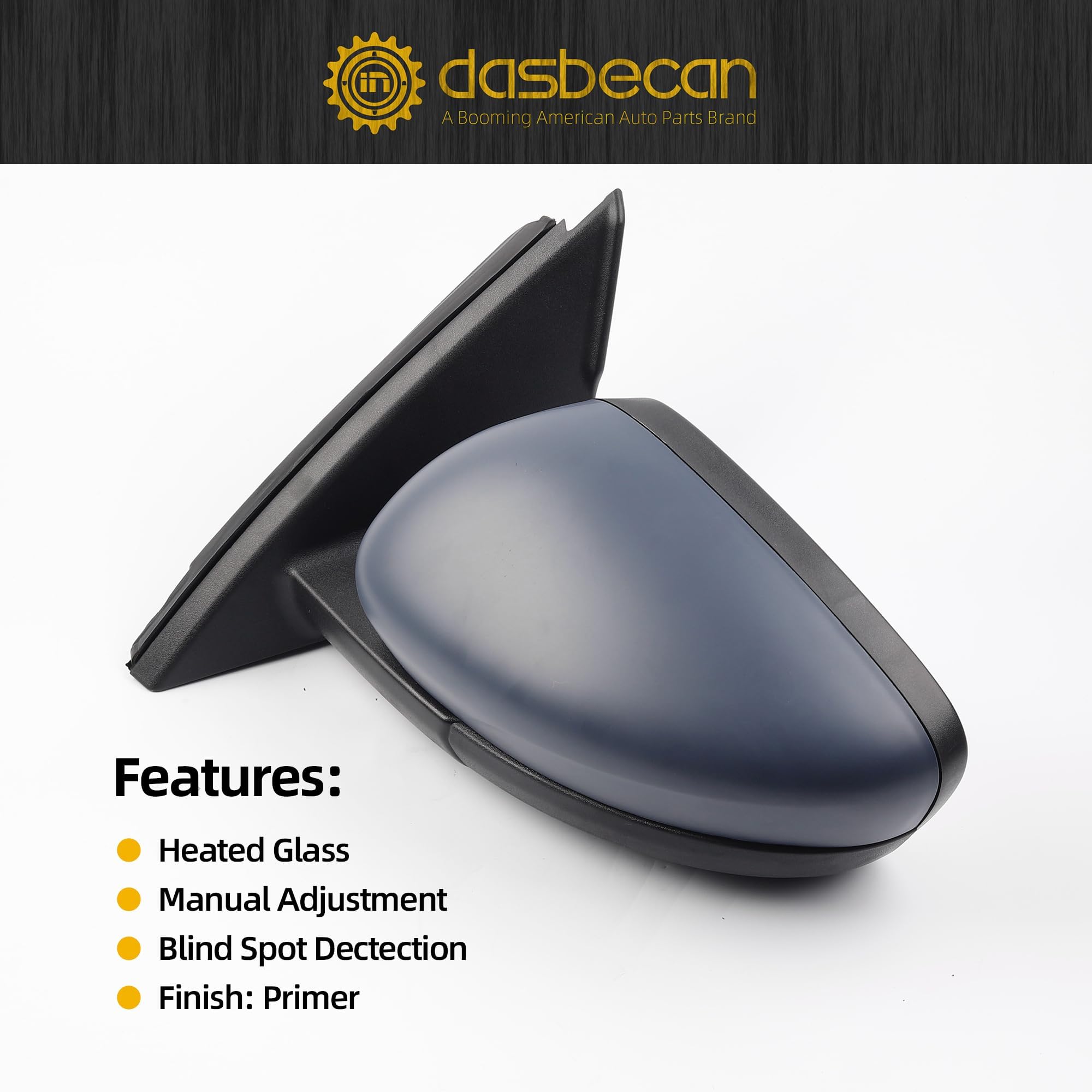 Feature: Power Adjustable Glass, with Heated, with Blind Spot Dectection BSD, 7 Pins Connector. The top cover cap is primed and can be DIY painted to match.