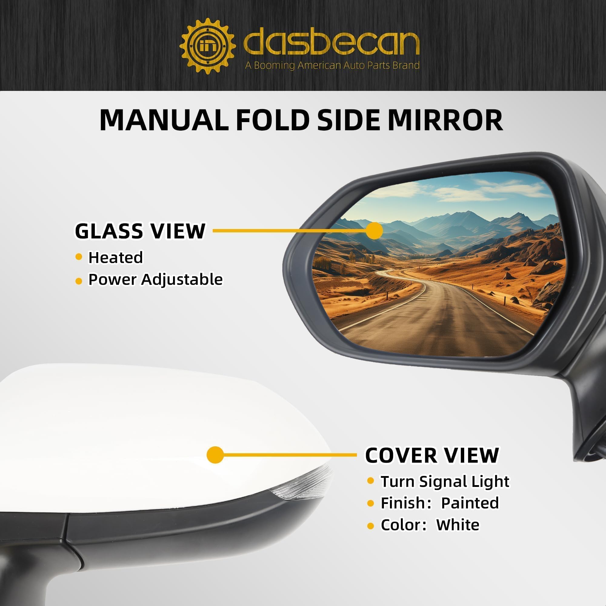 [Specifications] Position: Front Left Driver Side; Color: White ( Paint to Match ) ; Plug Configuration: 6 Wires/Pins. Fuction: Manual Folding, power Adjustment, With Signal, With Heating.