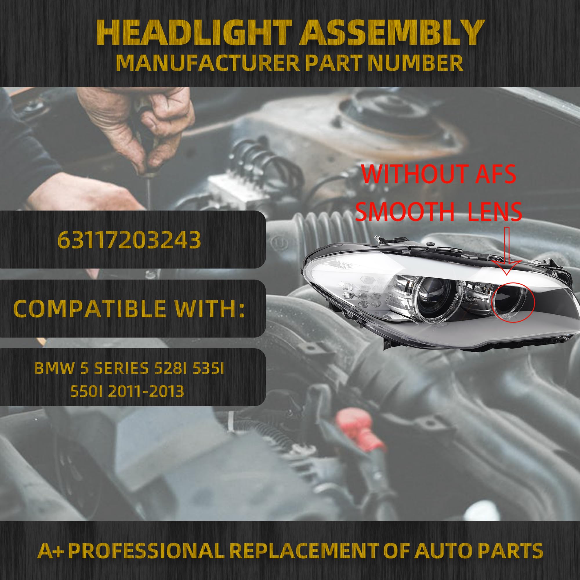 Compatible With: 2011-2013 BMW 5 Series 528i 535i 550i M5 Replace# 63117203243 (NOT Compatible with Factory Halogen Models. NOT Compatible with 2011- 2013 BMW 5 Series 528i 535i 550i M5 F10 F18 HID/Xenon W/AFS model)