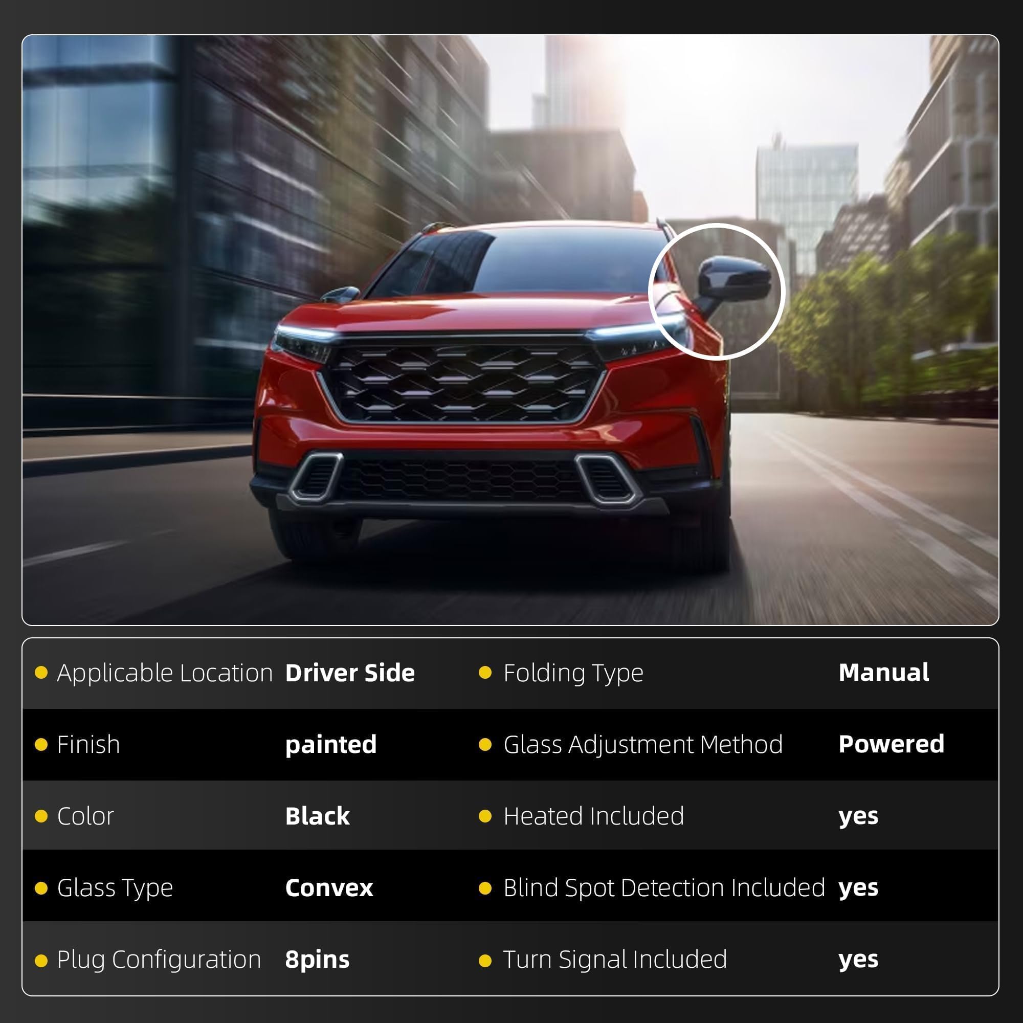 Specification: Driver Left Side | Convex | Manual folding | Power Glass | Turn Signal Indicator | Blind Spot Detection | Heated | 8Pins | Black