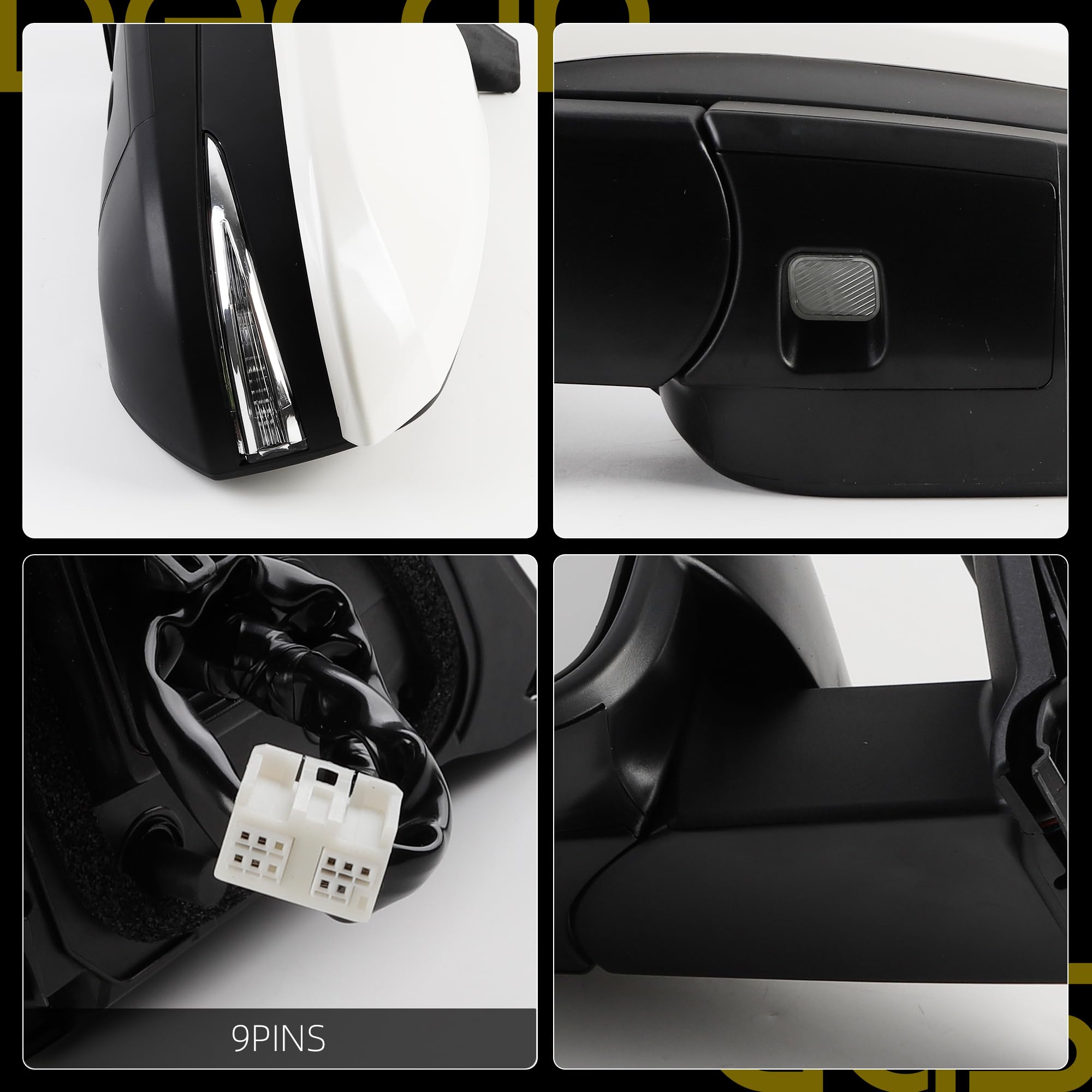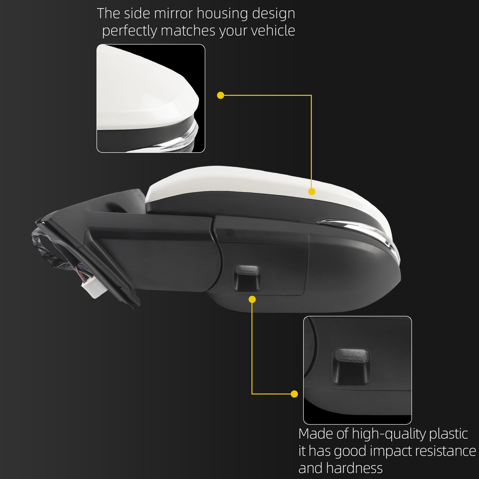 [Specifications] Position: Front Left Driver Side; Color: White ( Paint to Match ) ; Plug Configuration: 9 Wires/Pins; Fuction: Manual Folding, Power Adjustment, with Heated, with Turn Signal Light, with Puddle Light.