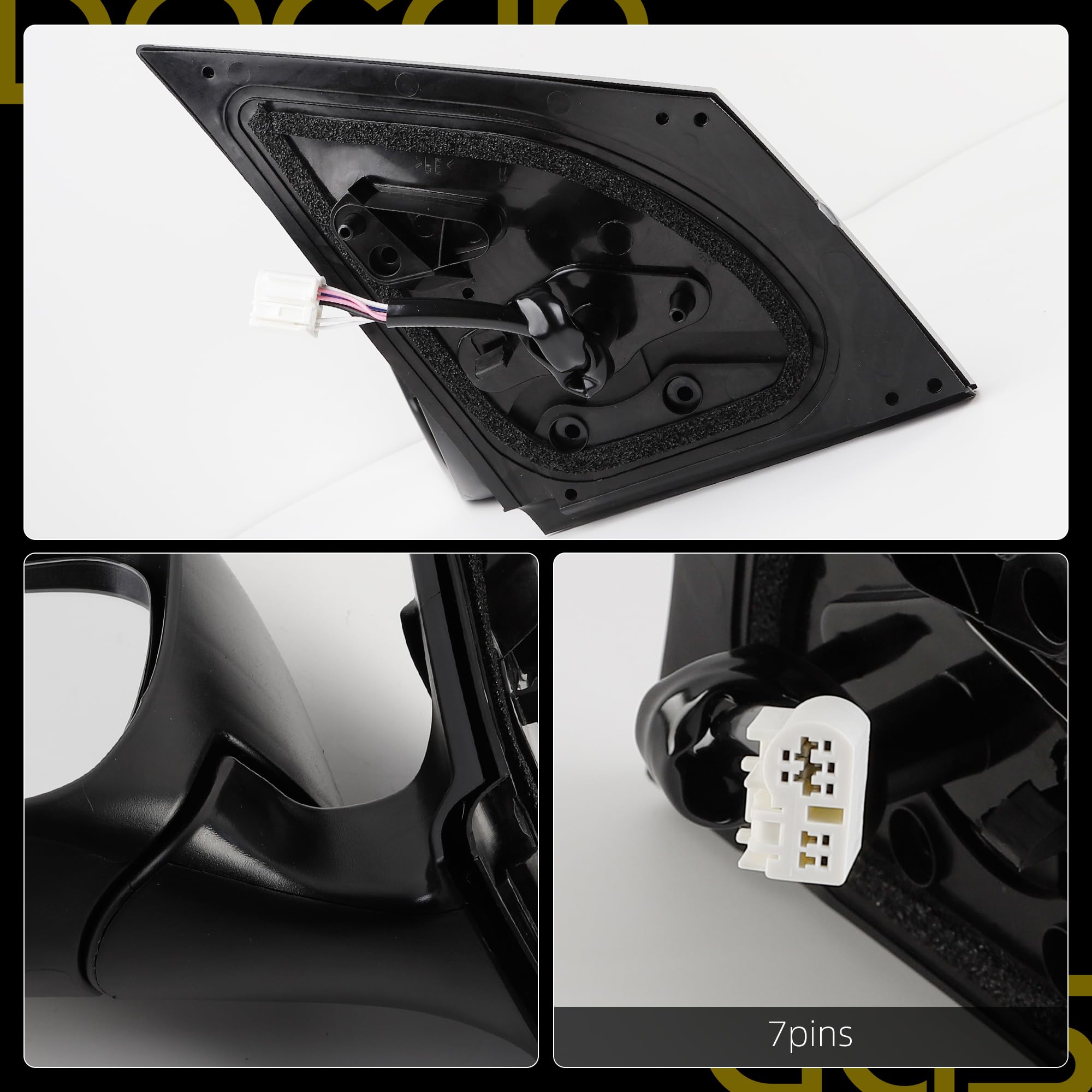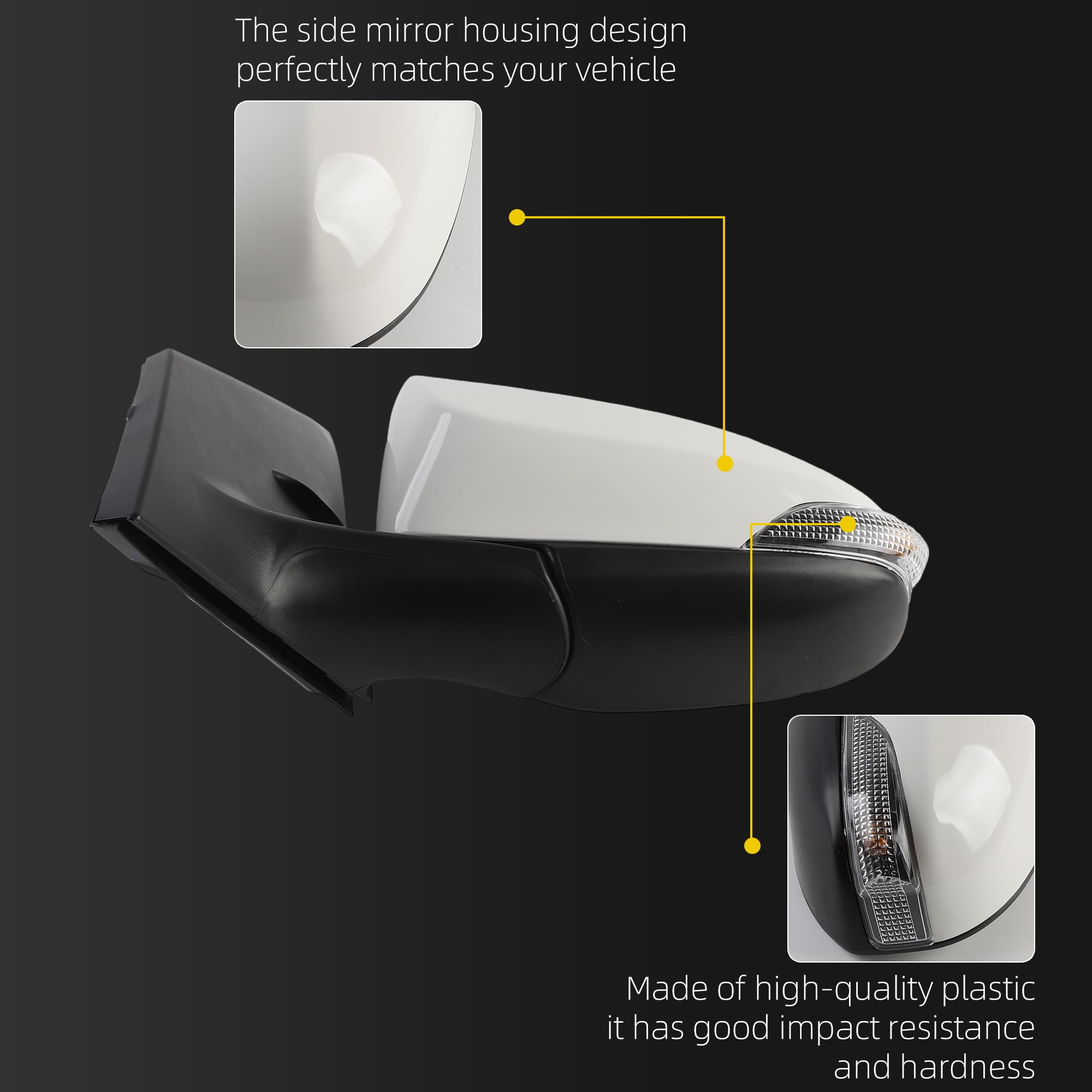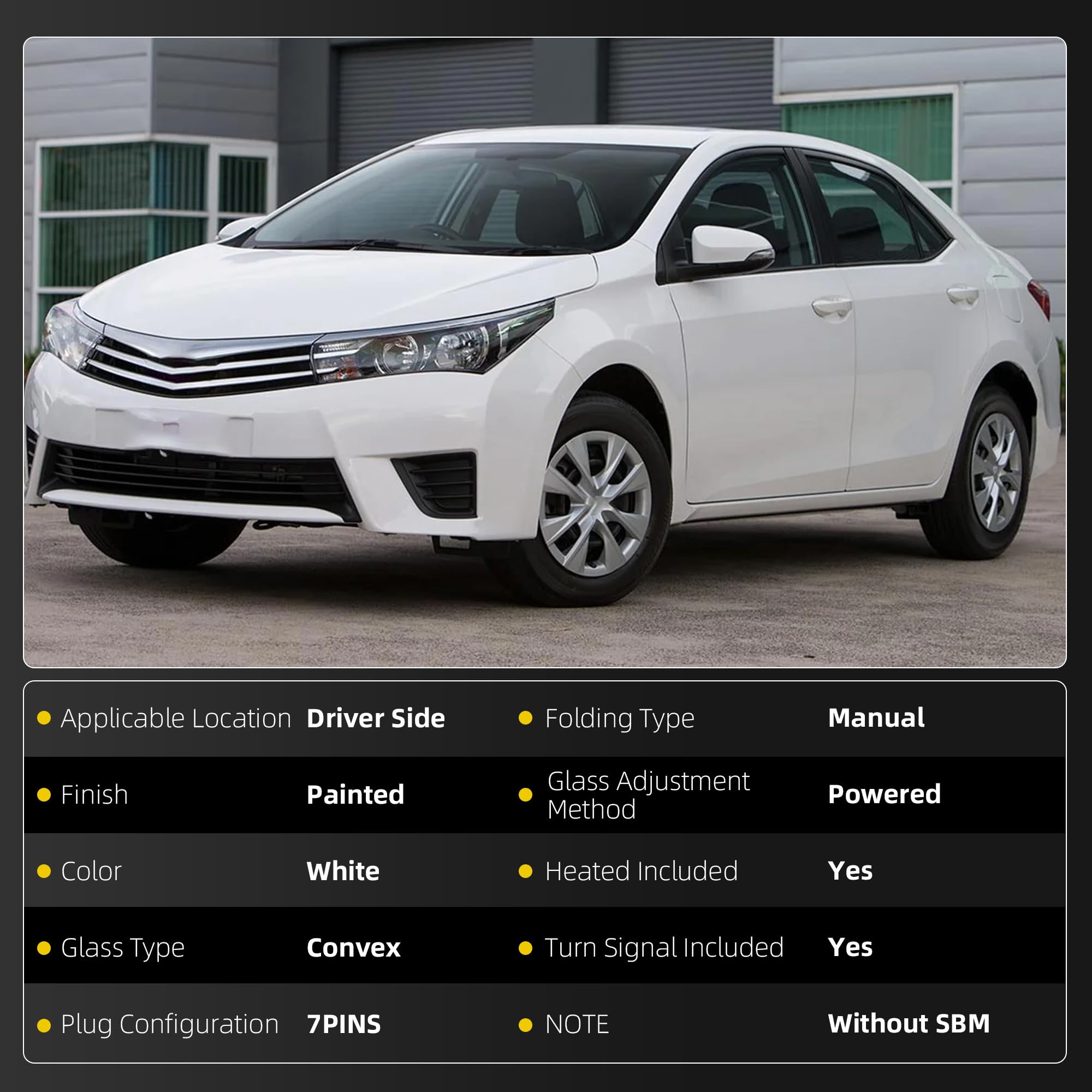 [Specifications] Position: Front Left Driver Side; Color: White ( Paint to Match ) ; Plug Configuration: 7 Wires/Pins; Fuction: Manual Folding, Power Adjustment, with Heated, with Turn Signal.