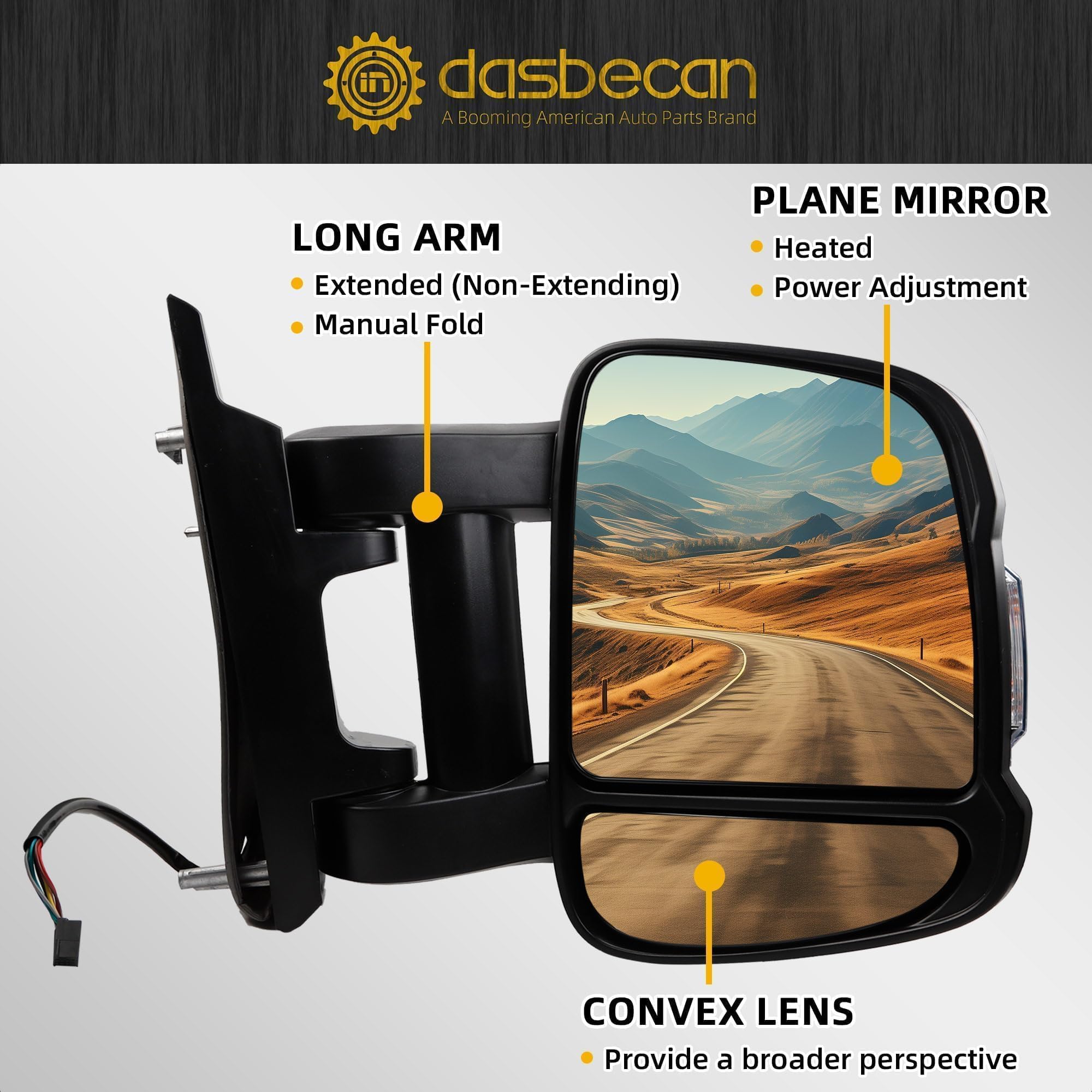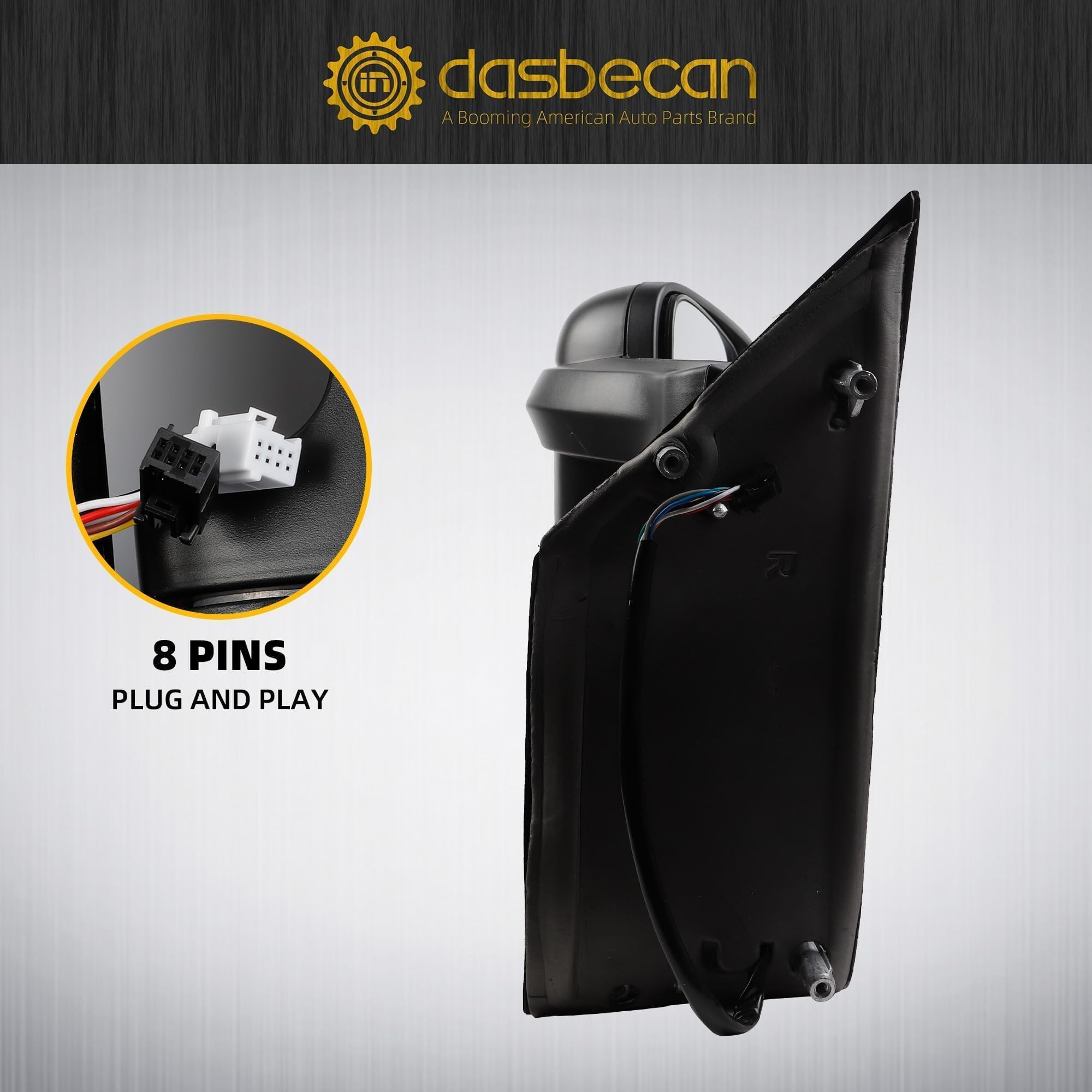 Important parameters: This is an aftermarket replacement product that includes heating, manual folding, power adjustable glass, turn signal, long arm function, consisting of 8 wires.