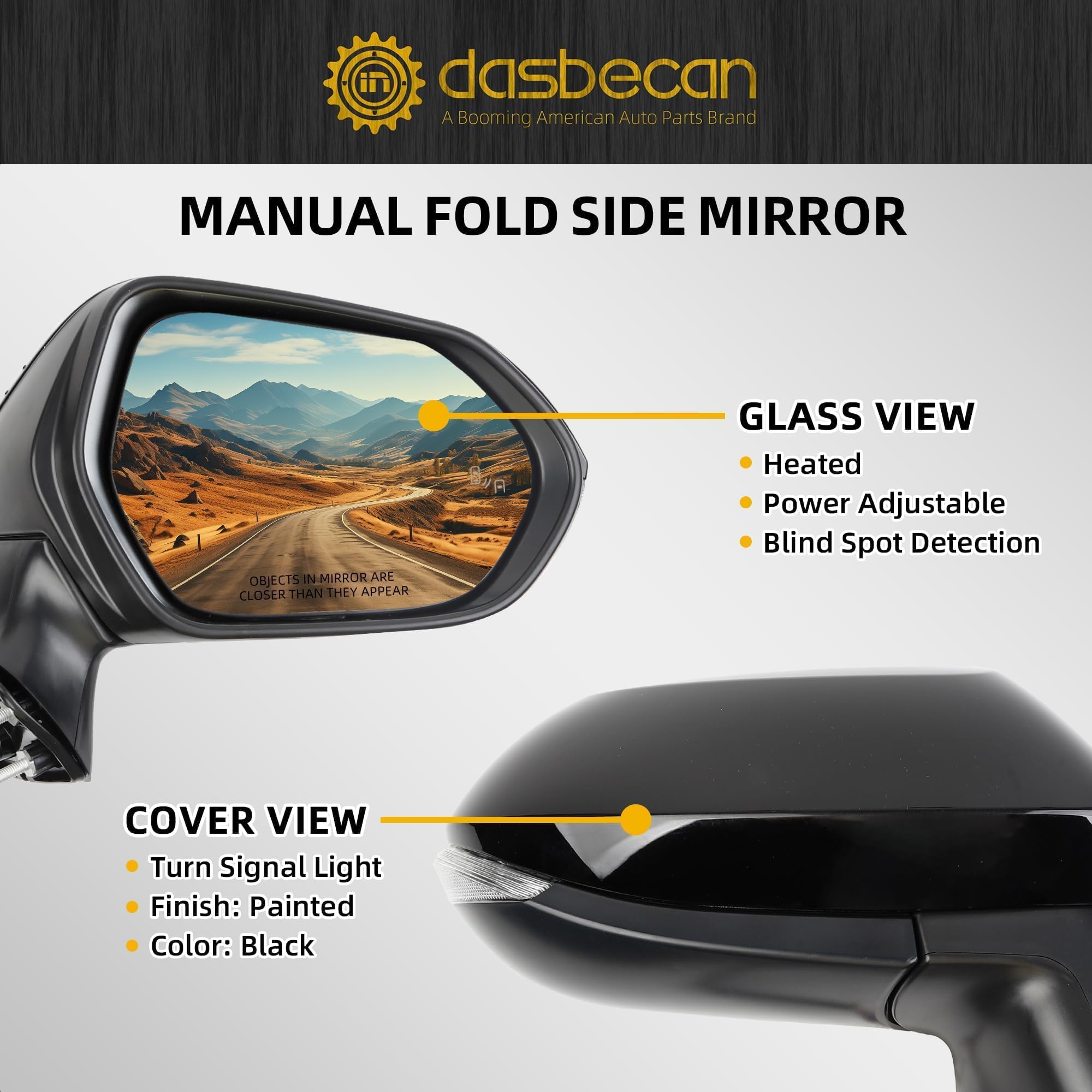 [Specifications] Position: Front Right Passenger Side; Color: Black ( Paint to Match ) ; Plug Configuration: 7 Wrie / Pins. Fuction: Manual Folding (NOT FIT FOR POWER FOLDING), Power Adjustment Glass, With BSD (Blind Spot Detection), With Turn Signal, With Heating.