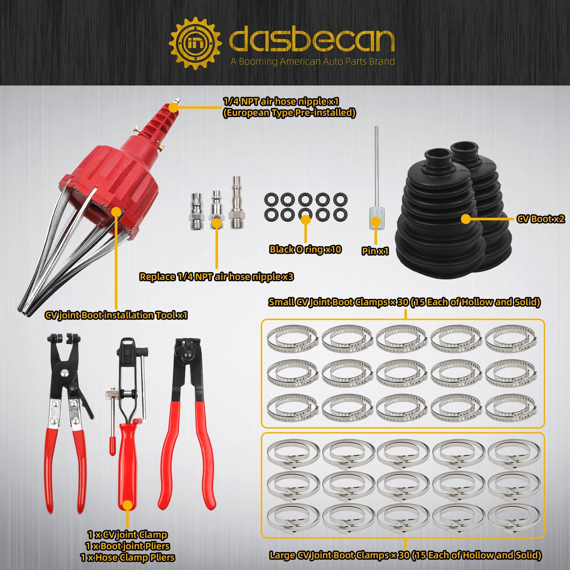 Complete Installation Kit: Includes CV joint boot installation tool, 2 CV boots, air hose nipples, O-rings, clamps, pins, and pliers, plus 60 CV joint boot clamps (30 small, 30 large) for a full and reliable repair solution.