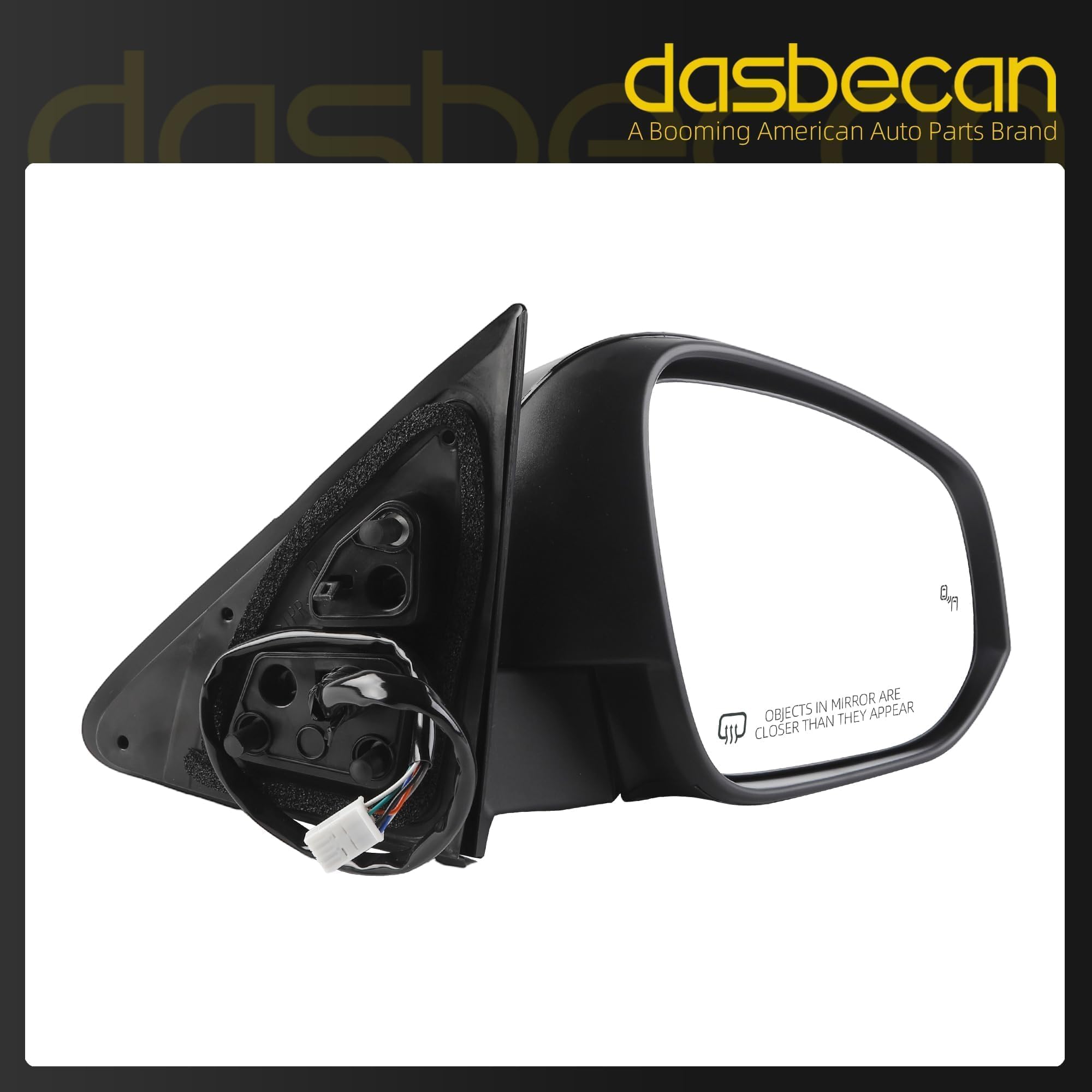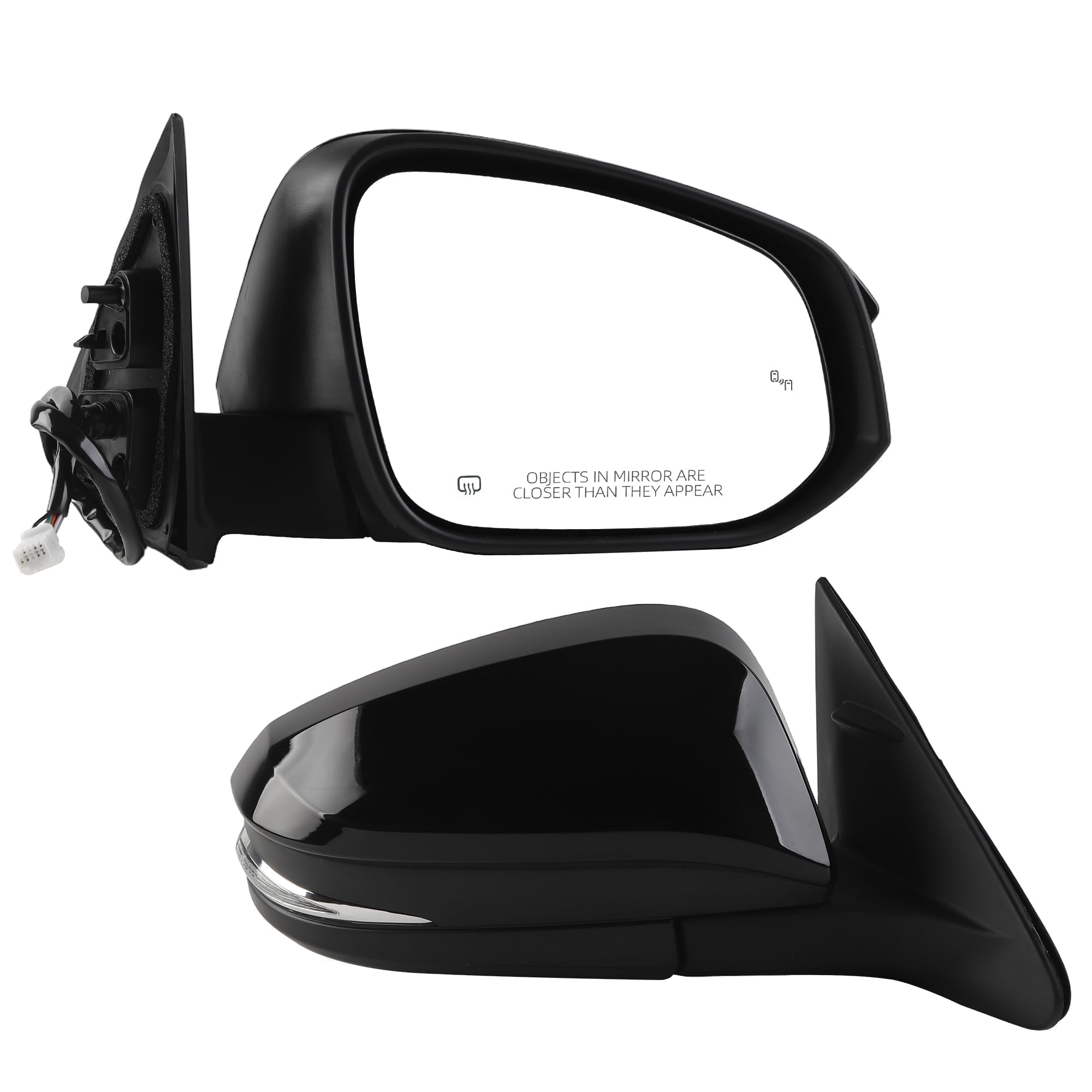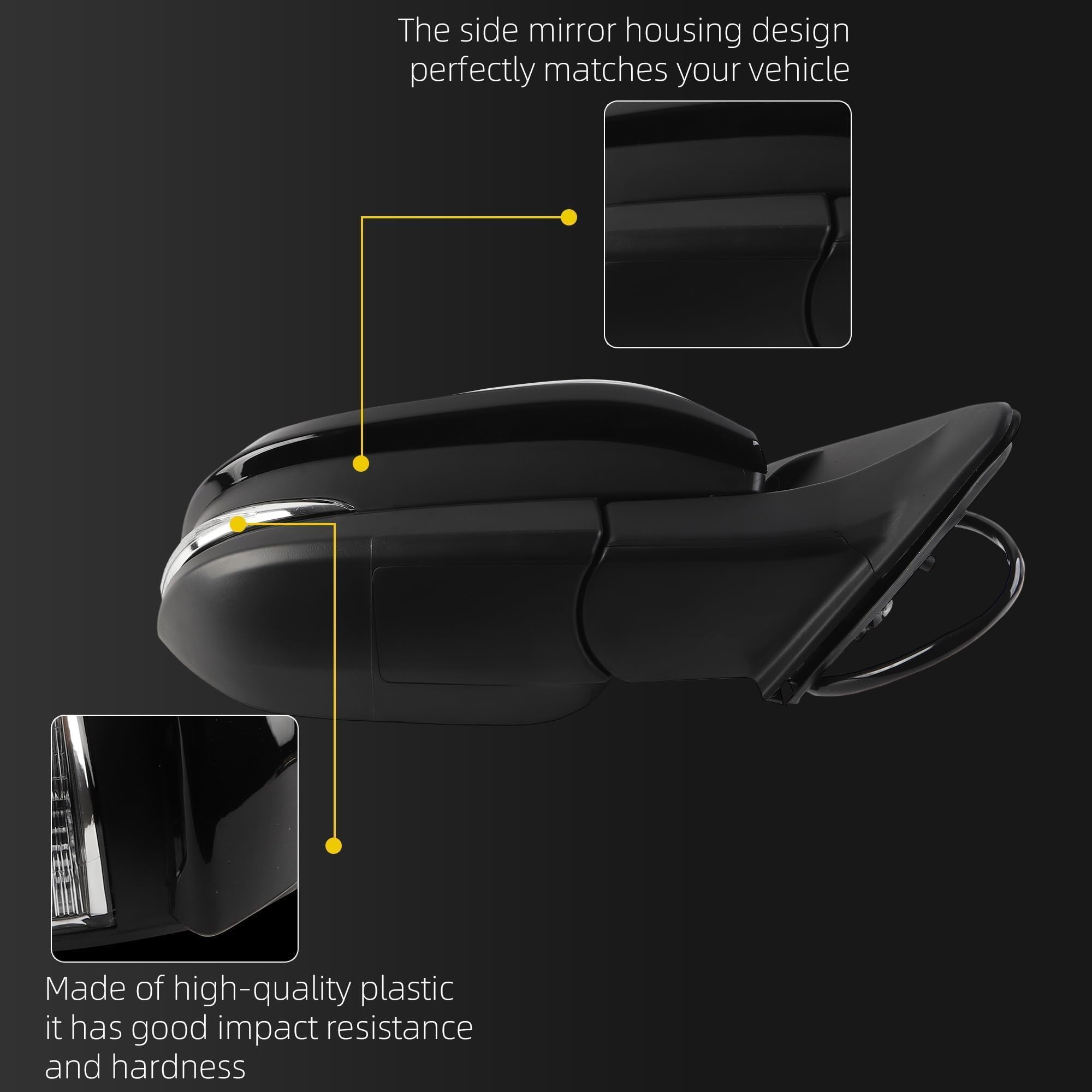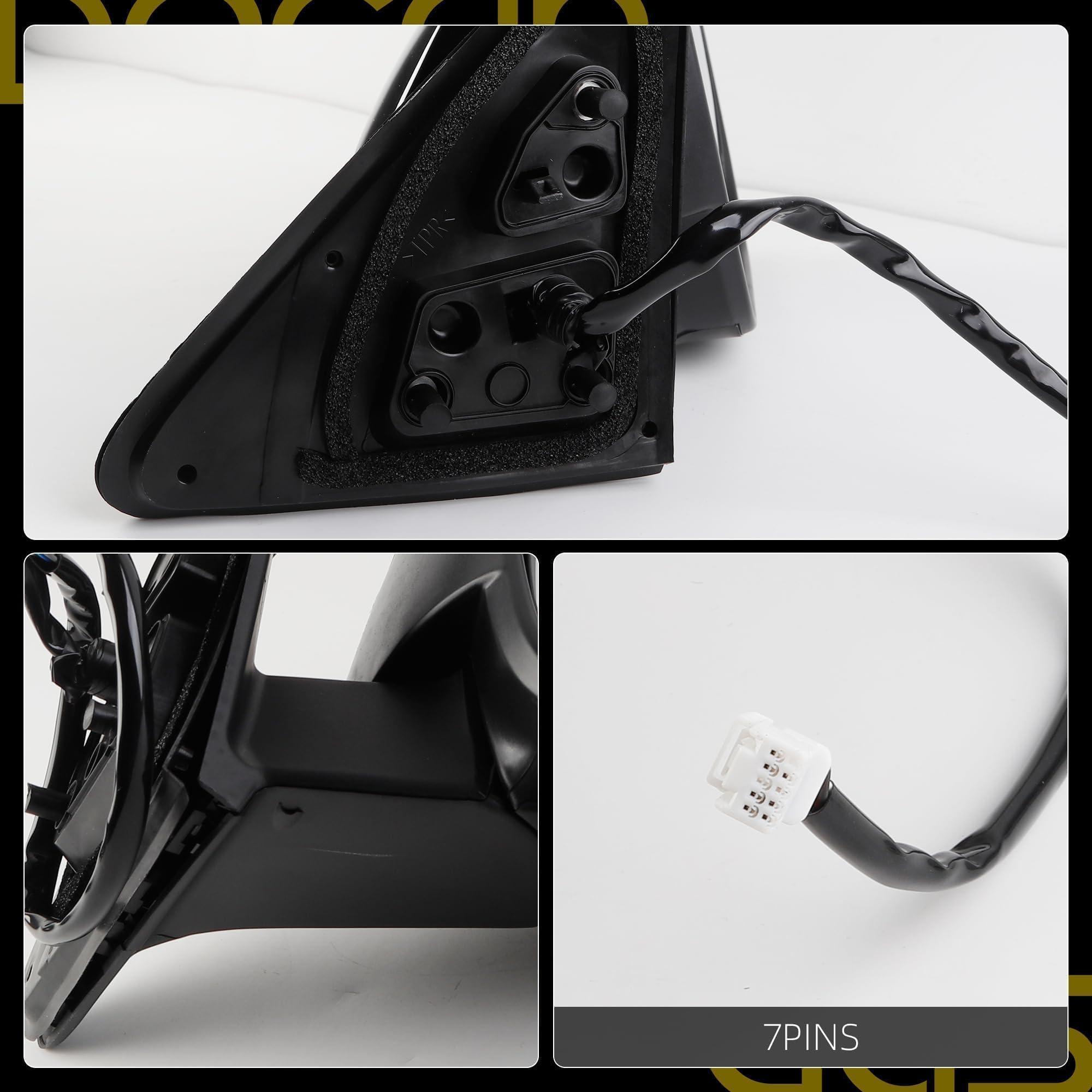 Specifications: Function: Heated丨Power Glass丨Manual Folding丨w/Turn Signal Light丨Blind Spot Detection; Position: Front Right (Passenger Side Mirror) ; Color: Paint to Black ; Number of Connector: 7 Wires/Pins.