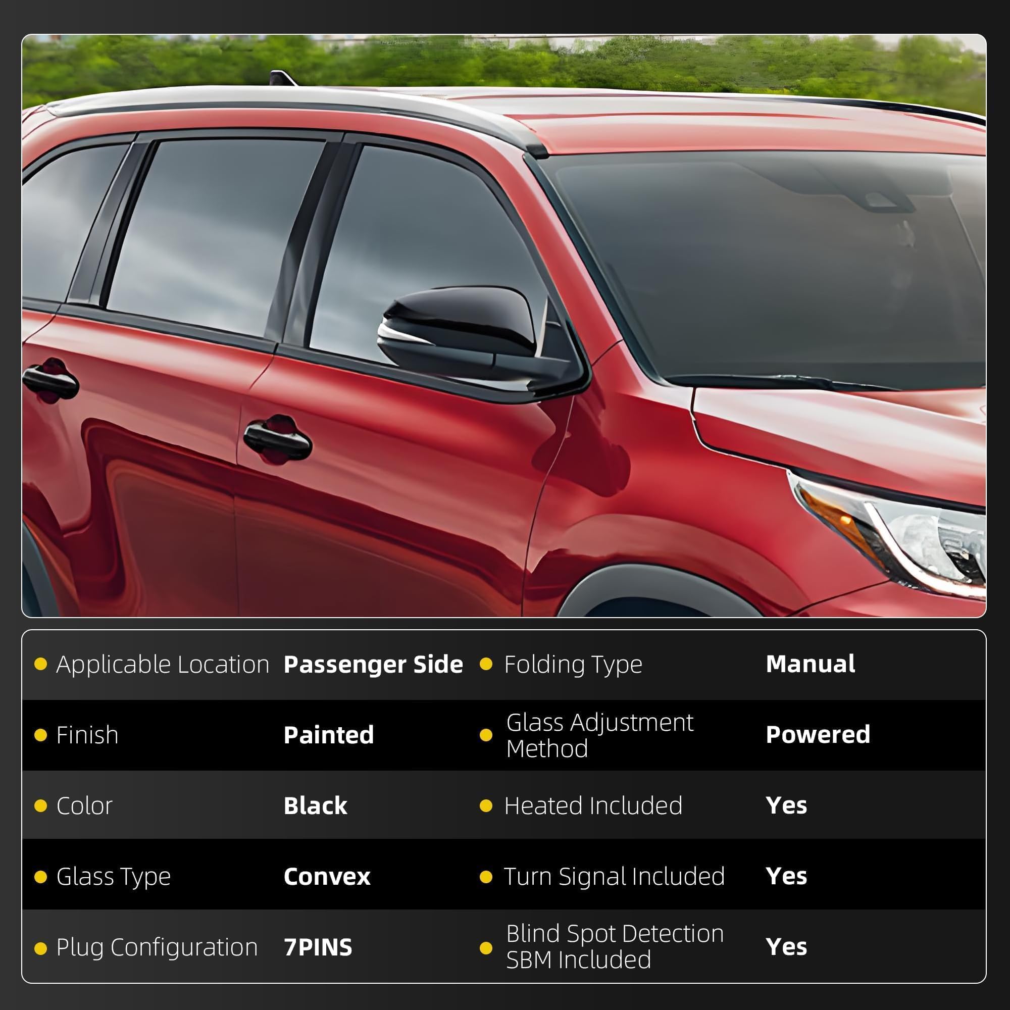 Compatible with: Compatible with 2014-2019 Toyota Highlander, 7Pins, Black, Passenger Side Mirror.